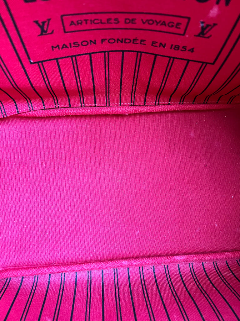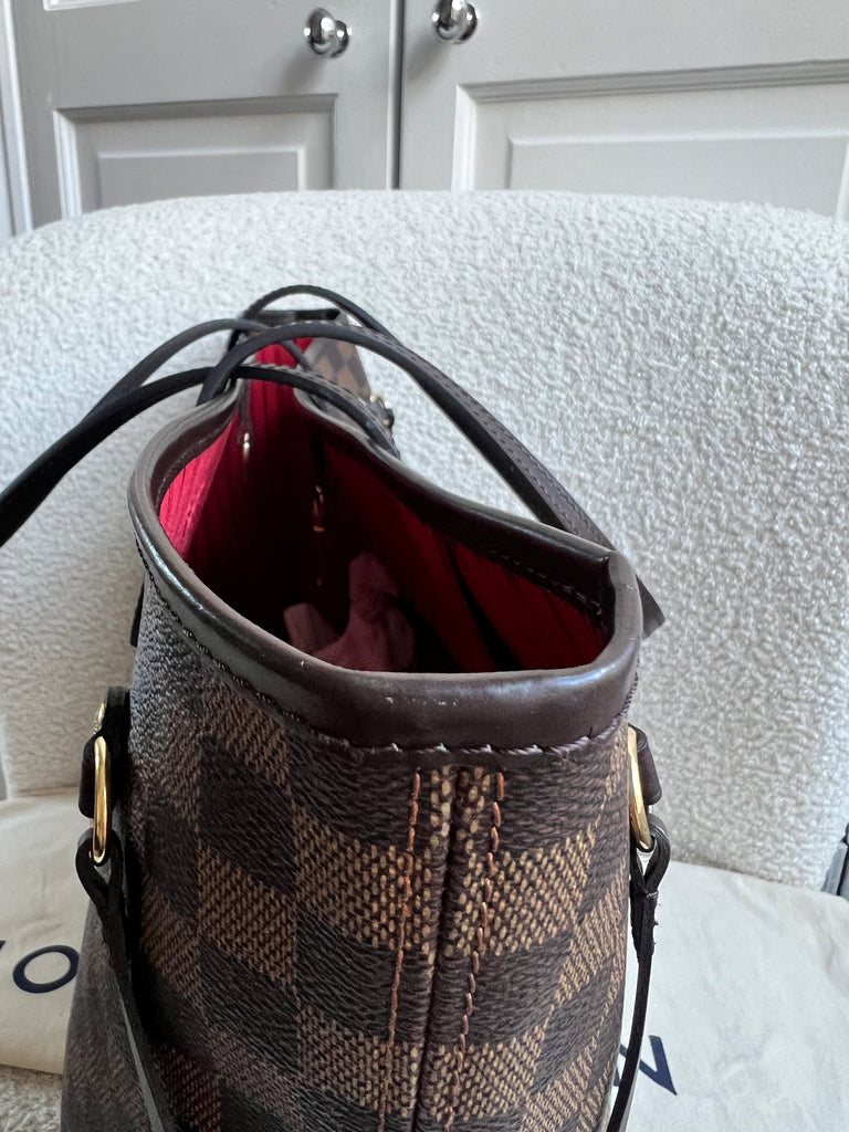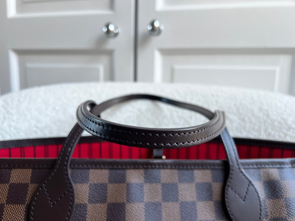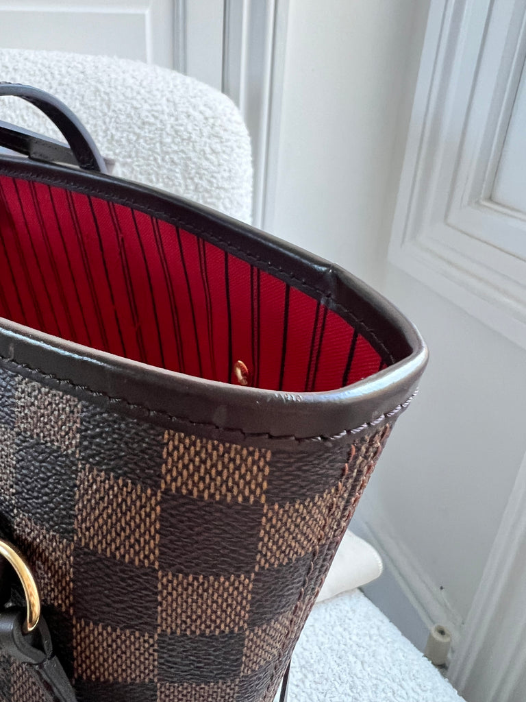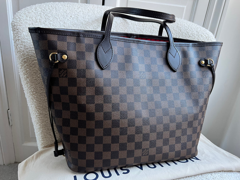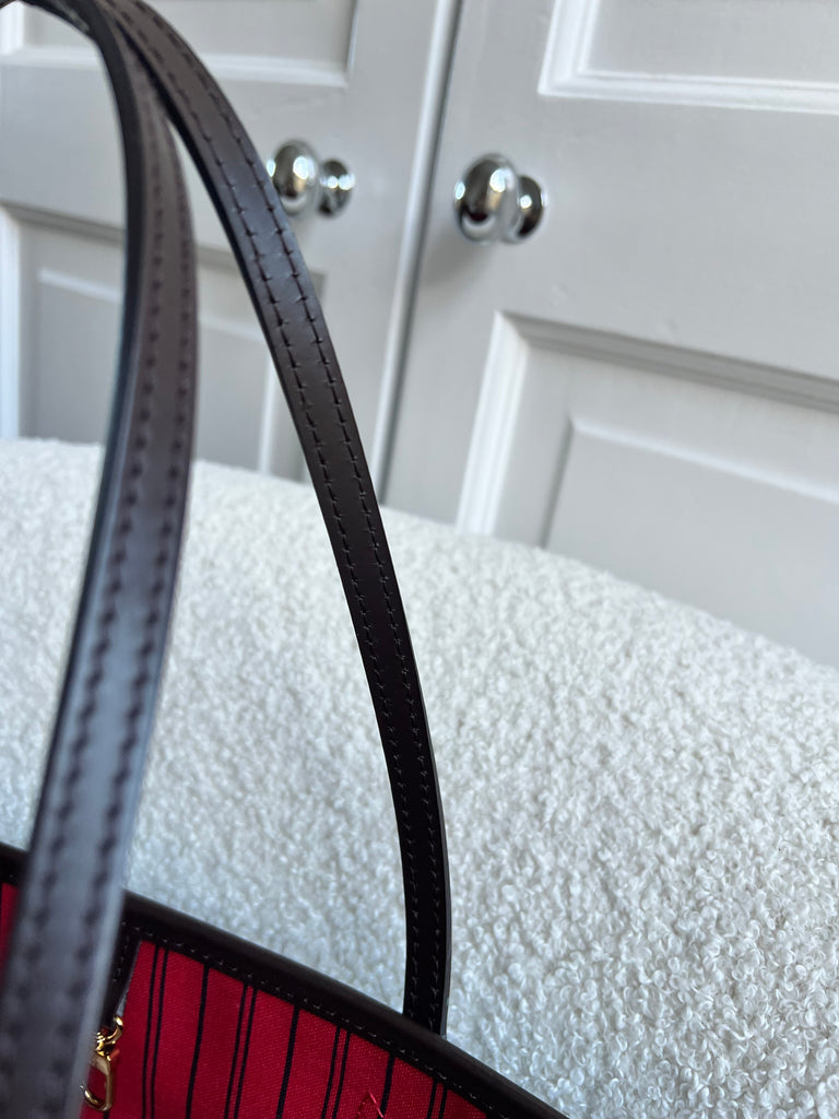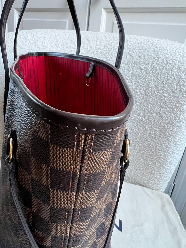 Louis Vuitton Neverfull MM in Damier Ebene with Cherry Red Lining. The "middle" size of the Neverfull, this one of Louis Vuitton's most popular style, if not the most popular. Both trendy and chic, ideal for day to day or work use especially as the coated canvas is durable and resilient. Slightly slouchy in shape, this bag can be carried in the crook of the arm or comfortably over shoulder. Note that this item does not come with the removable clutch pouch.