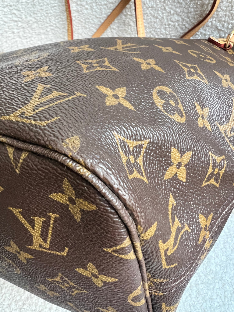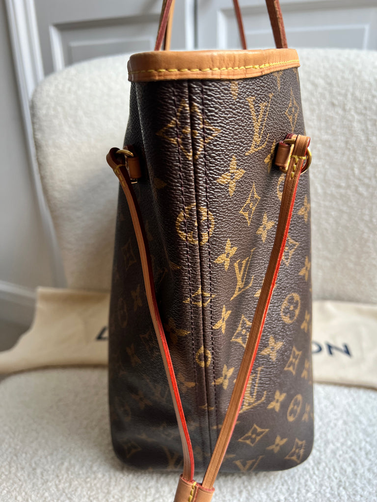 Louis Vuitton Neverfull MM in Monogram canvas with pivoine lining. The "middle" size of the Neverfull, this one of Louis Vuitton's most popular style, if not the most popular. Both trendy and chic, ideal for day to day or work use especially as the coated canvas is durable and resilient. Slightly slouchy in shape, this bag can be carried in the crook of the arm or comfortably over shoulder. Note that this item does not come with the removable clutch pouch.
