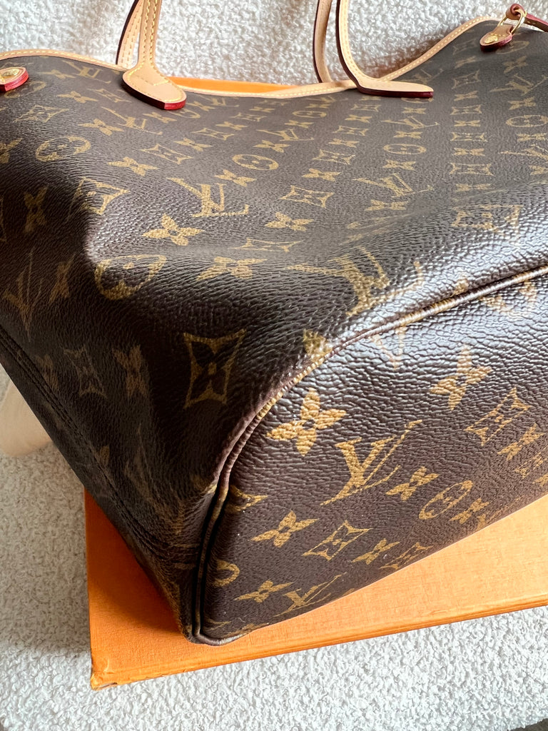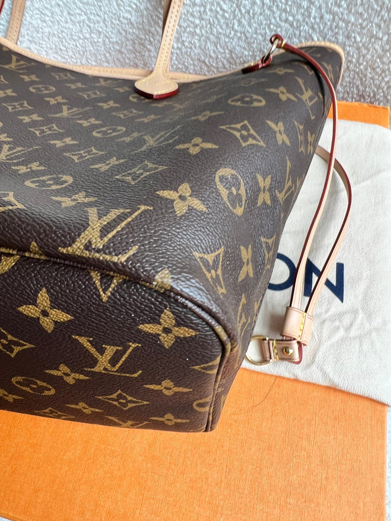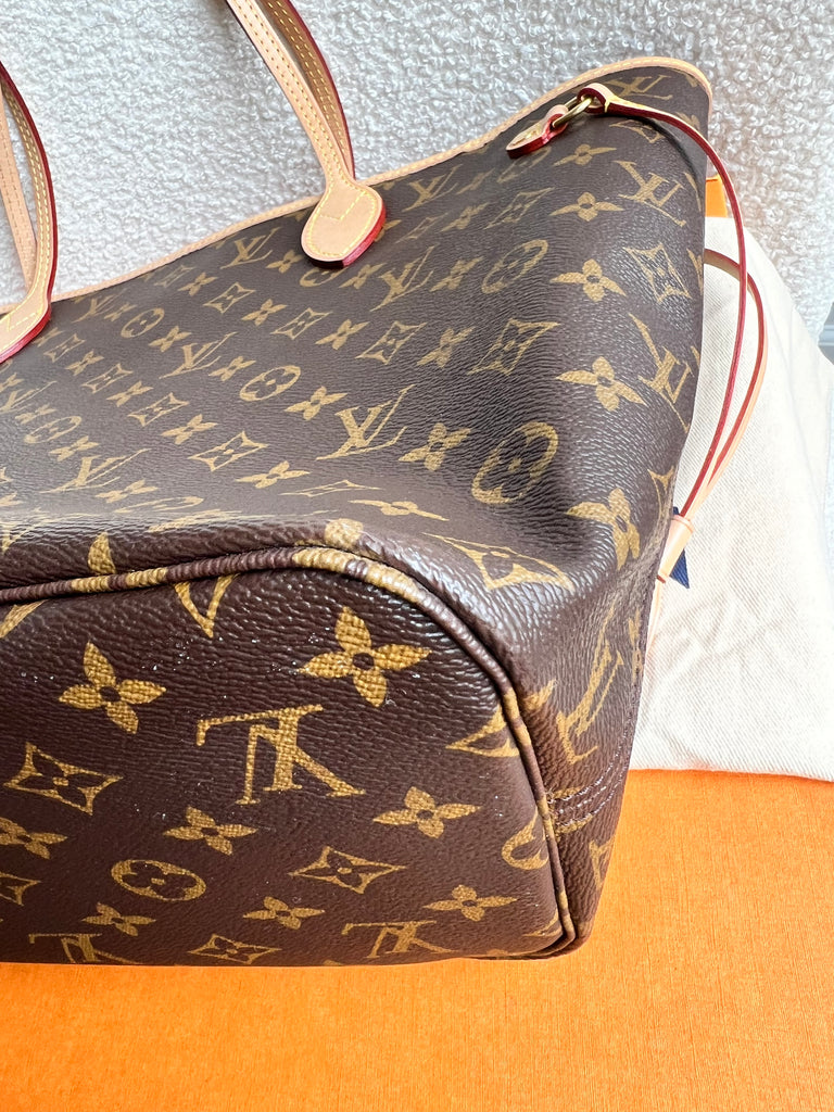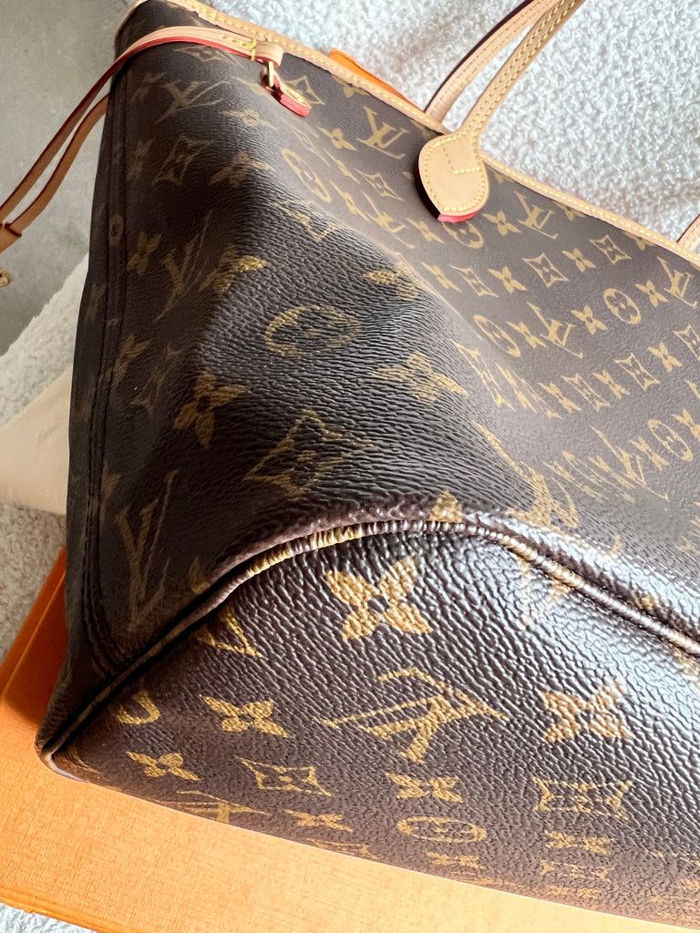 Louis Vuitton Neverfull MM in Monogram canvas with pivoine lining. The "middle" size of the Neverfull, this one of Louis Vuitton's most popular style, if not the most popular. Both trendy and chic, ideal for day to day or work use especially as the coated canvas is durable and resilient. Slightly slouchy in shape, this bag can be carried in the crook of the arm or comfortably over shoulder. Note that this item does not come with the removable clutch pouch.