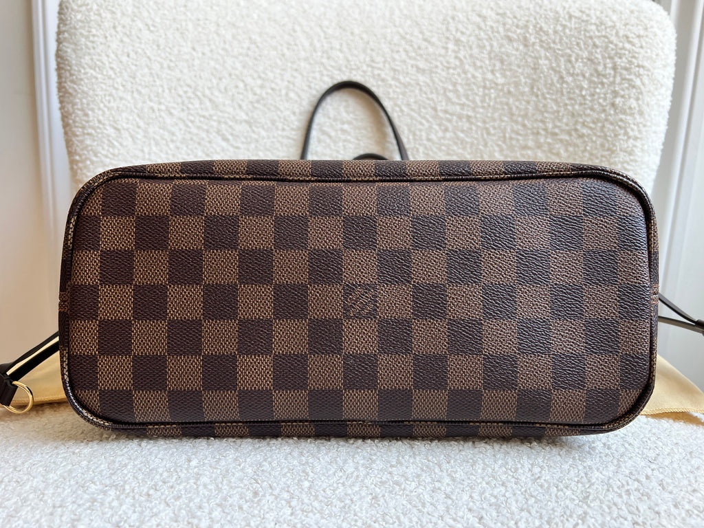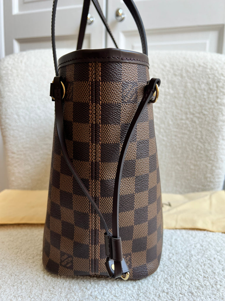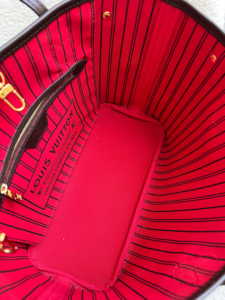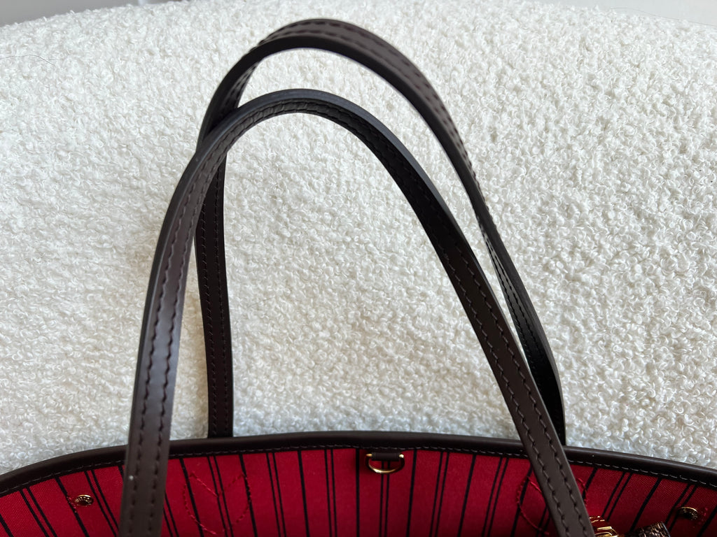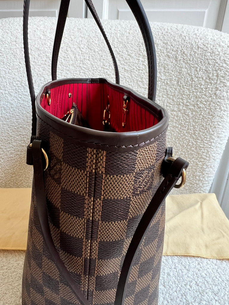 Louis Vuitton Neverfull PM in Damier Ebeen canvas with red lining. The smallest size of the Neverfull, this one of Louis Vuitton's most popular style, if not the most popular. Both trendy and chic, ideal for day to day or work use especially as the coated canvas is durable and resilient. Slightly slouchy in shape, this bag can be carried in the crook of the arm or comfortably over shoulder. Comes with removable clutch pouch.