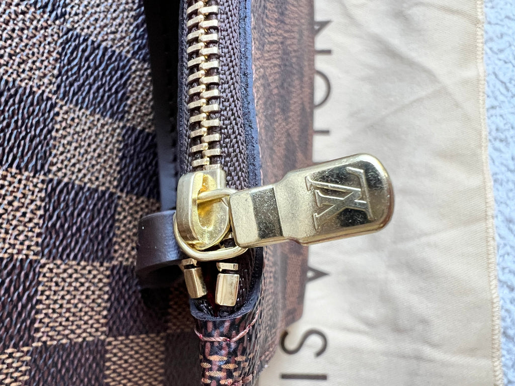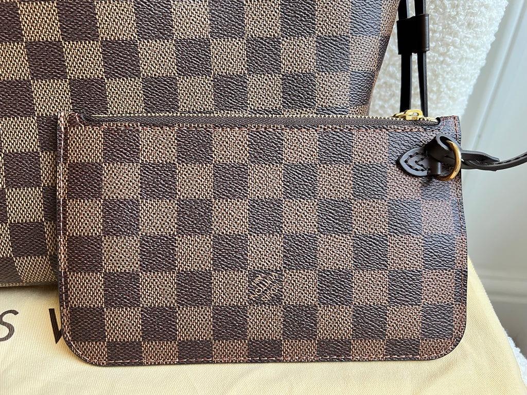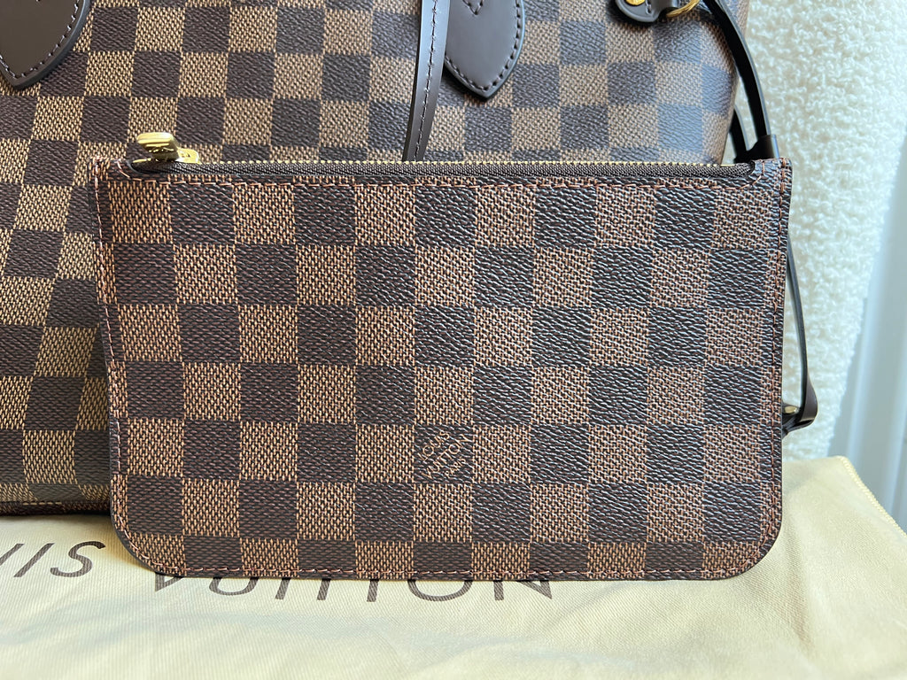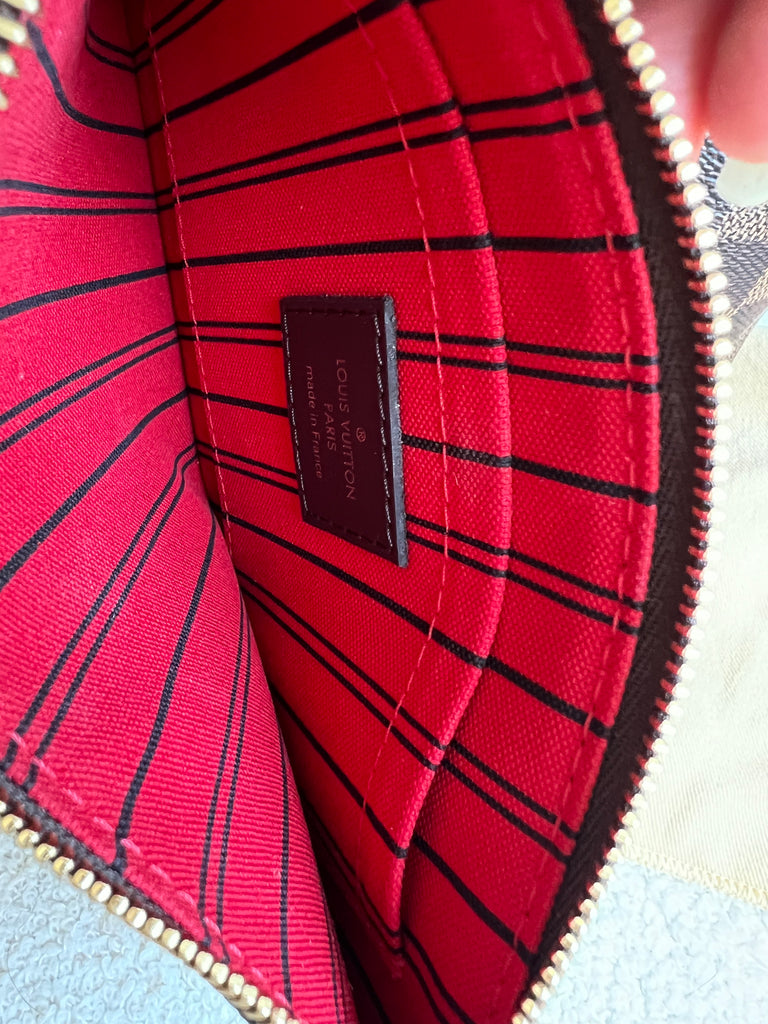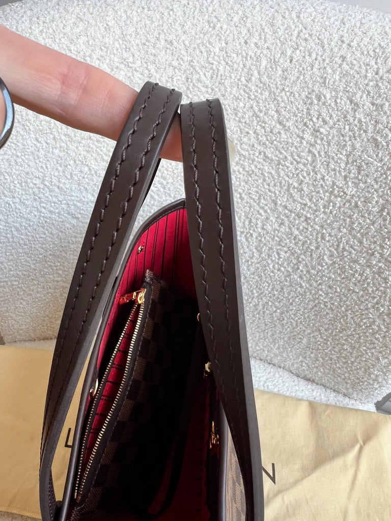 Louis Vuitton Neverfull PM in Damier Ebeen canvas with red lining. The smallest size of the Neverfull, this one of Louis Vuitton's most popular style, if not the most popular. Both trendy and chic, ideal for day to day or work use especially as the coated canvas is durable and resilient. Slightly slouchy in shape, this bag can be carried in the crook of the arm or comfortably over shoulder. Comes with removable clutch pouch.