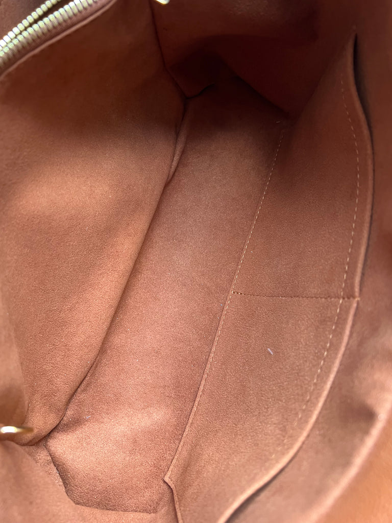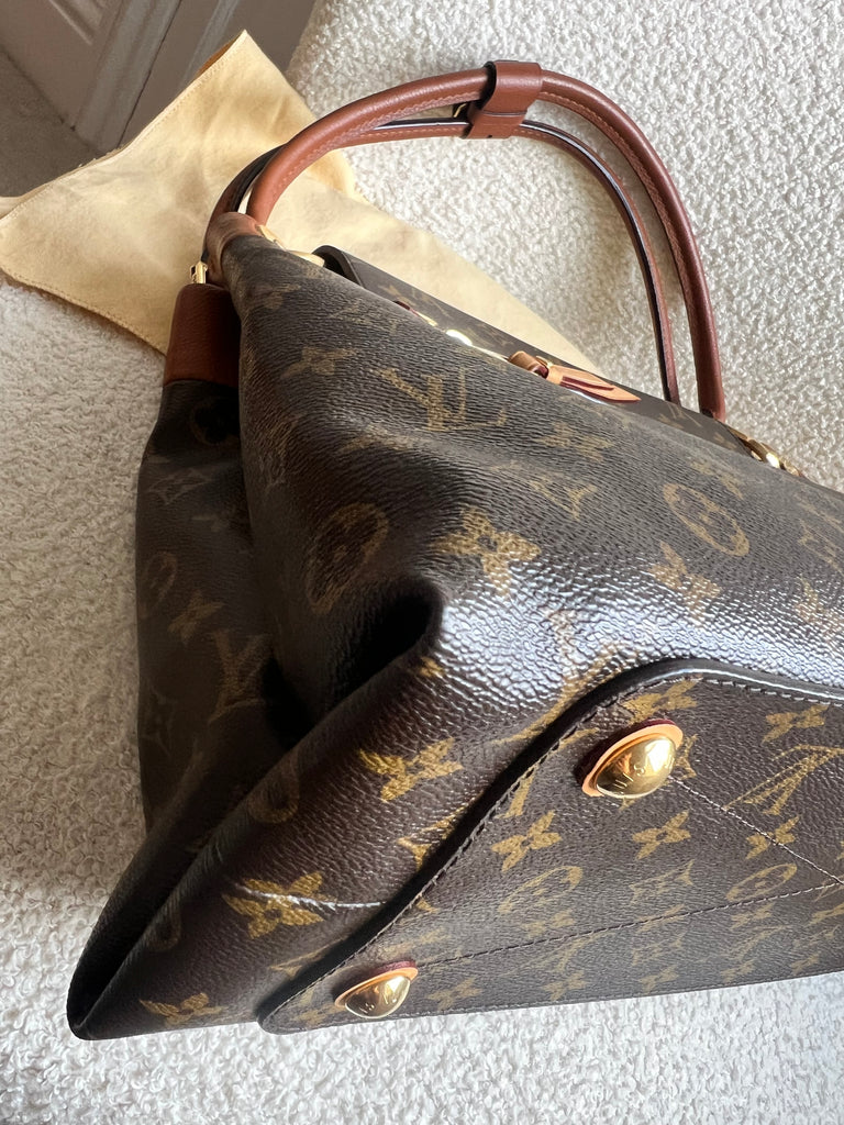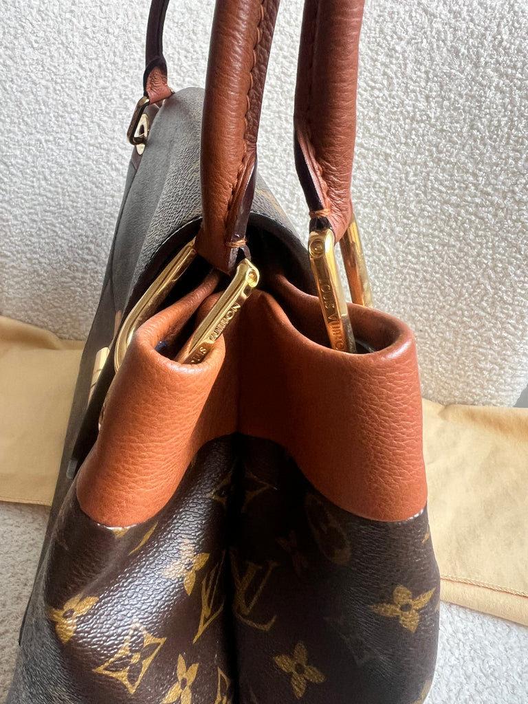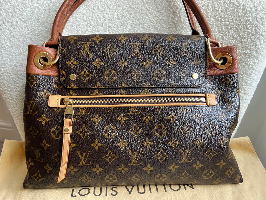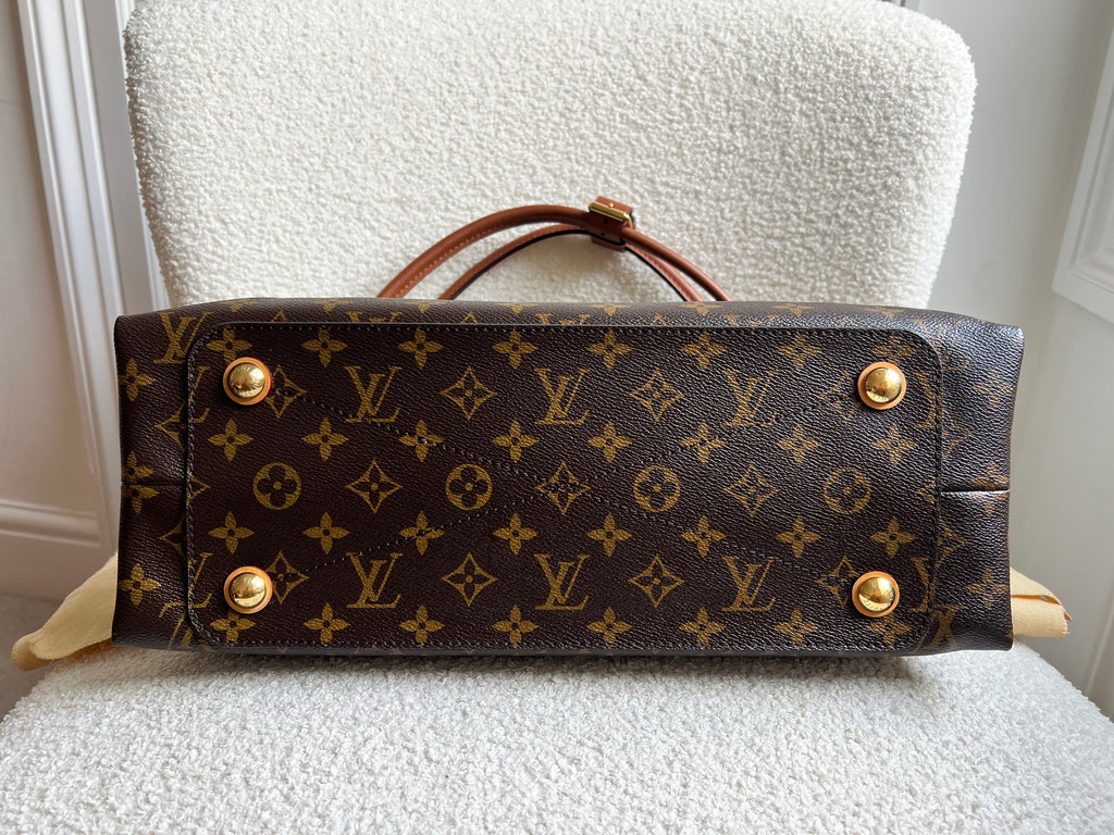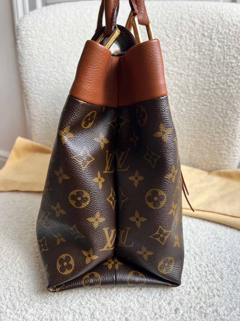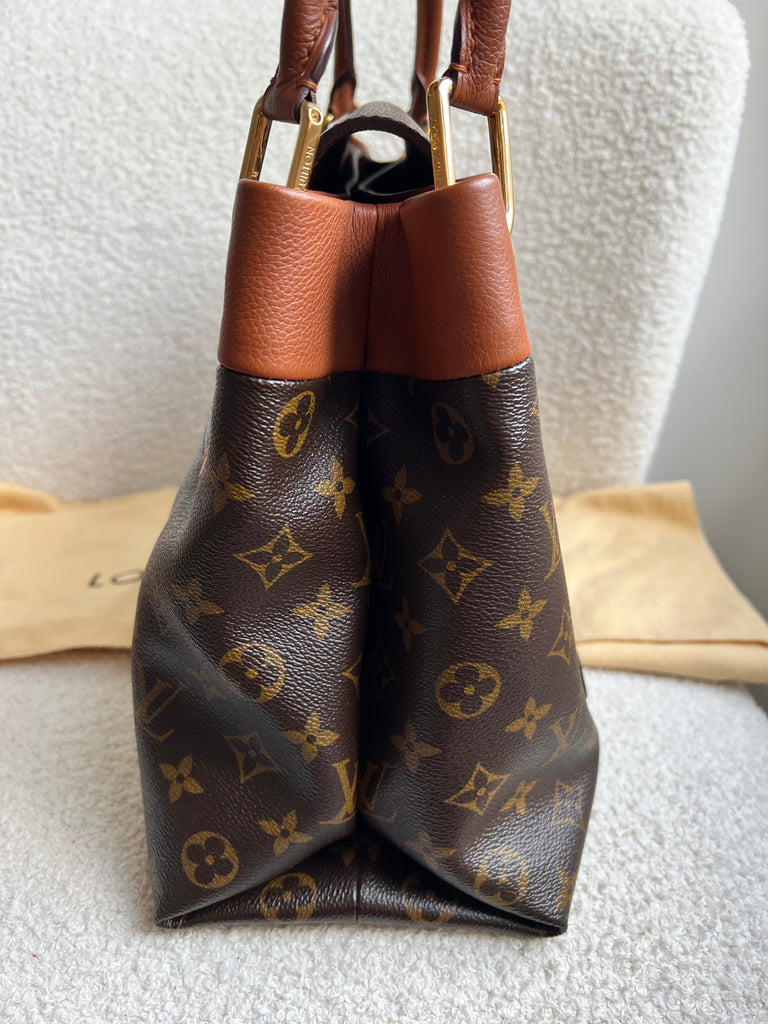 Louis Vuitton Olympe in Monogram Canvas with tan leather and gold hardware. This timeless shoulder bag was discontinued by LV a number of years ago and is highly sought after. Featuring double top handles, and clasp closure, this reasonably large bag is ideal for day to day use. Can be carried by hand, in the crook of the arm or over shoulder.
