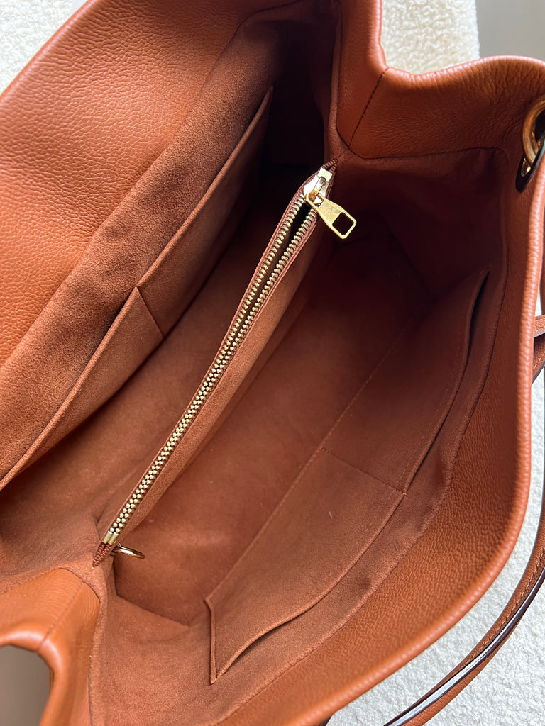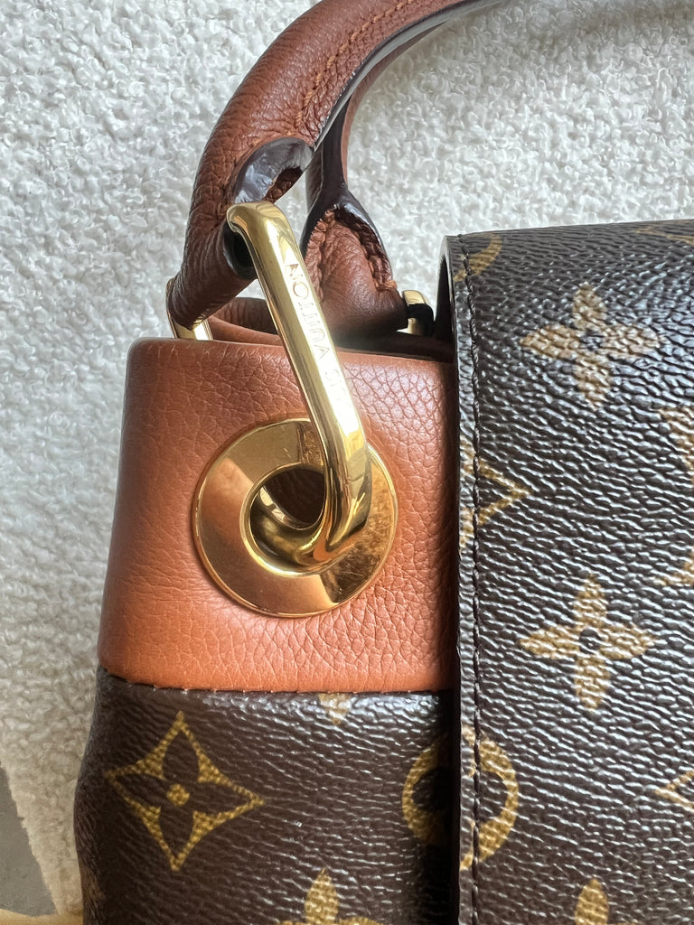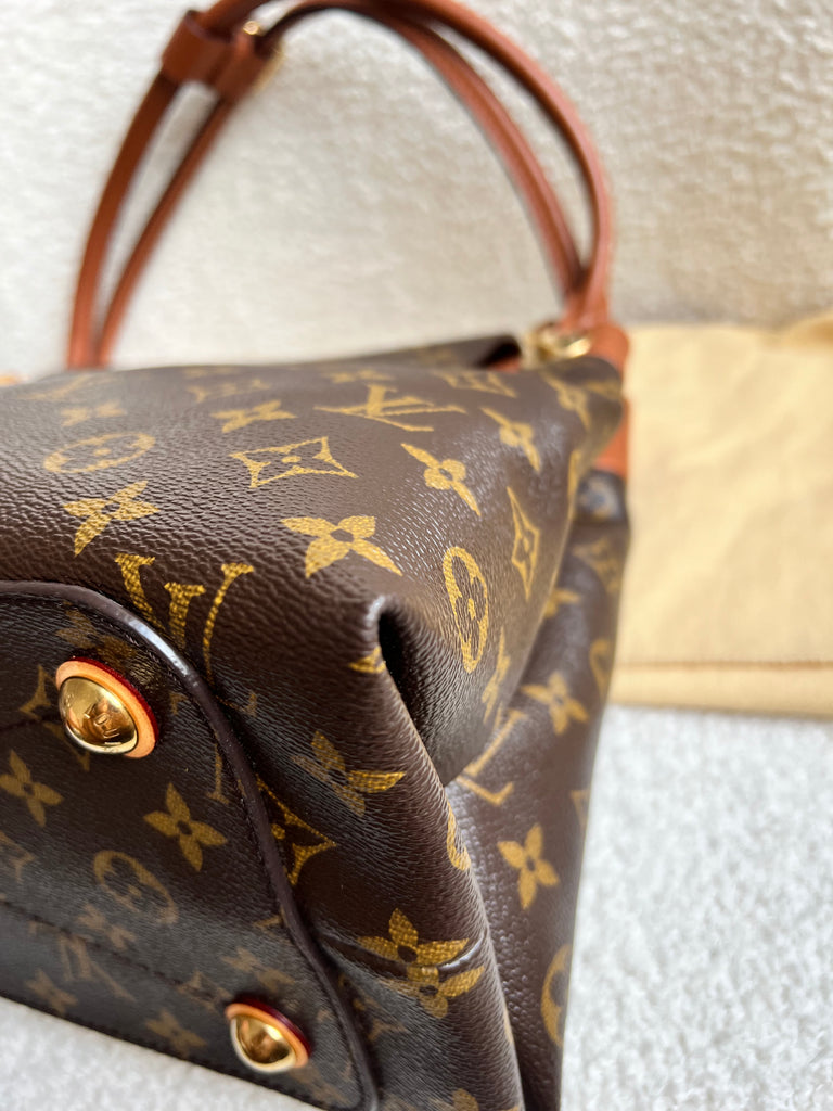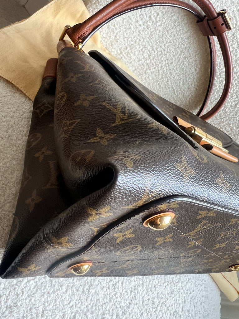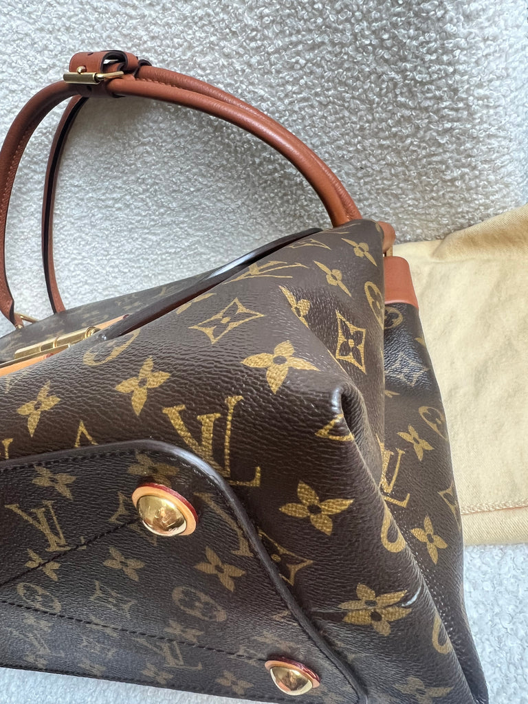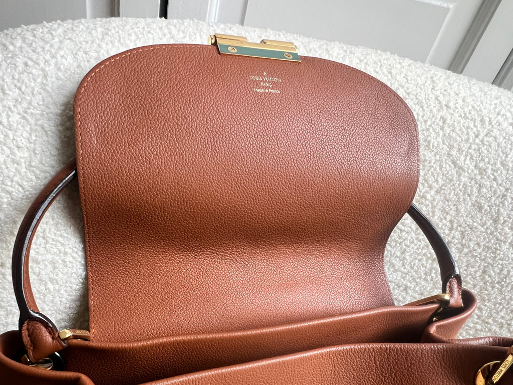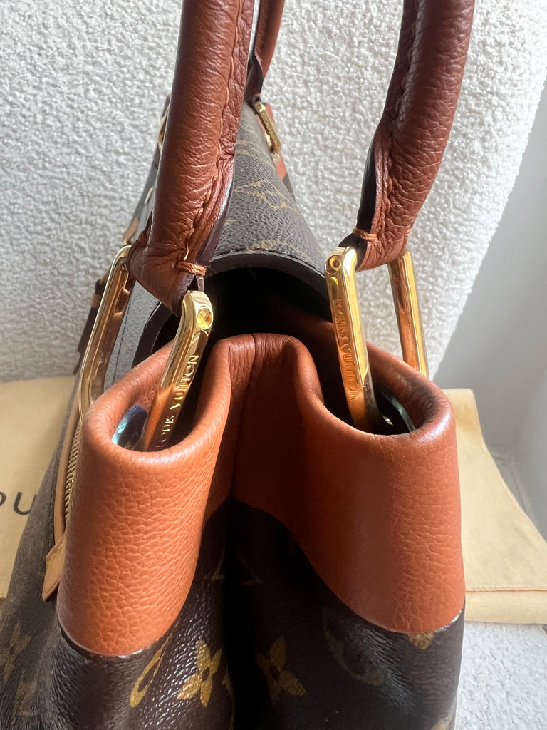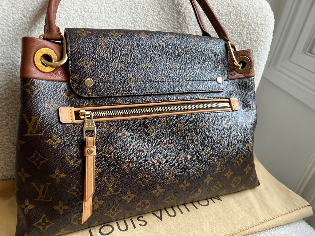 Louis Vuitton Olympe in Monogram Canvas with tan leather and gold hardware. This timeless shoulder bag was discontinued by LV a number of years ago and is highly sought after. Featuring double top handles, and clasp closure, this reasonably large bag is ideal for day to day use. Can be carried by hand, in the crook of the arm or over shoulder.
