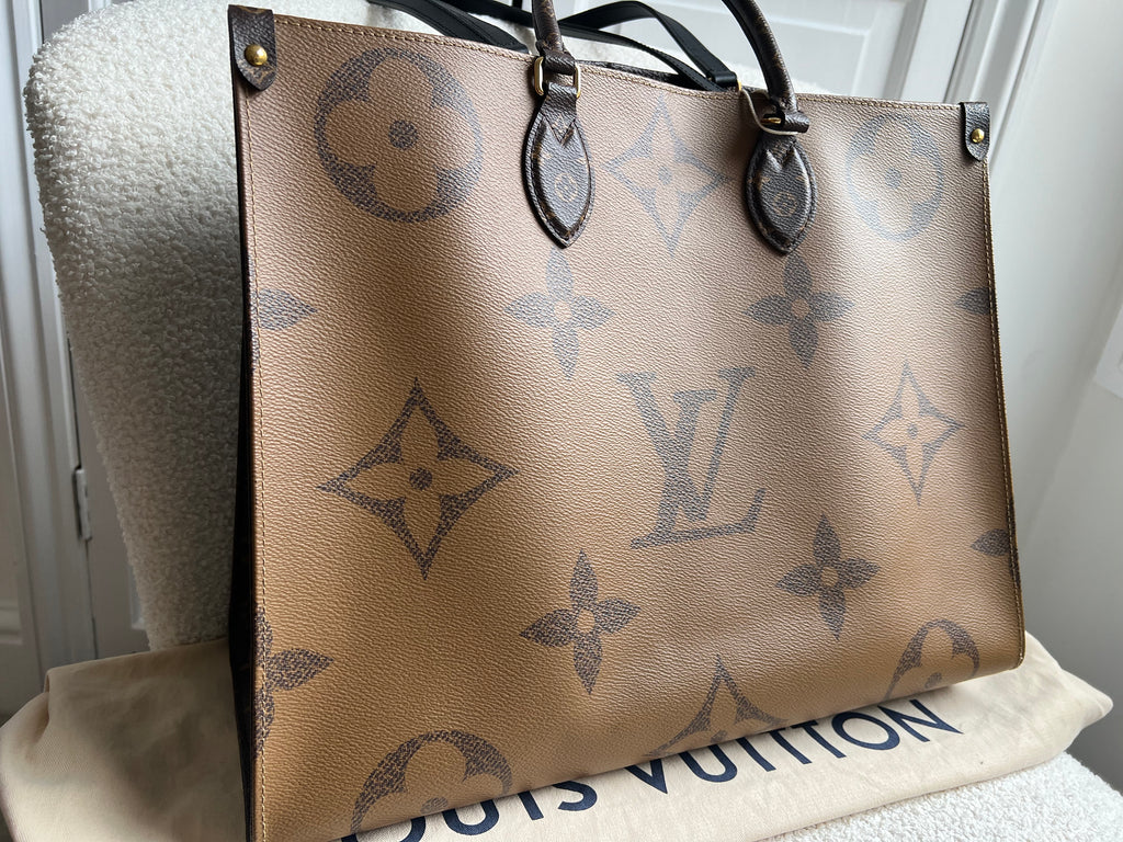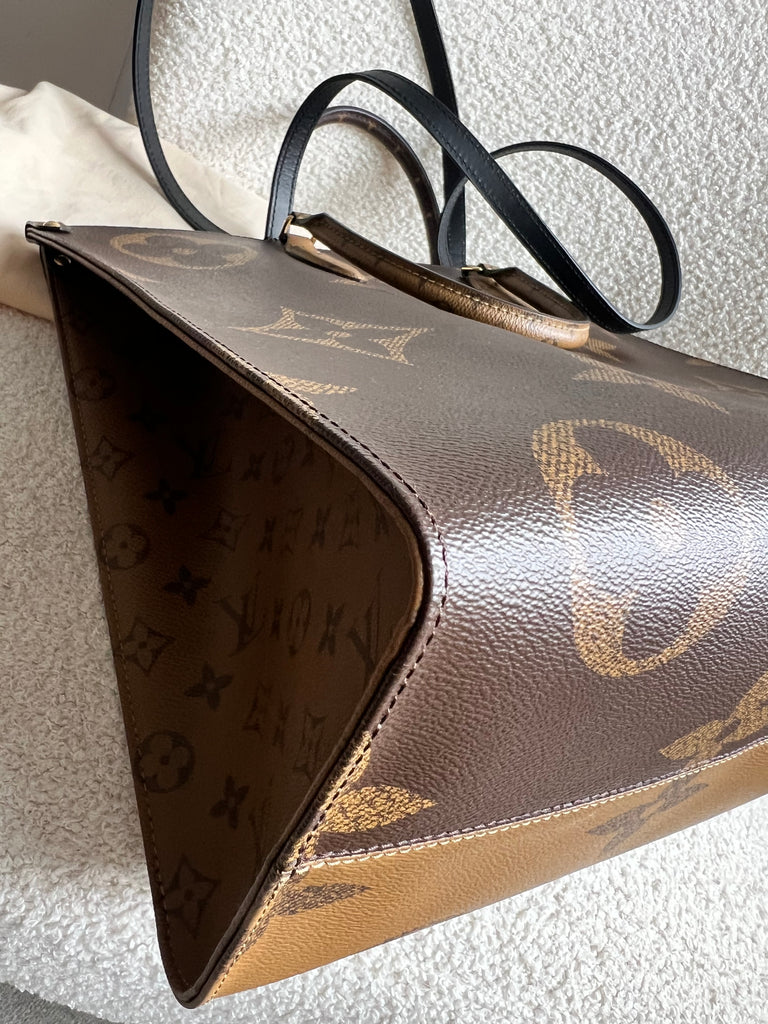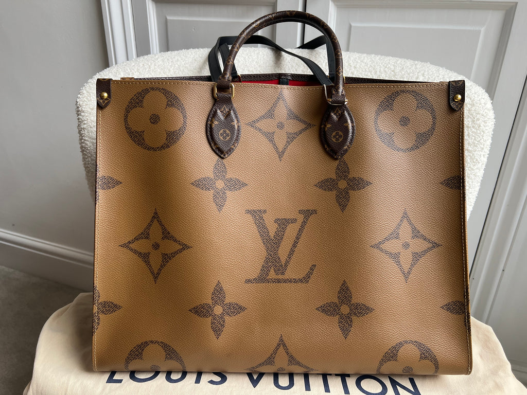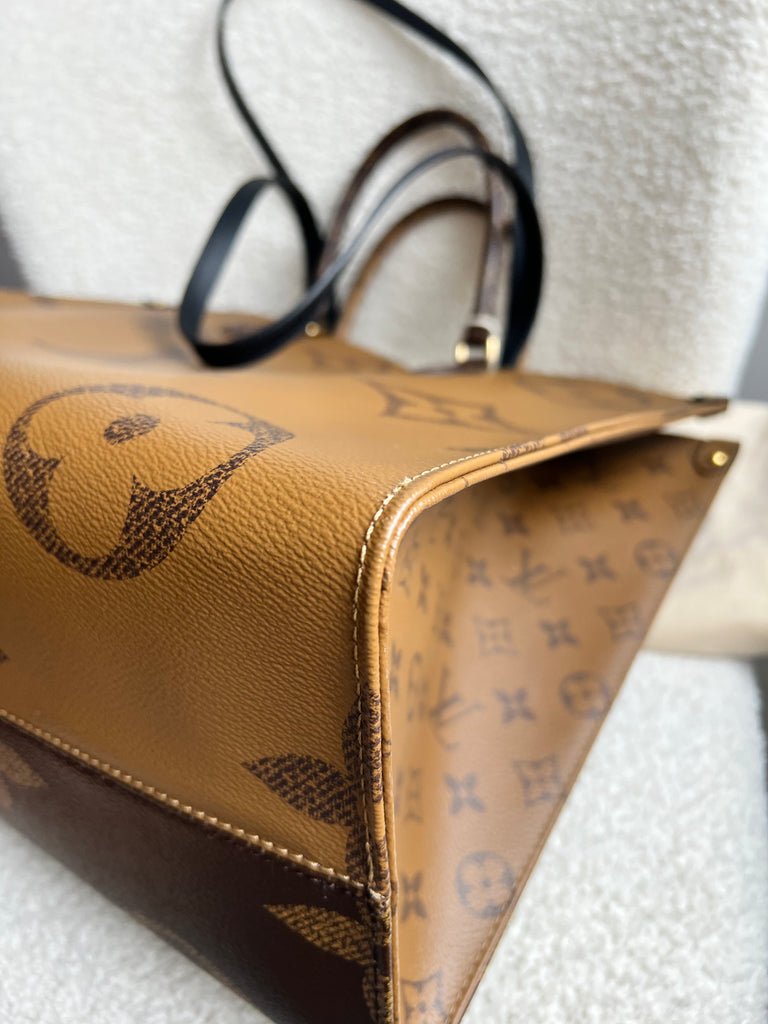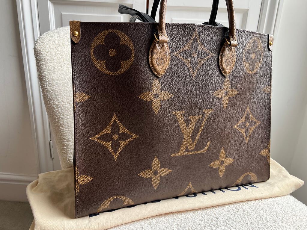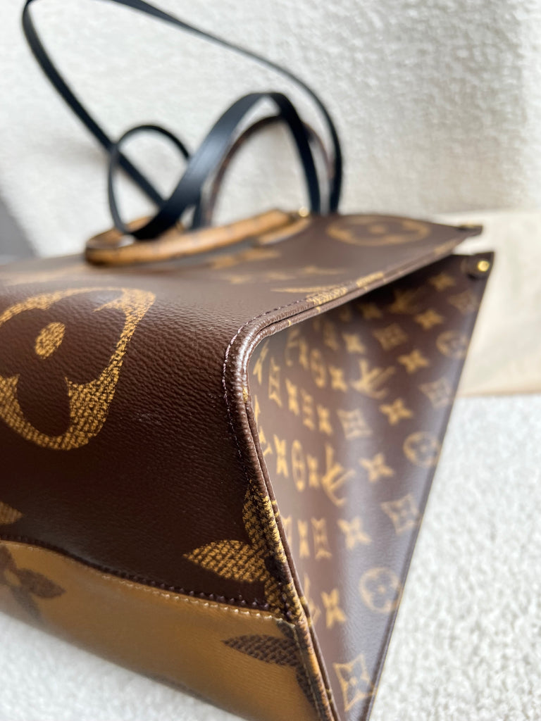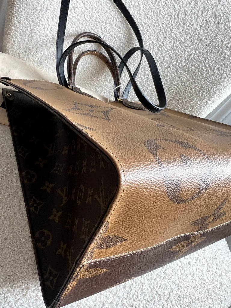 Louis Vuitton On The Go GM in Giant Monogram Canvas with gold hardware. Fashioned from Monogram Giant canvas, the Onthego tote bag is as striking as it is practical. A Monogram Reverse pattern on the sides and handles creates a stylish contrast in colour and scale. With its generous capacity, shoulder straps and iconic Toron top handles, this versatile GM model is an ideal bag for everyday wear.