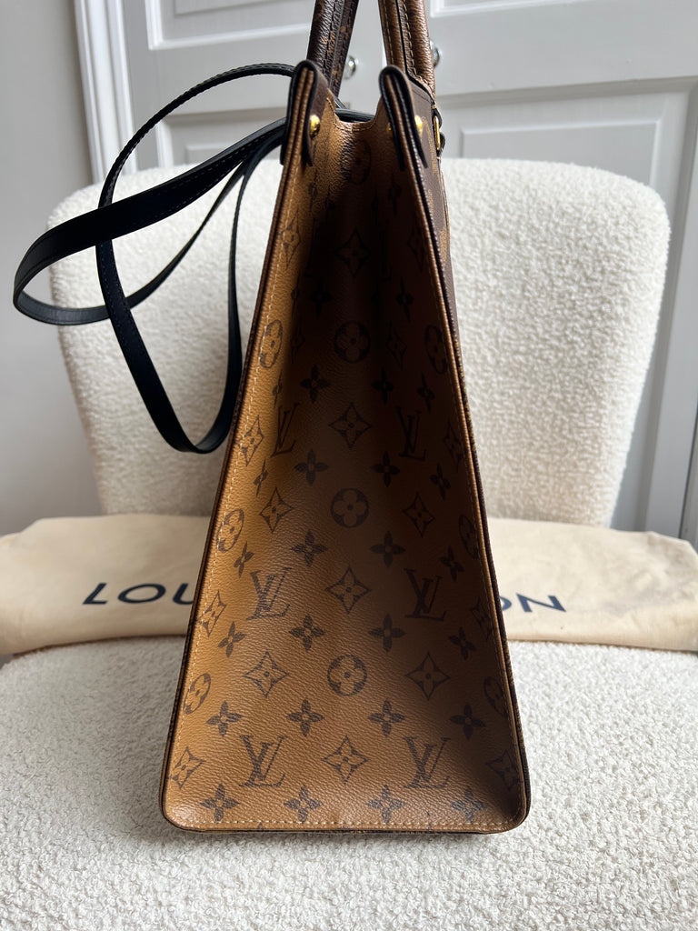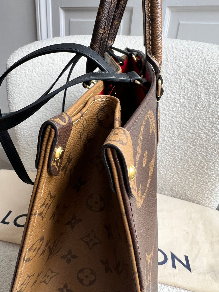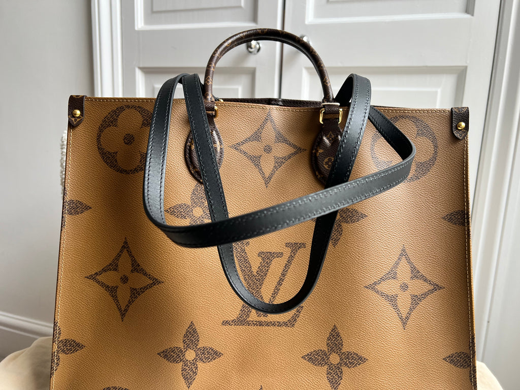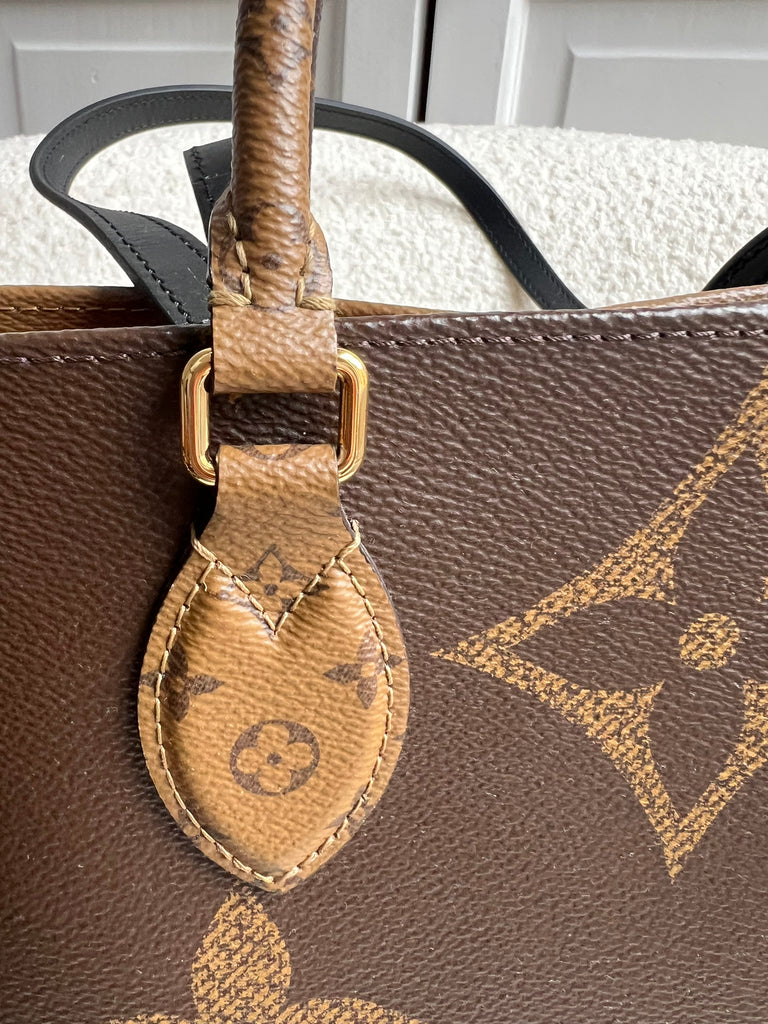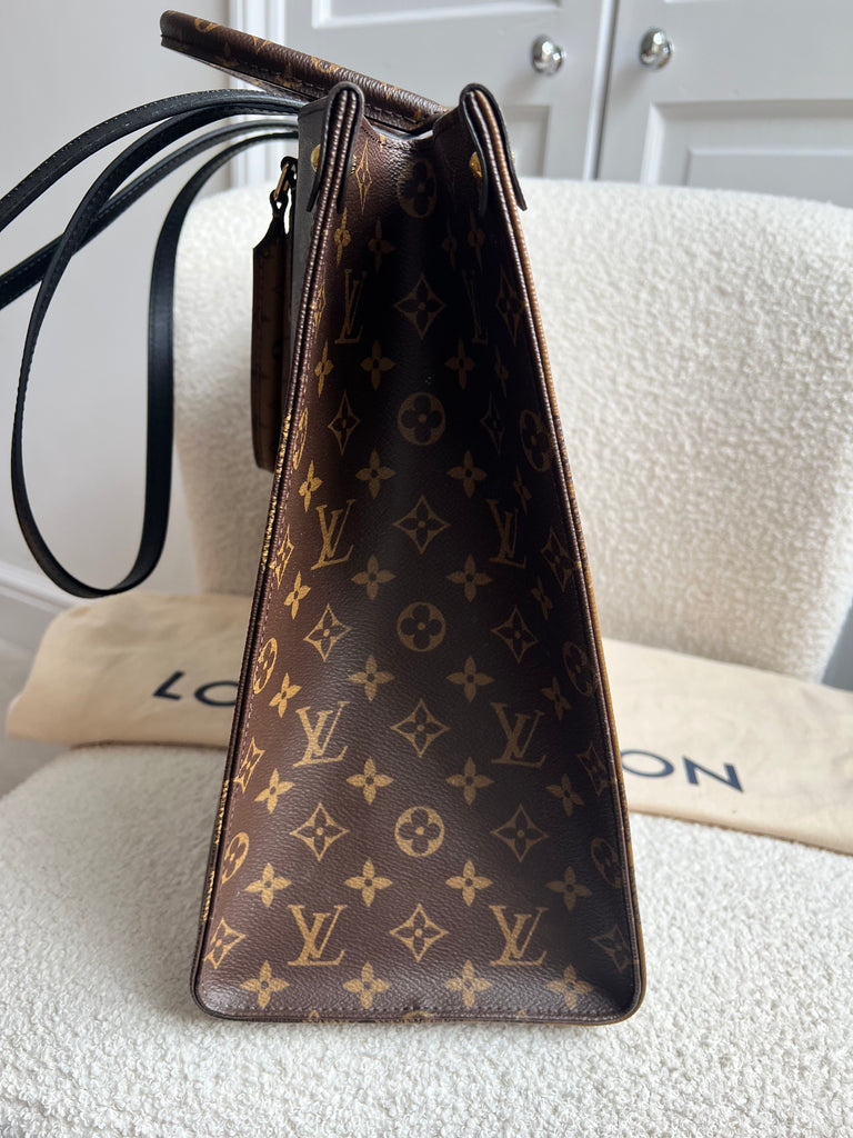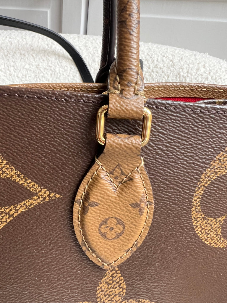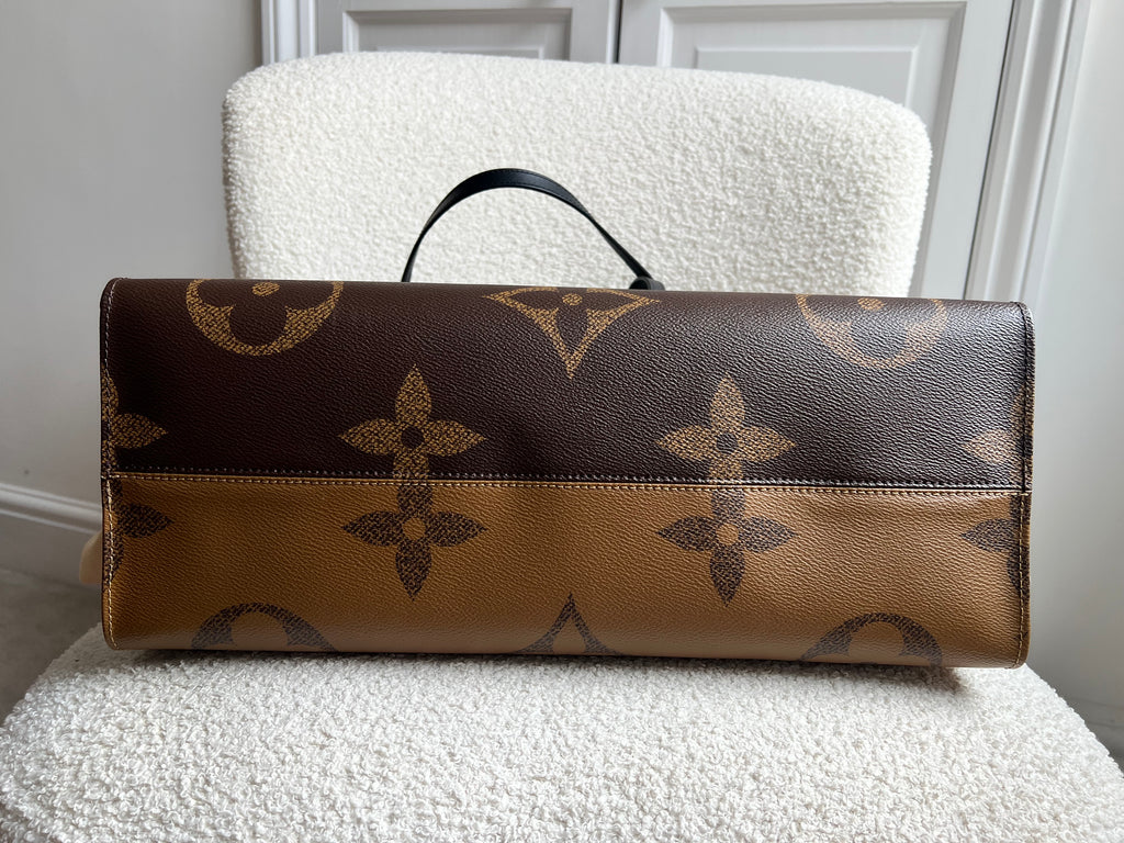 Louis Vuitton On The Go GM in Giant Monogram Canvas with gold hardware. Fashioned from Monogram Giant canvas, the Onthego tote bag is as striking as it is practical. A Monogram Reverse pattern on the sides and handles creates a stylish contrast in colour and scale. With its generous capacity, shoulder straps and iconic Toron top handles, this versatile GM model is an ideal bag for everyday wear.
