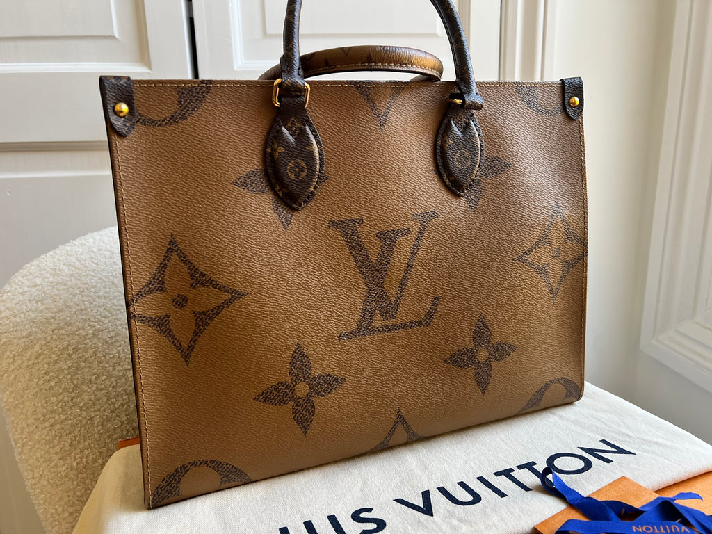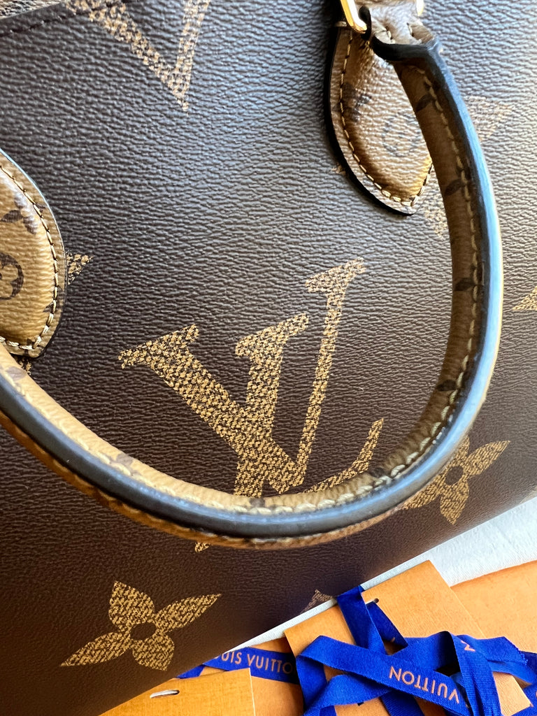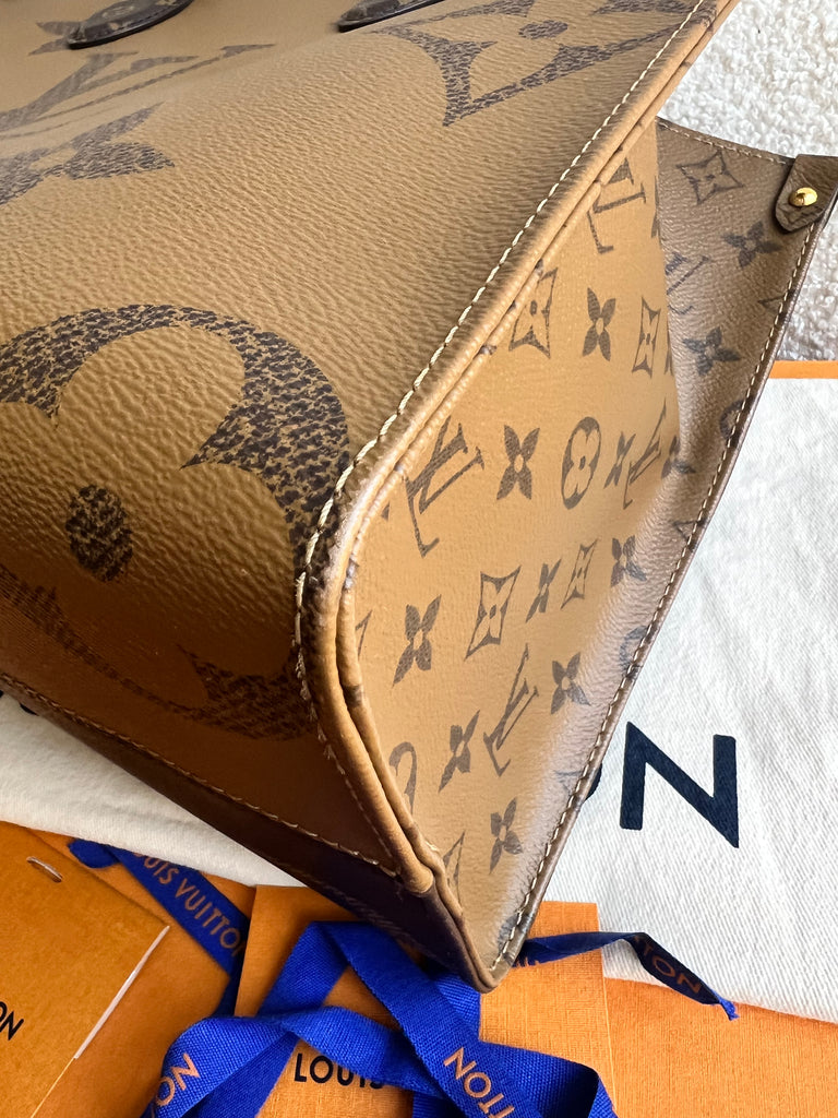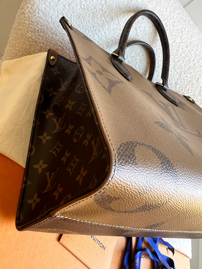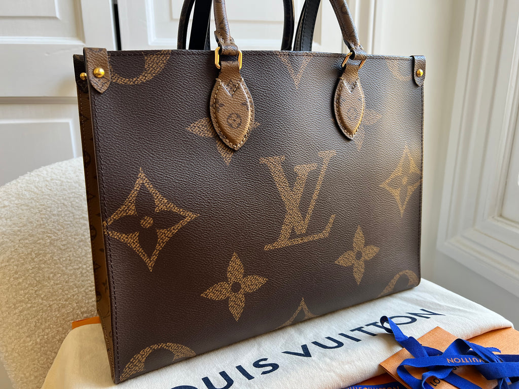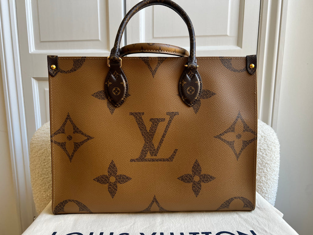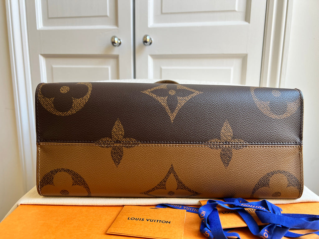 Louis Vuitton On The Go MM in Giant Monogram Canvas with gold hardware. Fashioned from Monogram Giant canvas, the Onthego tote bag is as striking as it is practical. A Monogram Reverse pattern on the sides and handles creates a stylish contrast in colour and scale. With its fairly large capacity, shoulder straps and iconic Toron top handles, this versatile MM model is an ideal bag for everyday wear. 2022 year.