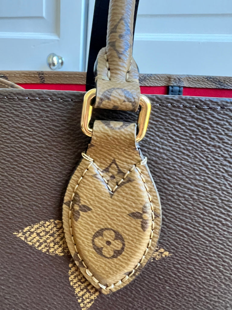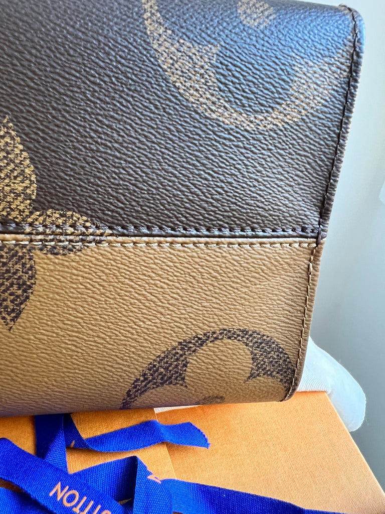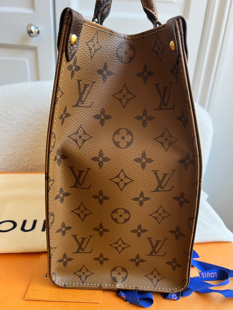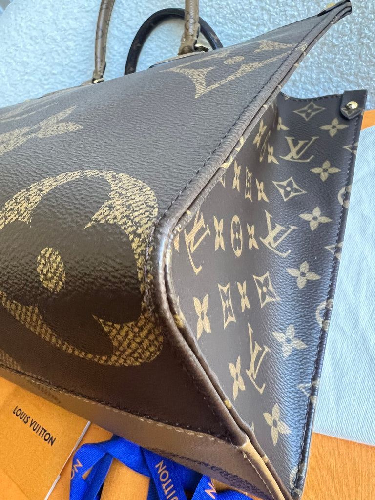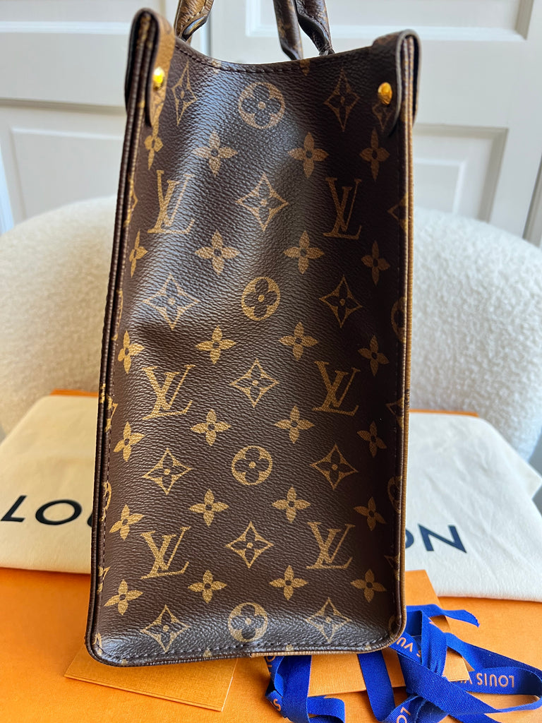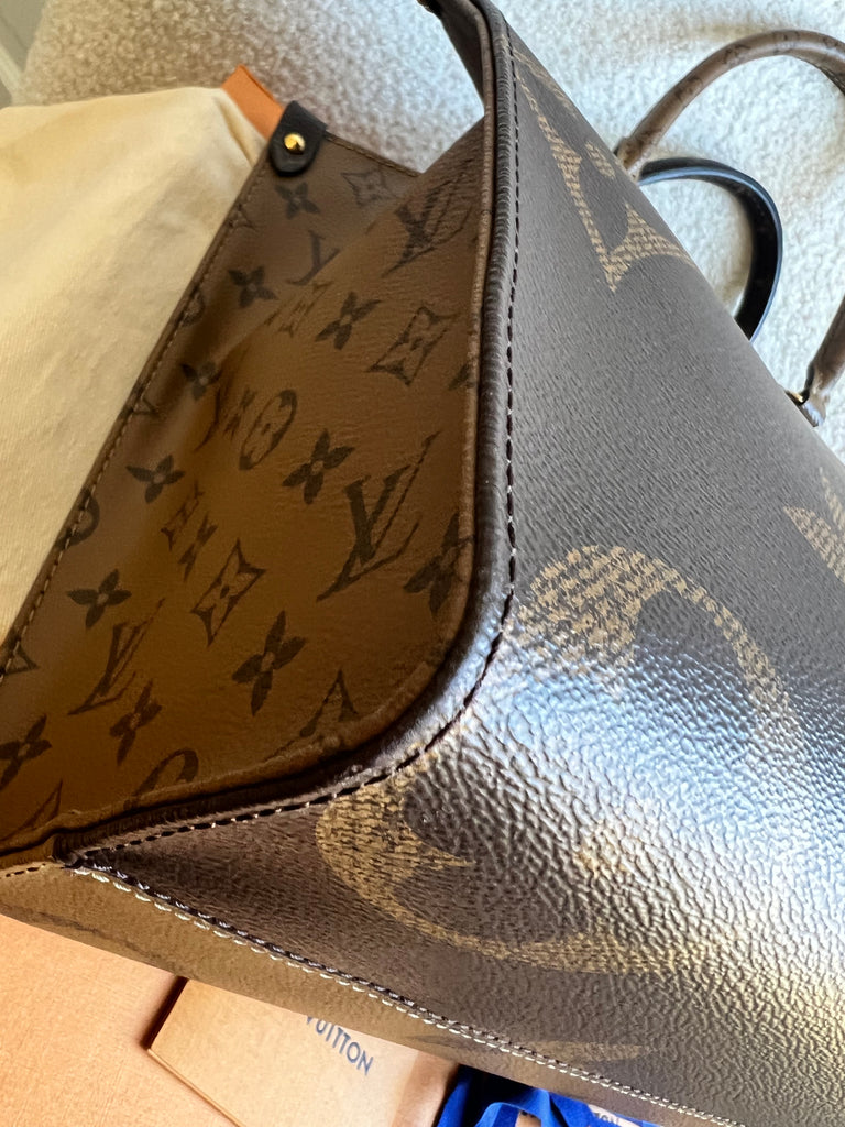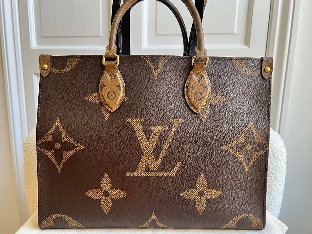 Louis Vuitton On The Go MM in Giant Monogram Canvas with gold hardware. Fashioned from Monogram Giant canvas, the Onthego tote bag is as striking as it is practical. A Monogram Reverse pattern on the sides and handles creates a stylish contrast in colour and scale. With its fairly large capacity, shoulder straps and iconic Toron top handles, this versatile MM model is an ideal bag for everyday wear. 2022 year.