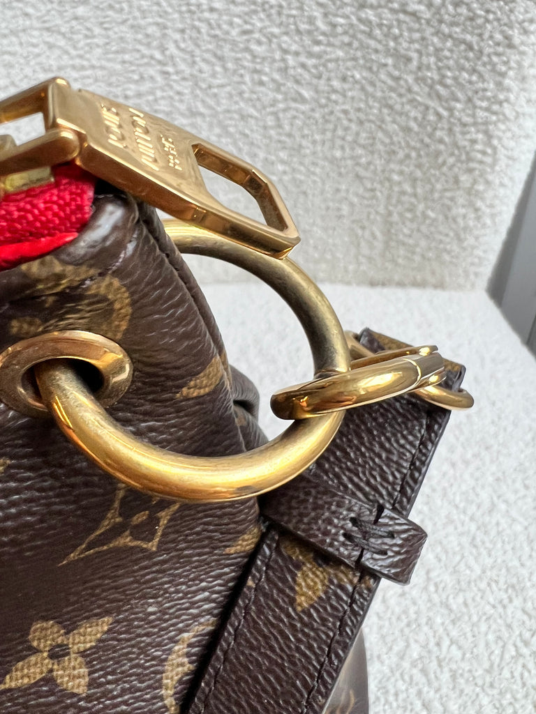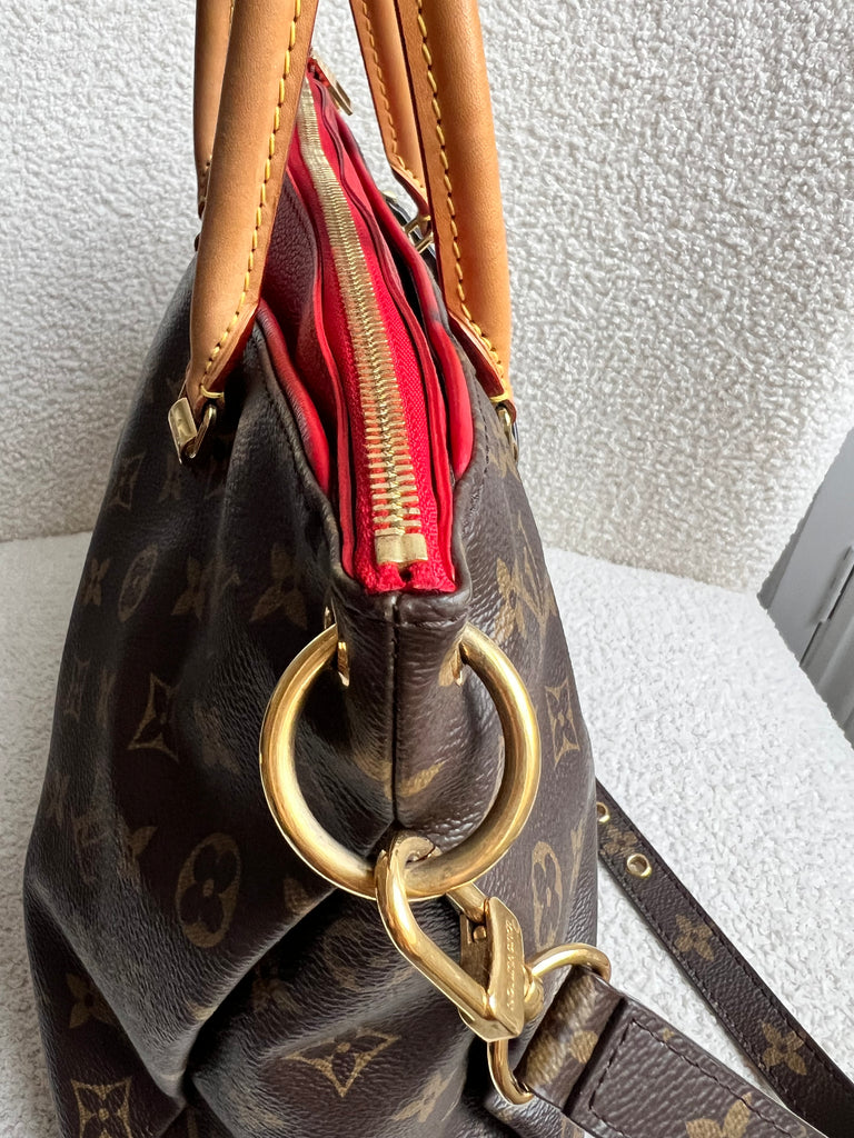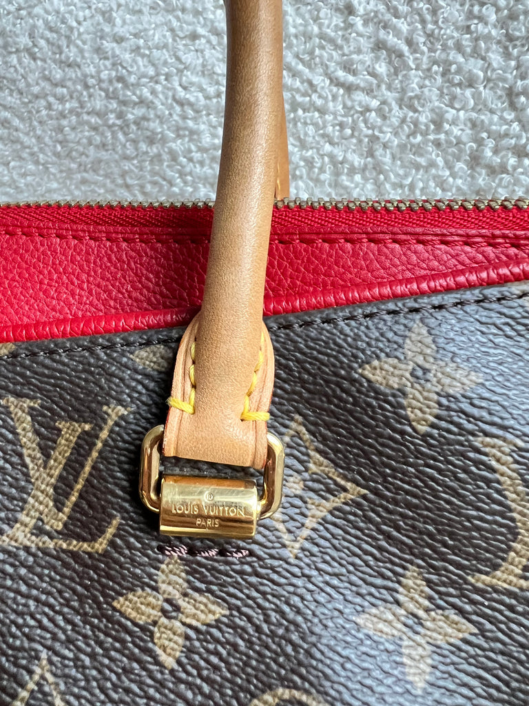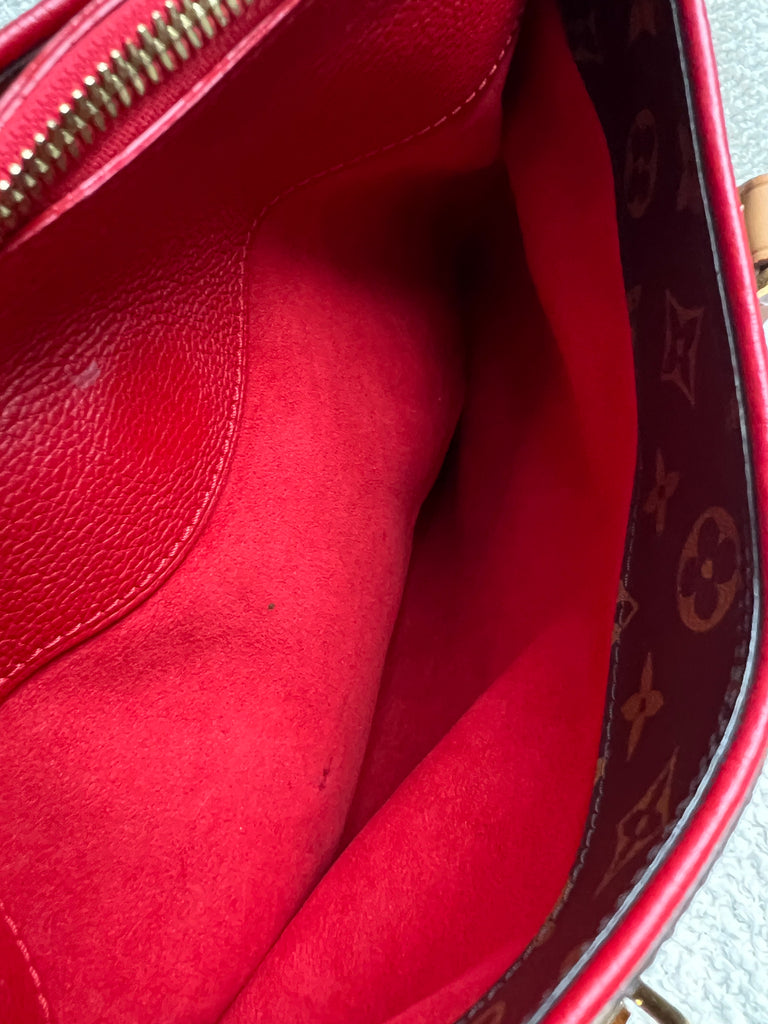 Louis Vuitton Pallas MM Tote in Monogram Canvas and red calfskin with gold hardware. This roomy, practical tote is crafted in monogram coated canvas and lovely red coloured trim and detail. Featuring front and back slip pockets with a main compartment closed by zipper. Can be carried in hand using the two top handles or over shoulder using the detachable leather strap.