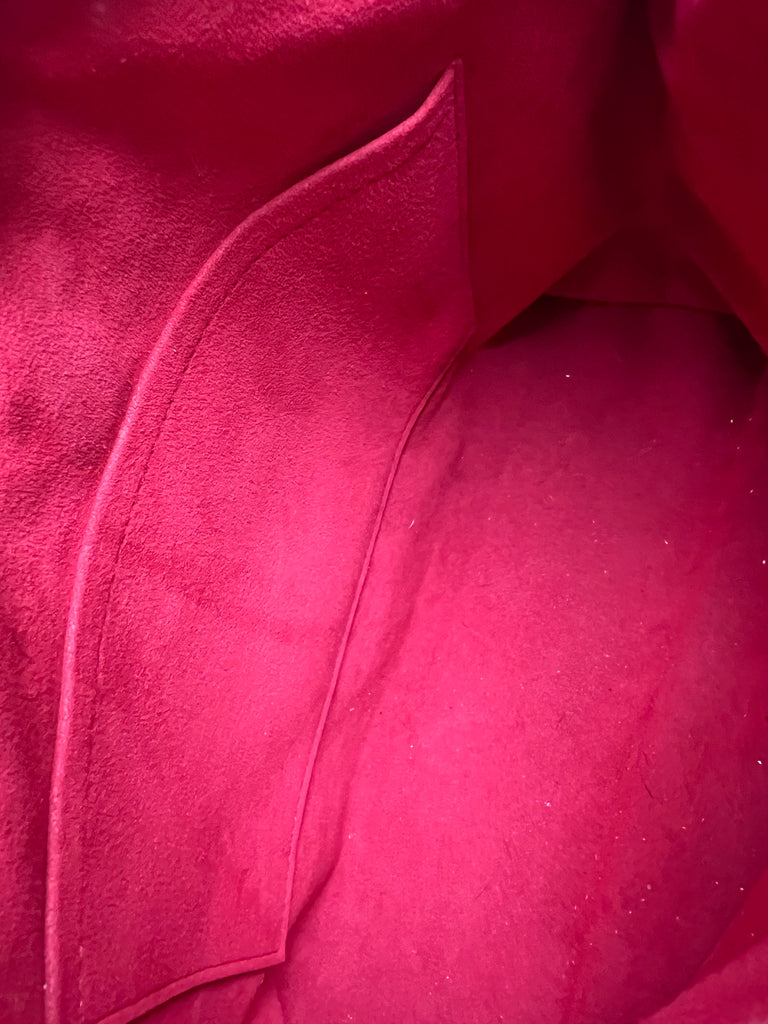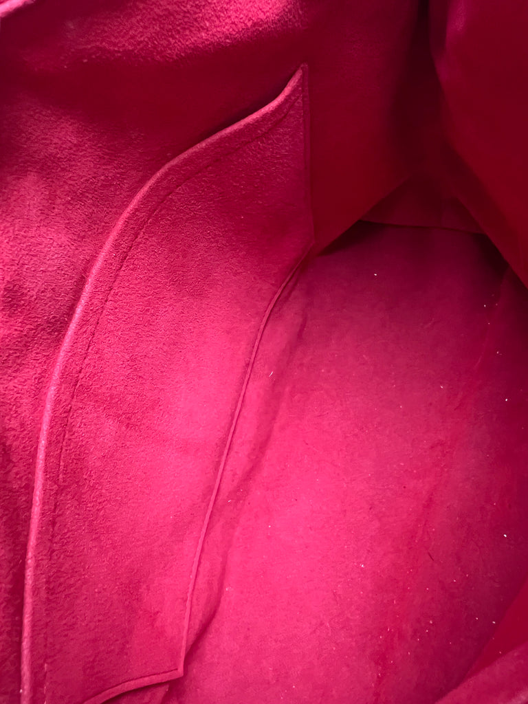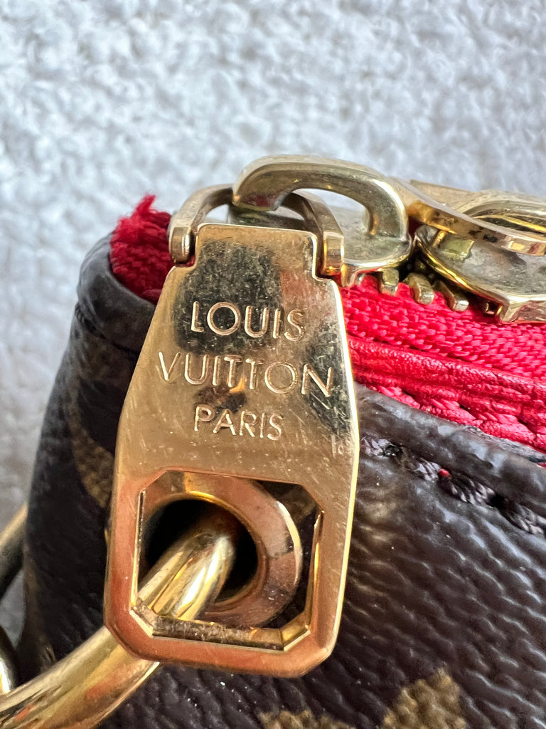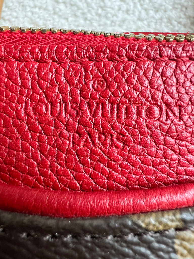 Louis Vuitton Pallas MM Tote in Monogram Canvas and red calfskin with gold hardware. This roomy, practical tote is crafted in monogram coated canvas and lovely red coloured trim and detail. Featuring front and back slip pockets with a main compartment closed by zipper. Can be carried in hand using the two top handles or over shoulder using the detachable leather strap.