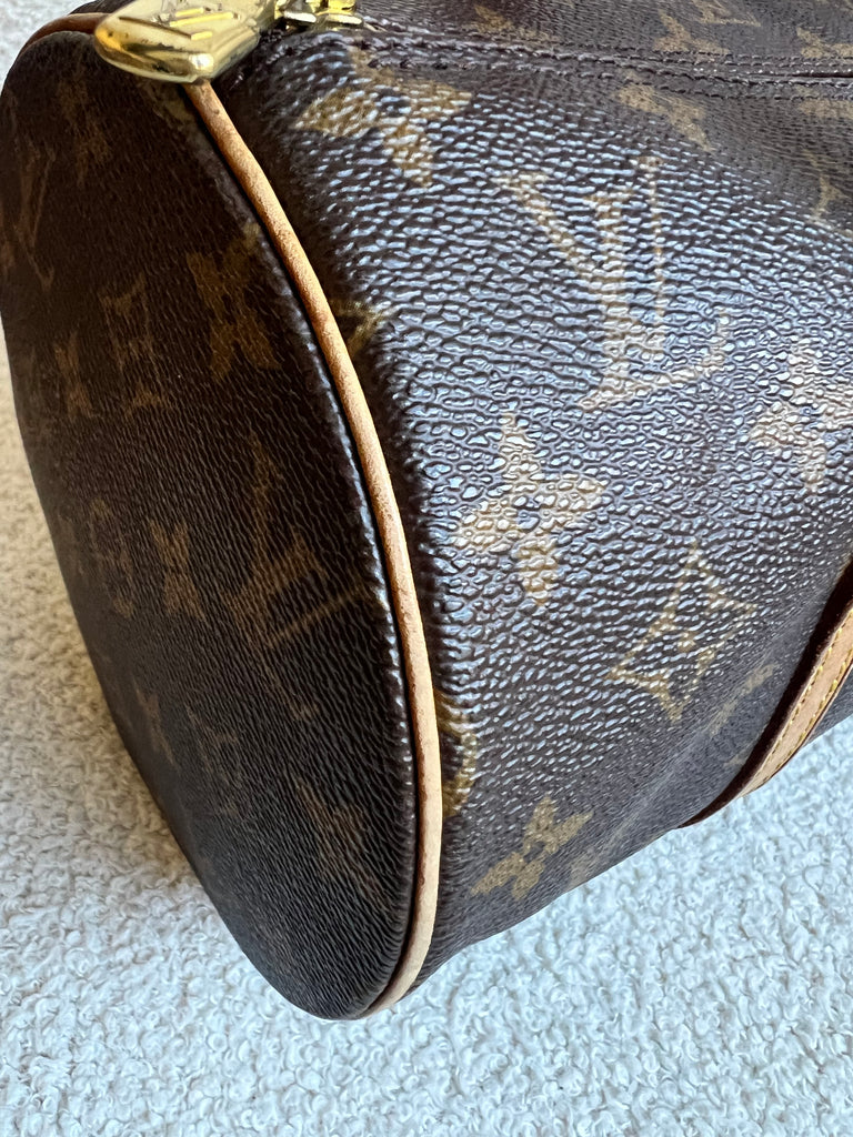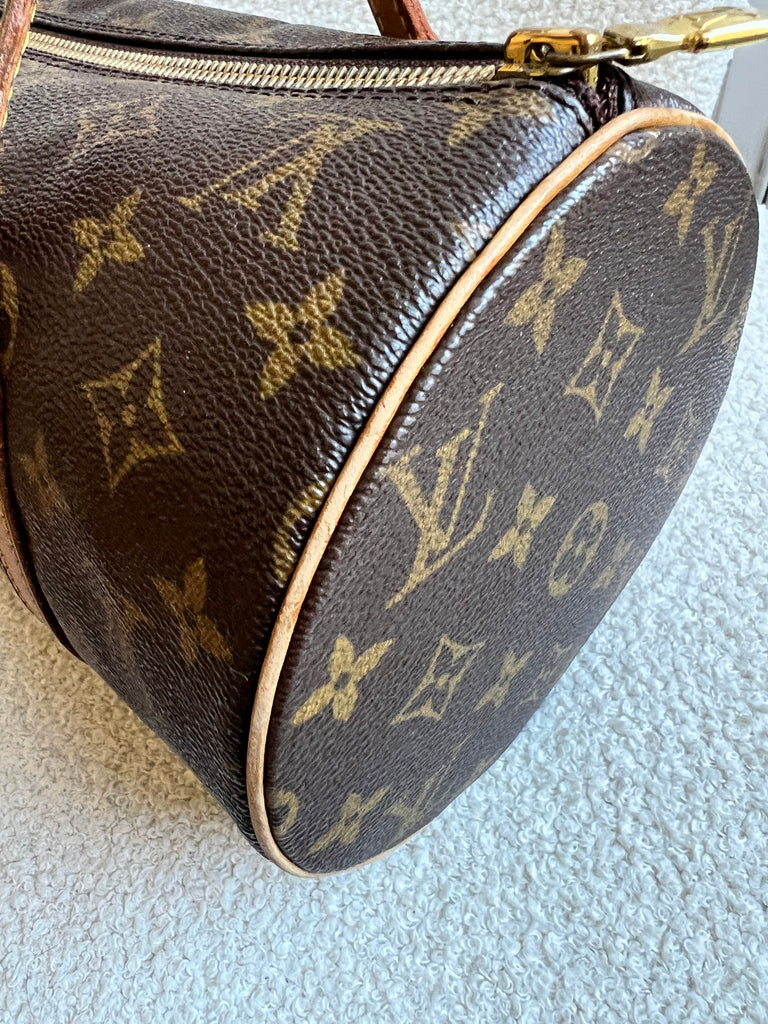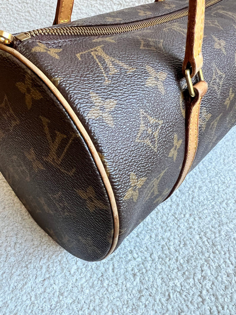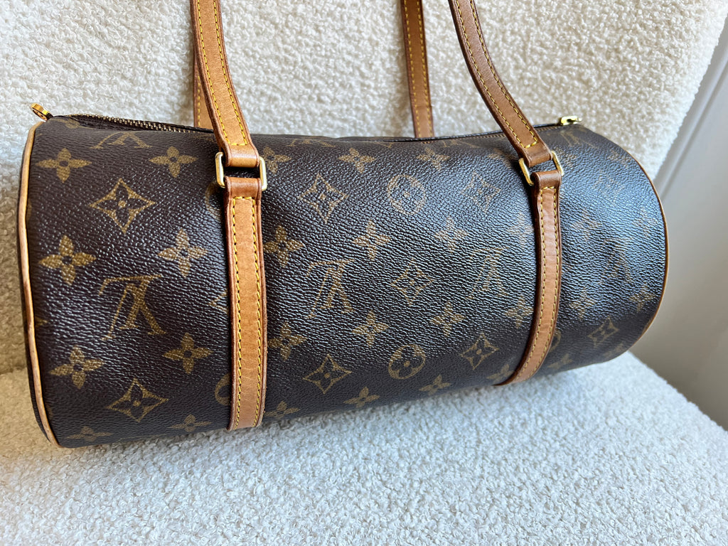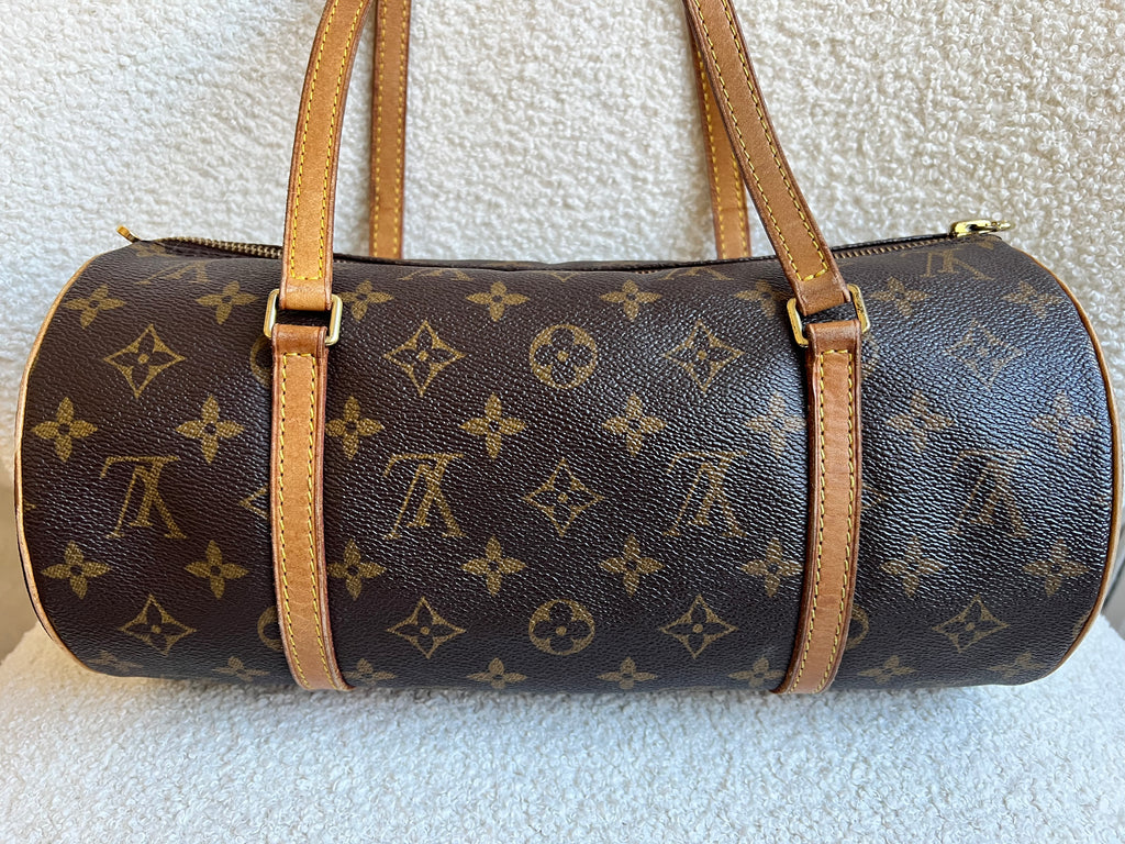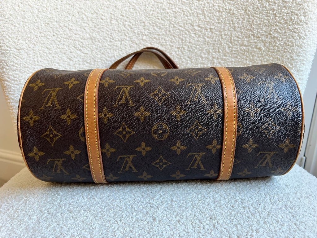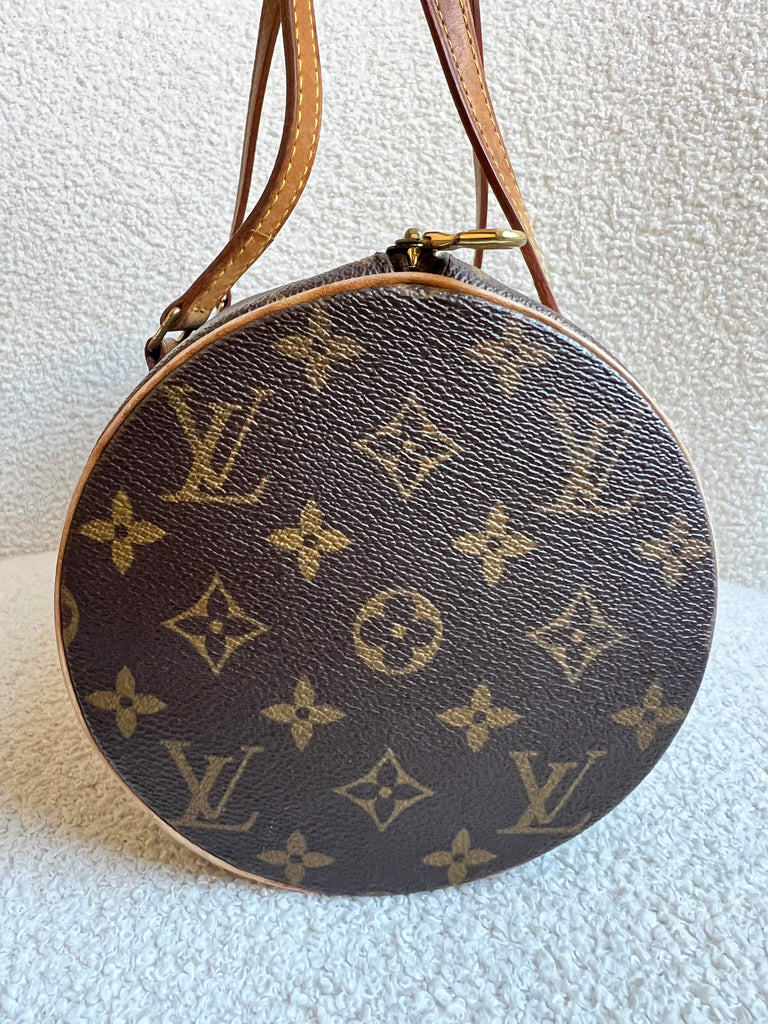 Louis Vuitton Papillon 30 Monogram. This cute bowling style bag is perfect as a grab bag for day to day use. Featuring zipper closure and two top handles and natural leather trim. Can be carried in the crook of the arm, by hand or over shoulder.