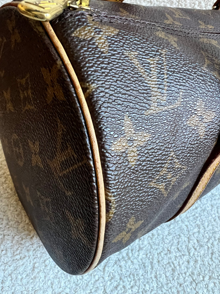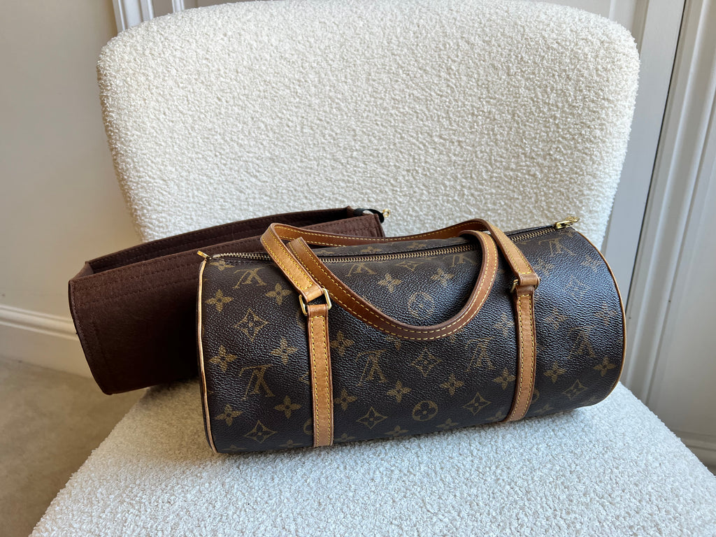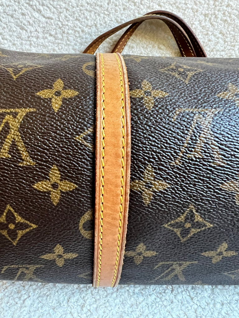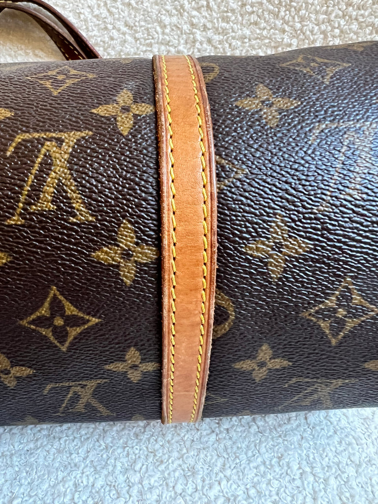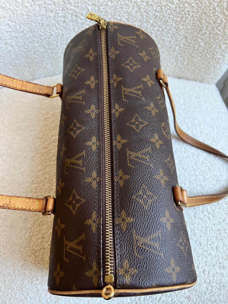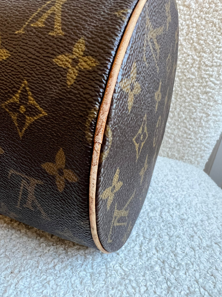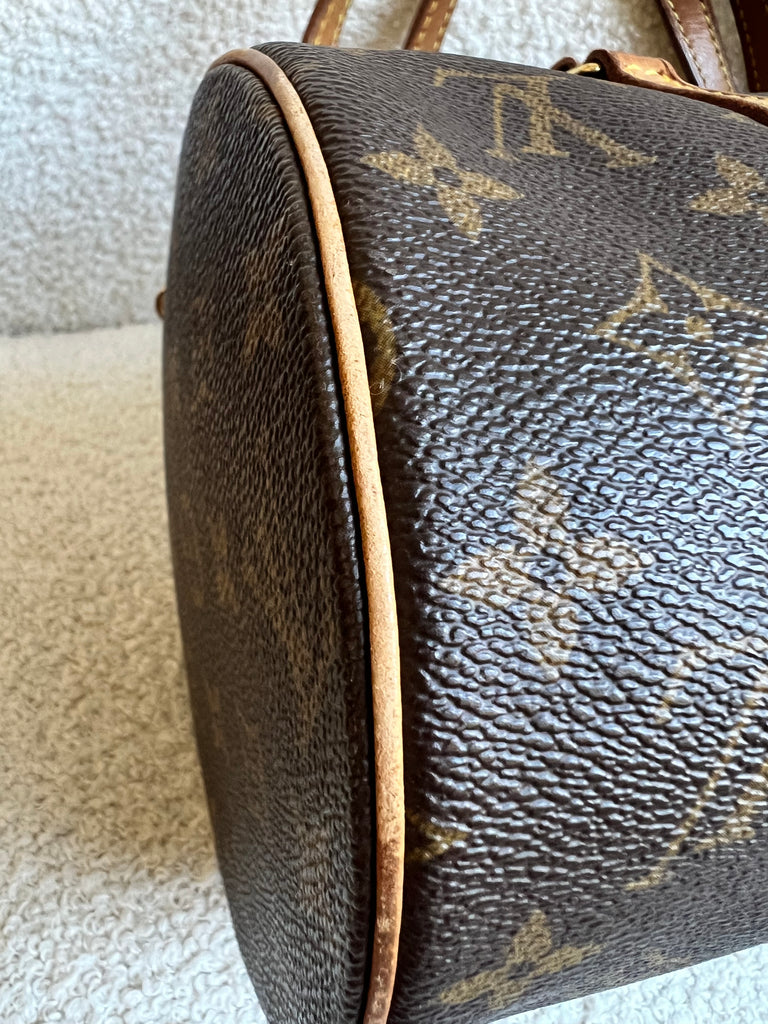 Louis Vuitton Papillon 30 Monogram. This cute bowling style bag is perfect as a grab bag for day to day use. Featuring zipper closure and two top handles and natural leather trim. Can be carried in the crook of the arm, by hand or over shoulder.
