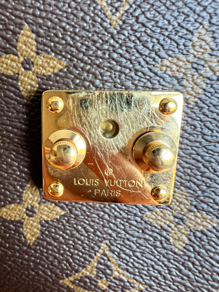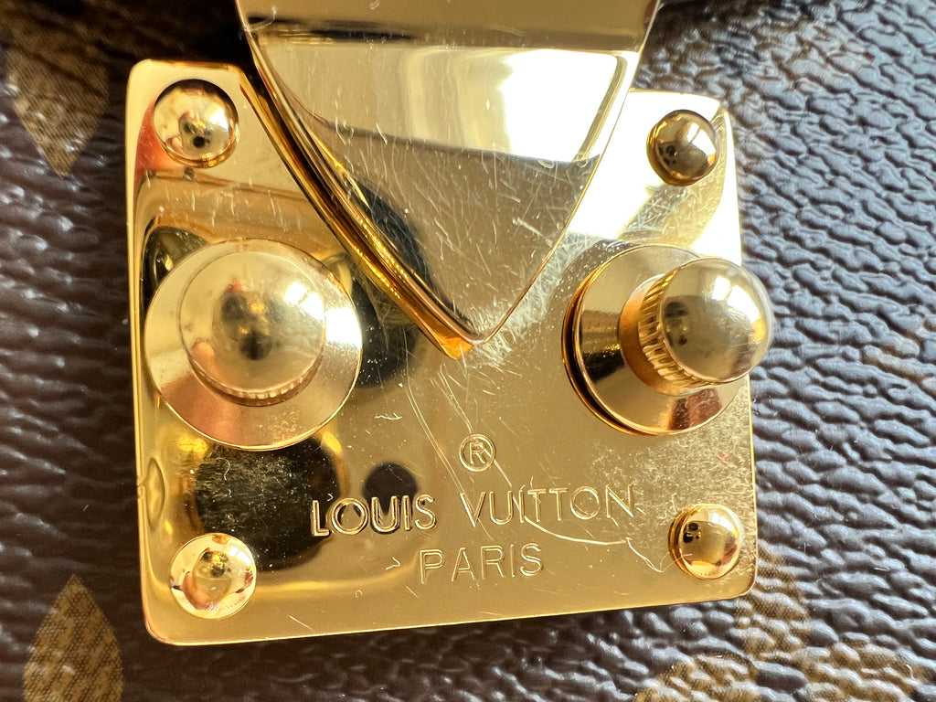 Louis Vuitton Pochette Metis in Monogram canvas with gold hardware. The Pochette Métis handbag is a chic, scaled-down version of the classic satchel silhouette. This covetable model is crafted from Monogram coated canvas accented with an S-lock closure inspired by historic House trunks. Versatile, compact and surprisingly roomy, it is fitted with a stylish top handle and a detachable strap for shoulder or cross-body wear.