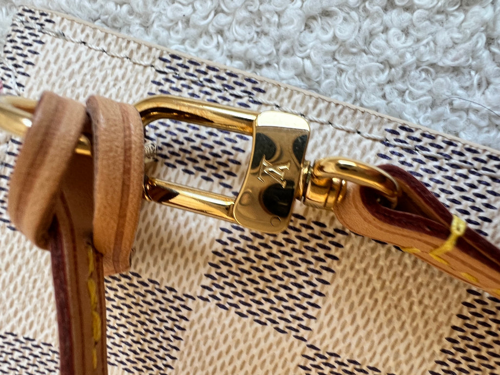 Louis Vuitton Pouch in Damier Azur with Beige interior. This handy pouch comes with the Neverfull MM. Zip top closure, can be used as a clutch, or attached to the inside of a bag using the short strap.