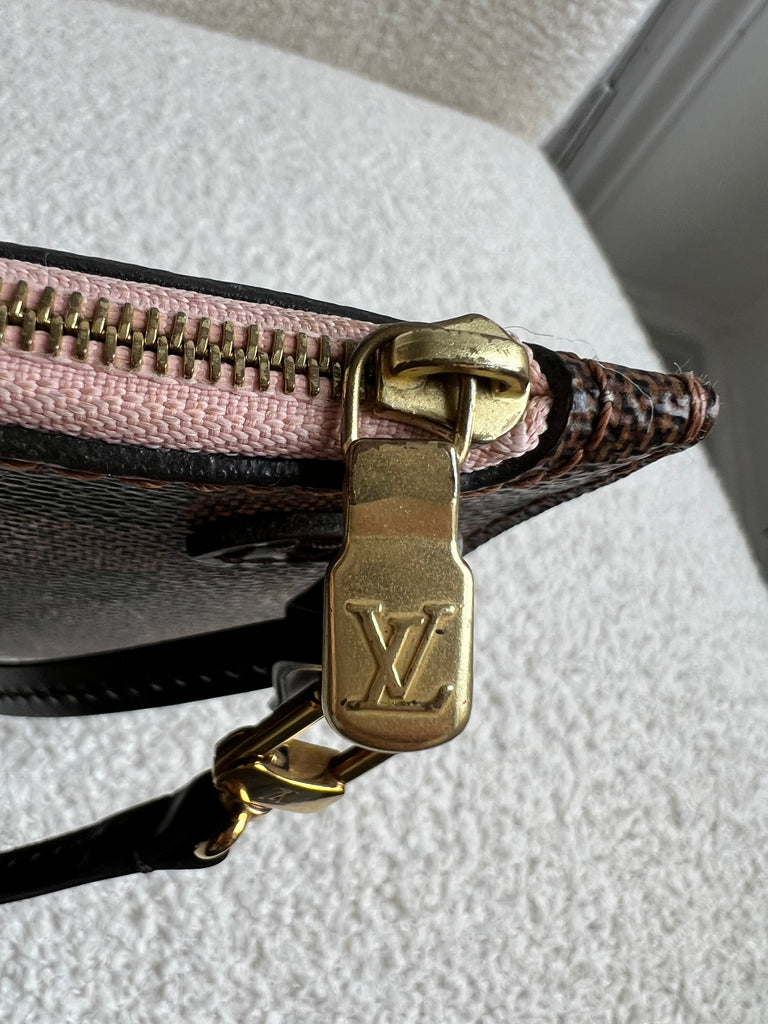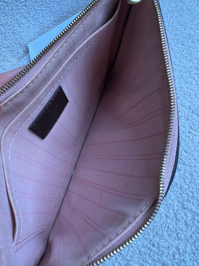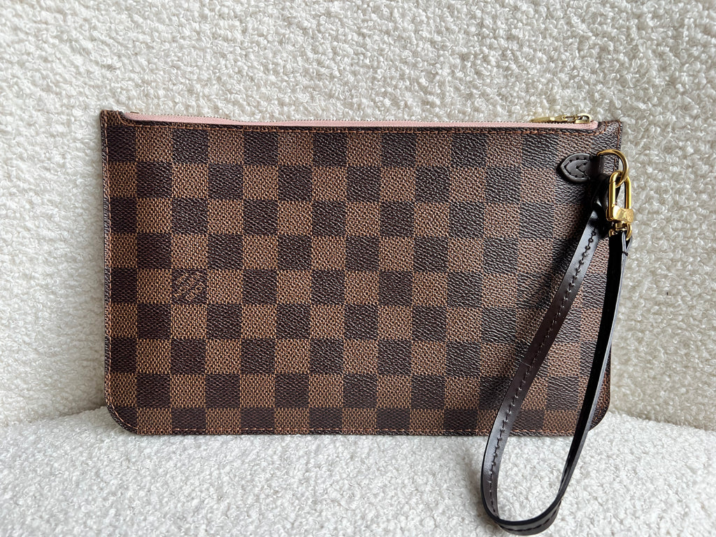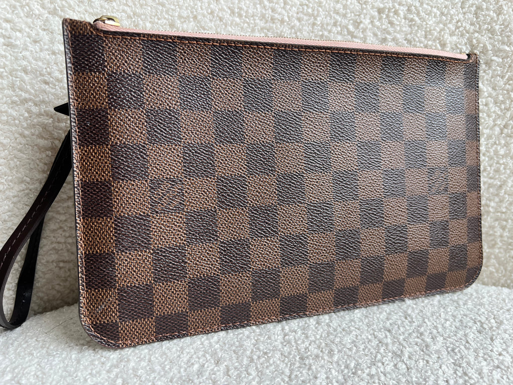 Louis Vuitton Pouch in Damier Ebene with Rose Ballerine interior. This handy pouch comes with the Neverfull MM. Zip top closure, can be used as a clutch, or attached to the inside of a bag using the short strap.