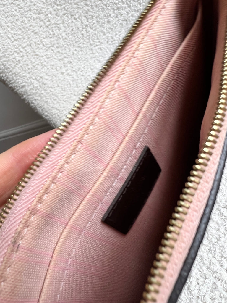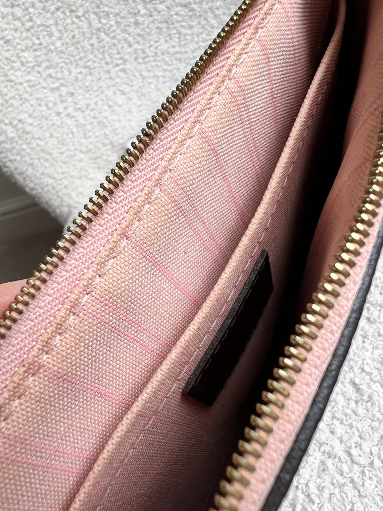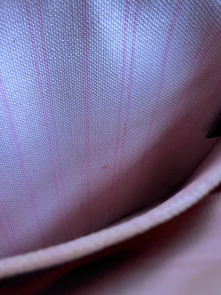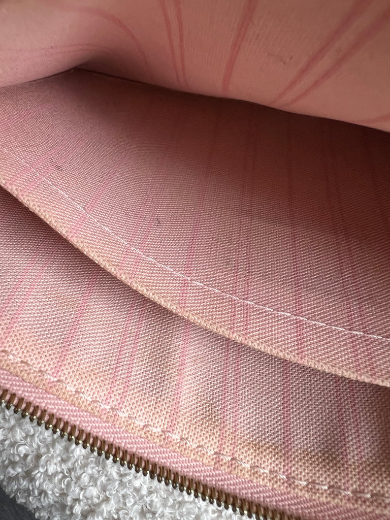 Louis Vuitton Pouch in Damier Ebene with Rose Ballerine interior. This handy pouch comes with the Neverfull MM. Zip top closure, can be used as a clutch, or attached to the inside of a bag using the short strap.