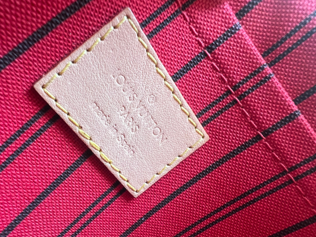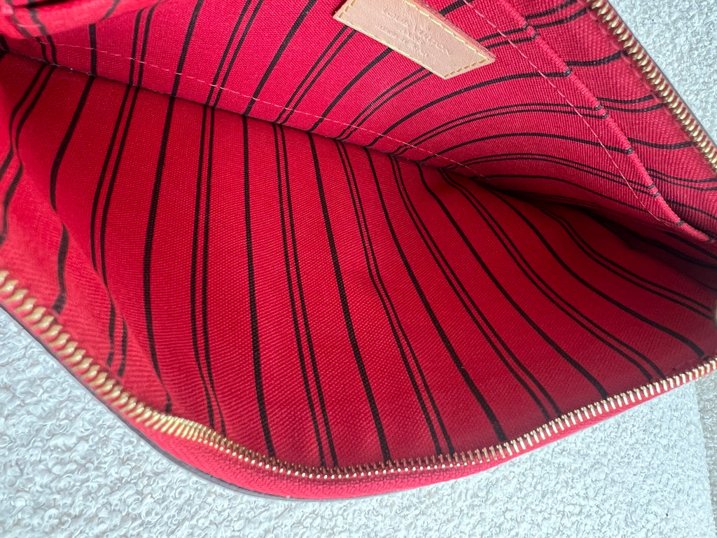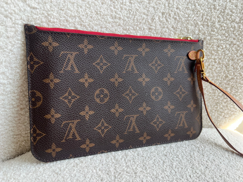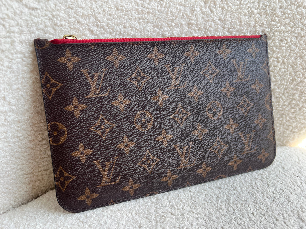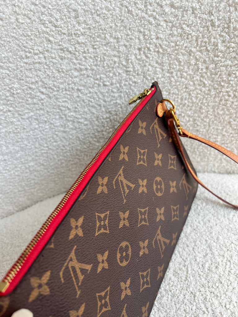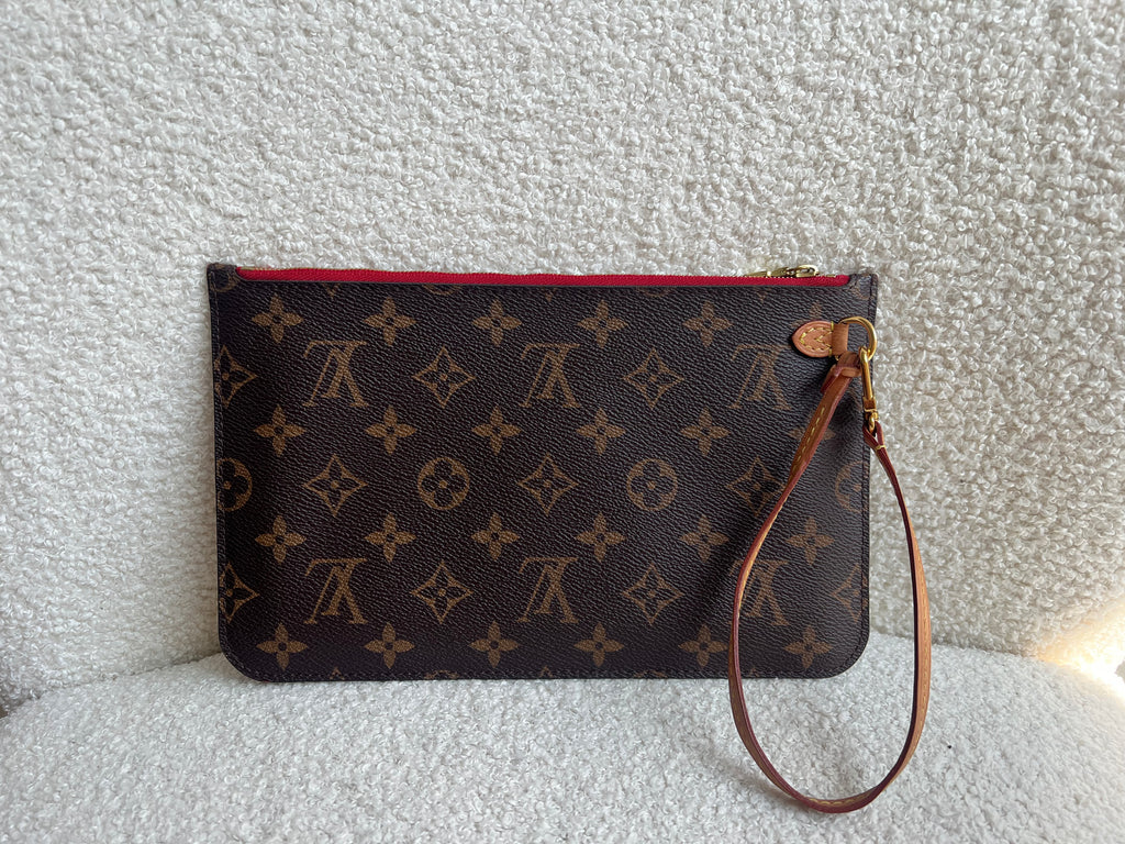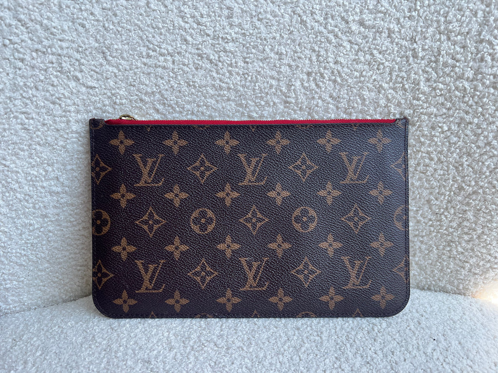 Louis Vuitton Pouch in Monogram with Cherry red interior. This handy pouch comes with the Neverfull MM. Zip top closure, can be used as a clutch, or attached to the inside of a bag using the short strap. 2020.