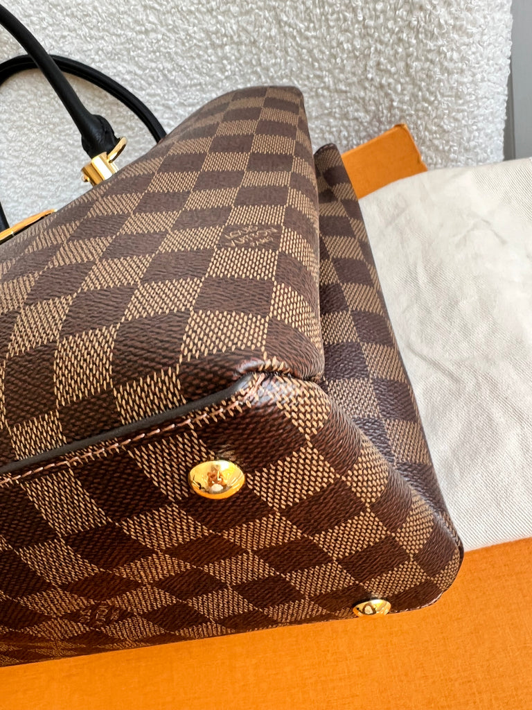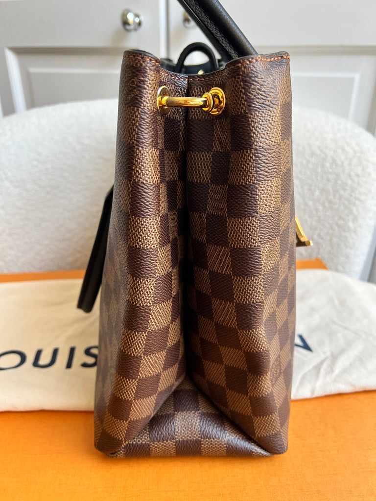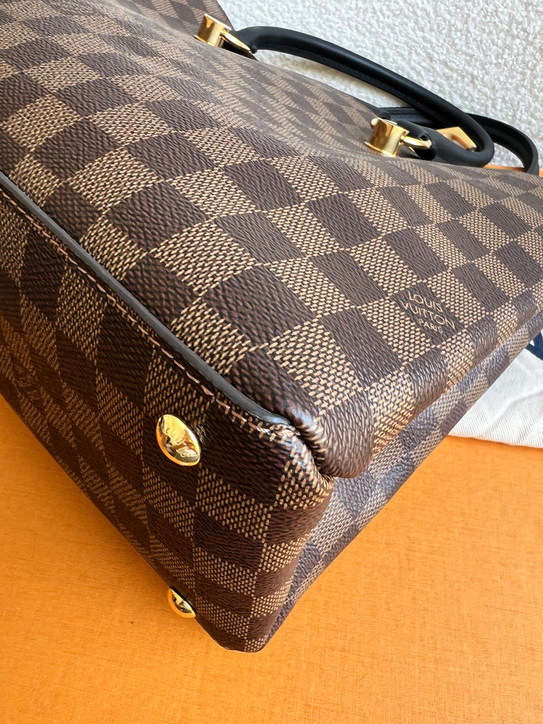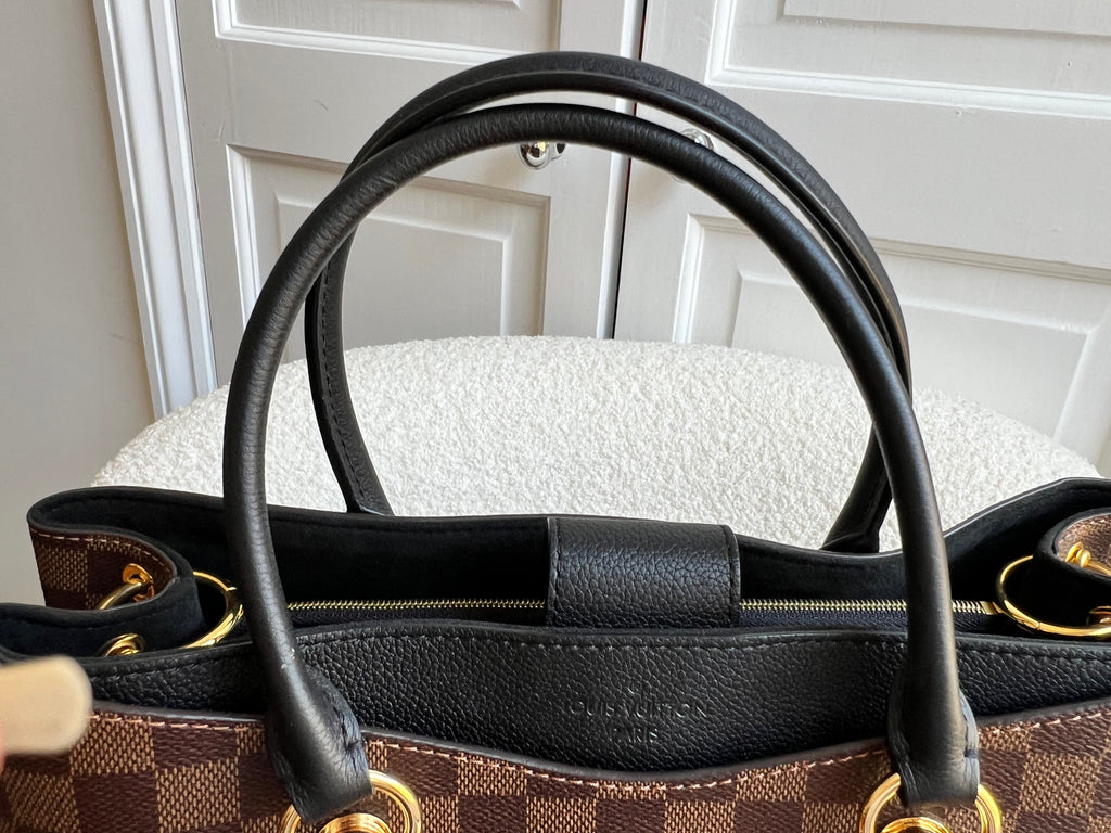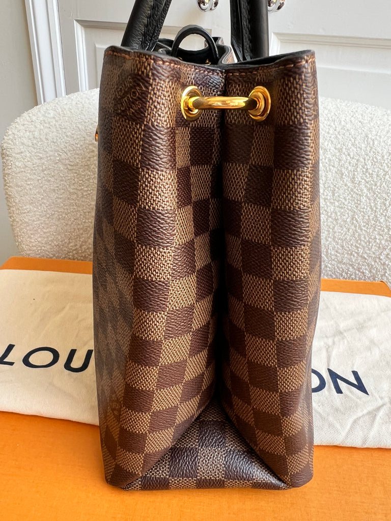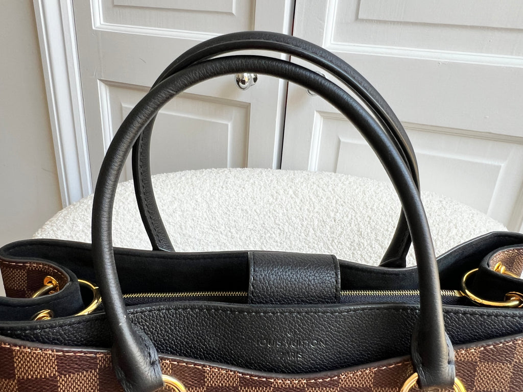 Louis Vuitton Riverside Tote in Damier Ebene Canvas and black trim. This elegant yet practical tote is an ideal day to day or work bag. With two top handles and long detachable strap, the shape is reasonably structured. It is crafted from Damier Ebene canvas with details in black grained Taurillon leather. The hanging LV charm is non removable and is crafted in an epi textured resin. This super stylish model is usually sold out at Louis Vuitton. Can be carried by hand, in the crook fo the arm or over shoulder.