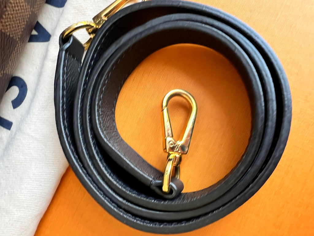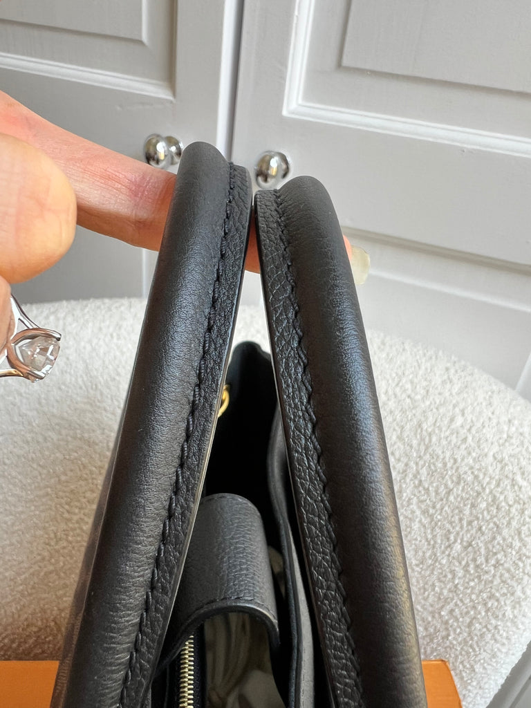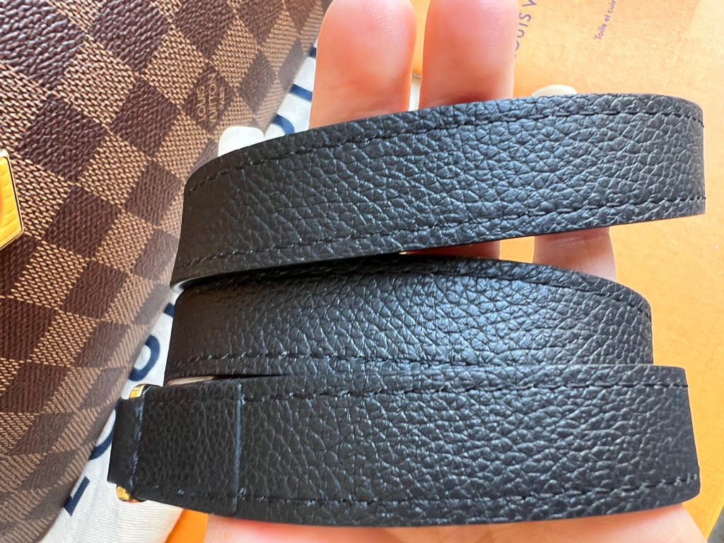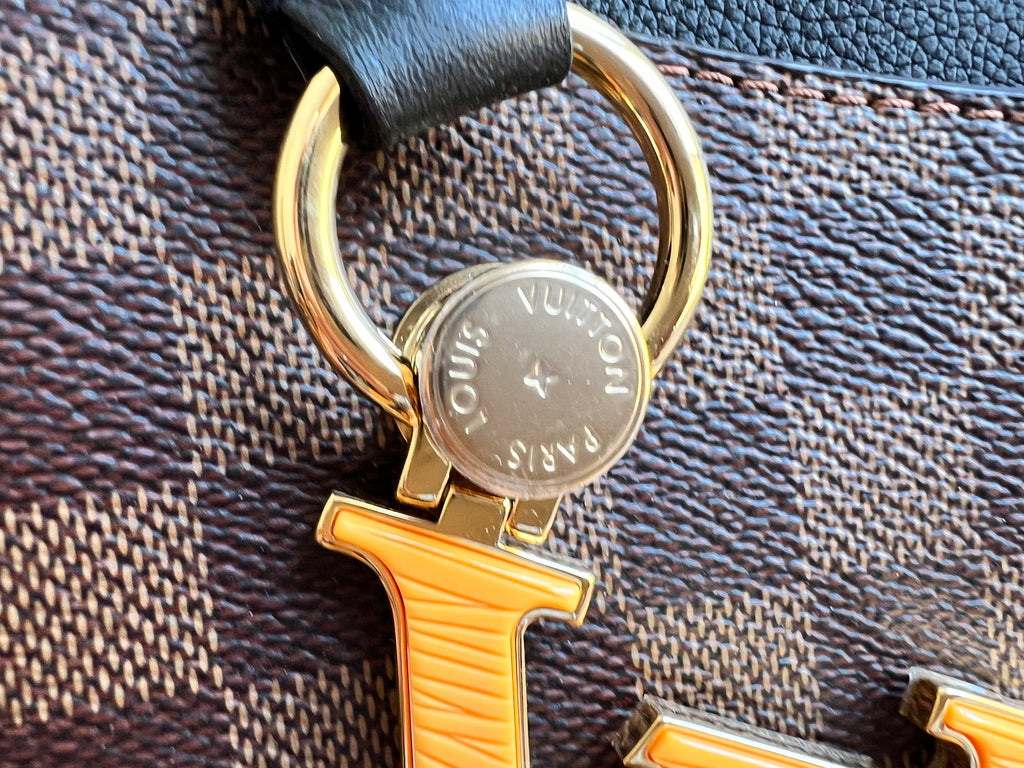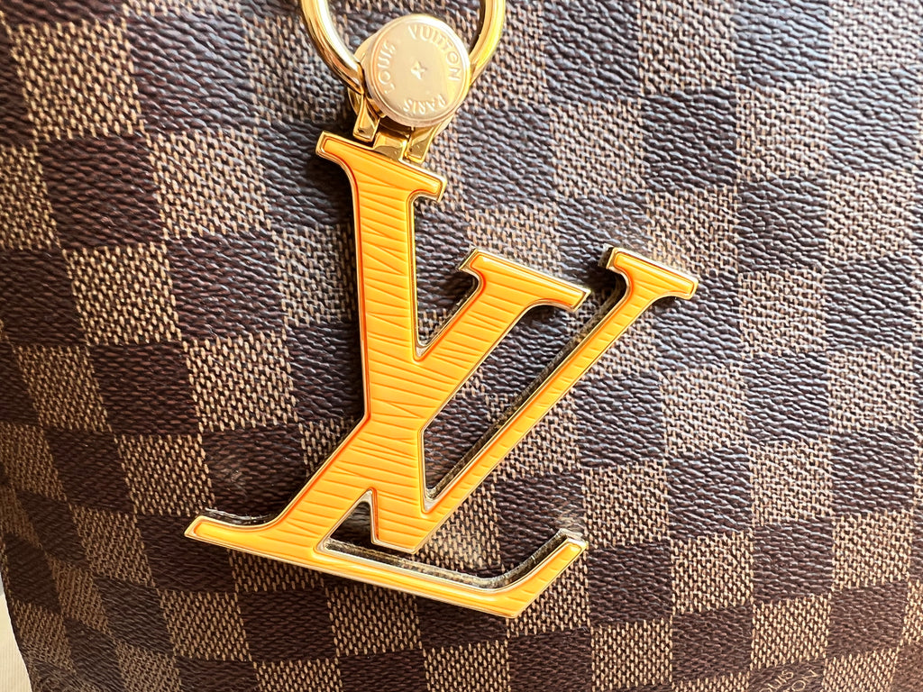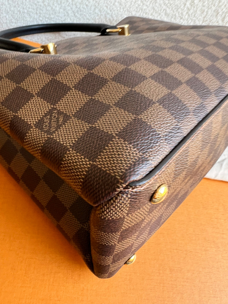 Louis Vuitton Riverside Tote in Damier Ebene Canvas and black trim. This elegant yet practical tote is an ideal day to day or work bag. With two top handles and long detachable strap, the shape is reasonably structured. It is crafted from Damier Ebene canvas with details in black grained Taurillon leather. The hanging LV charm is non removable and is crafted in an epi textured resin. This super stylish model is usually sold out at Louis Vuitton. Can be carried by hand, in the crook fo the arm or over shoulder.