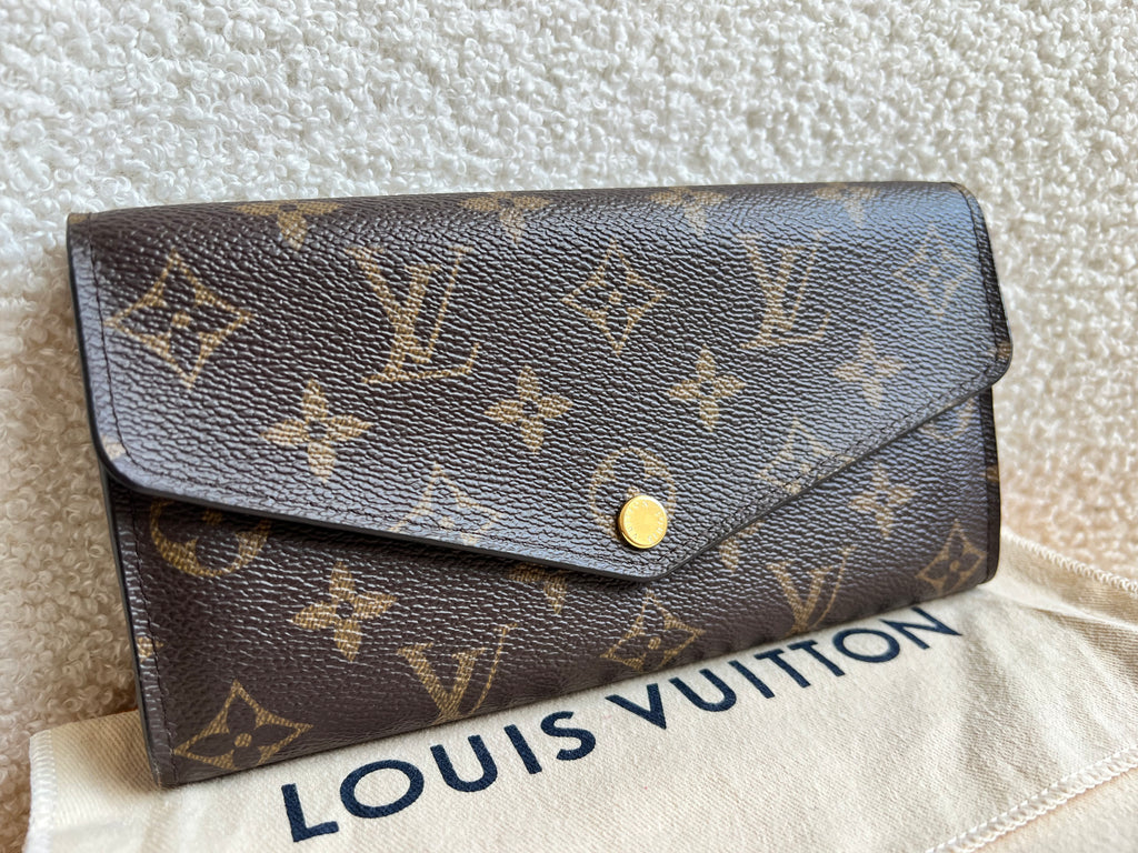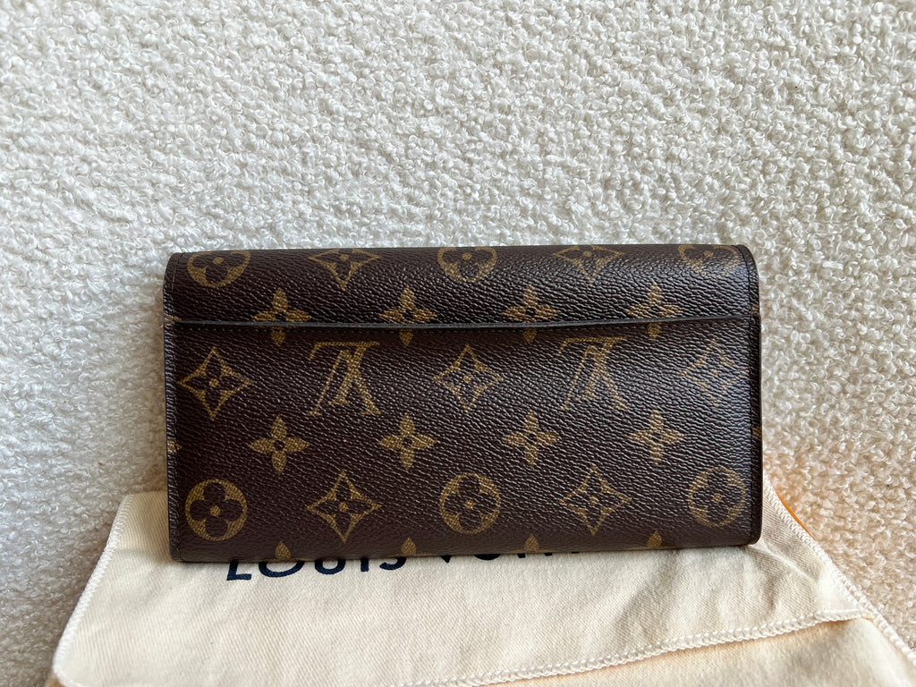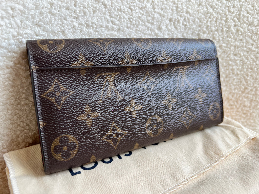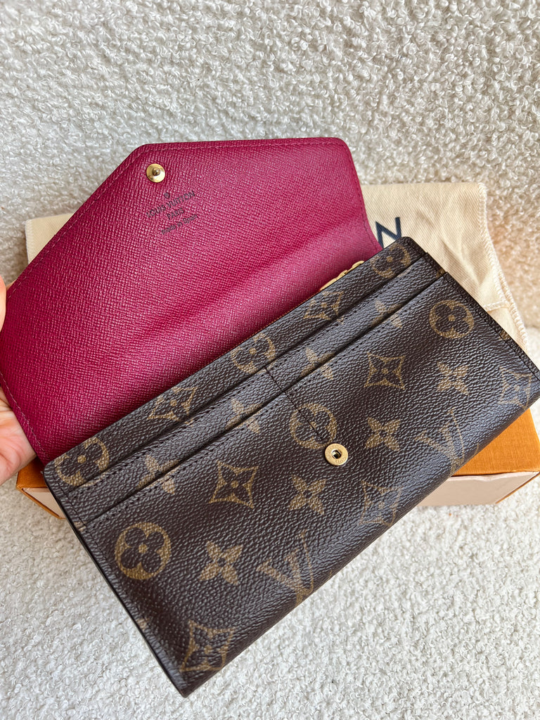 Louis Vuitton Sarah Wallet in Monogram Canvas with Fuchsia interior. One of Louis Vuitton's classic models, the Sarah Wallet combines Monogram canvas with a grained leather lining. Its elegant envelope-style design conceals a spacious interior with two large compartments, a central zipped coin pocket and multiple card slots. The perfect choice to keep all essentials in one safe place.