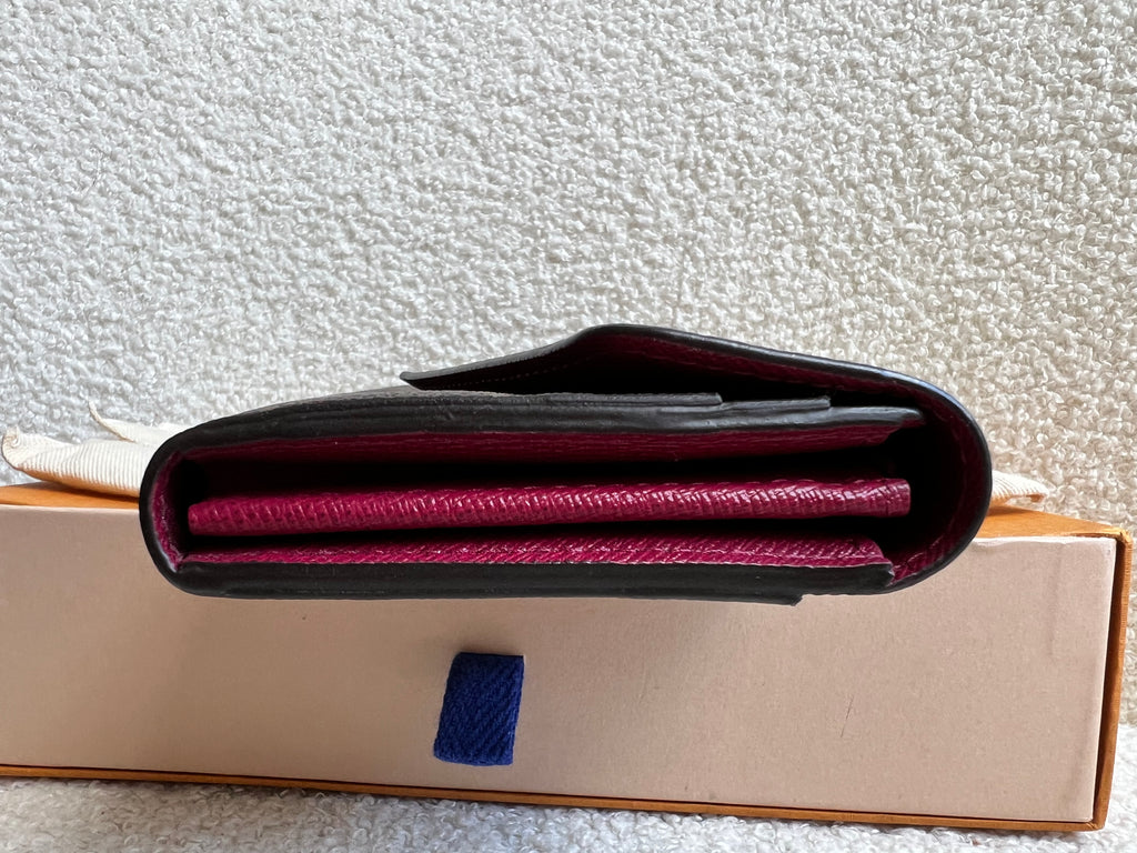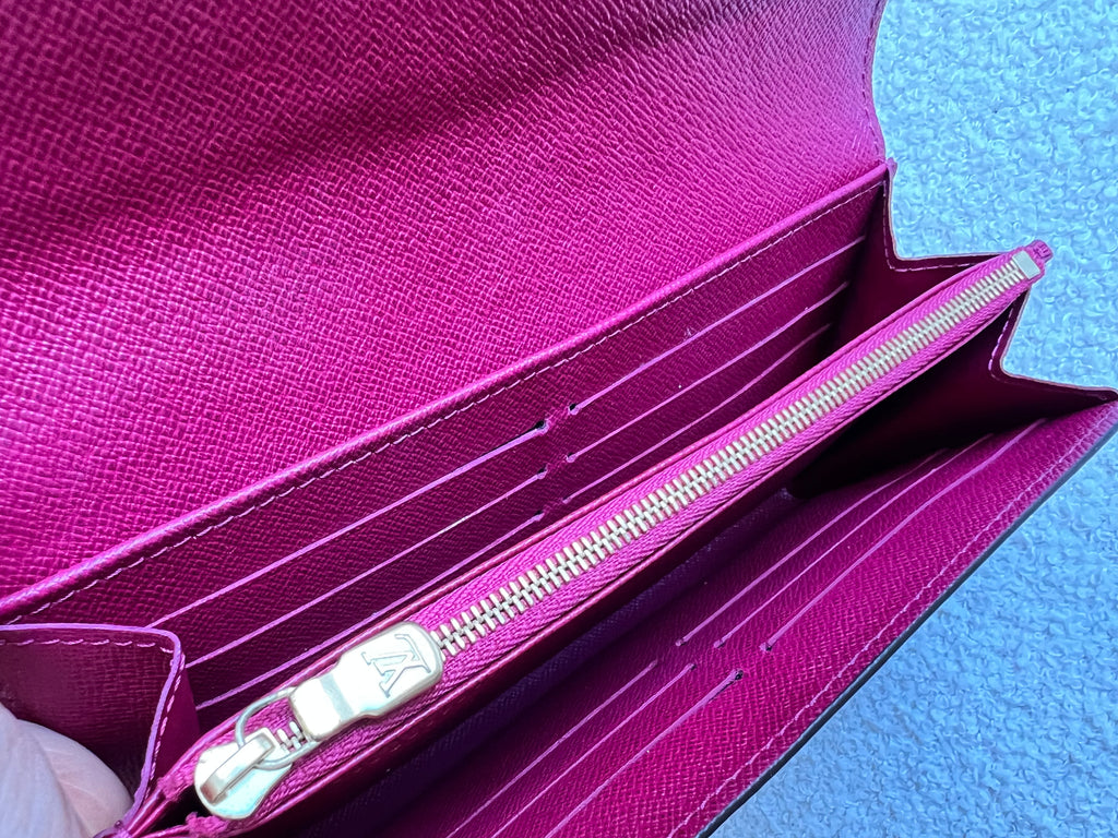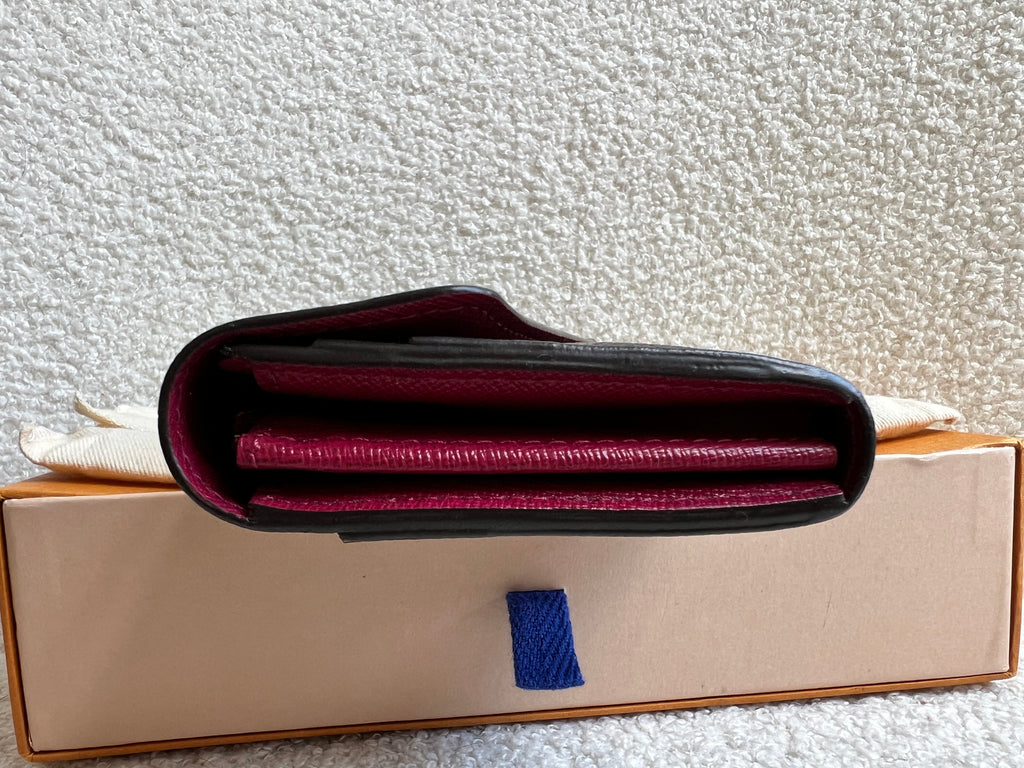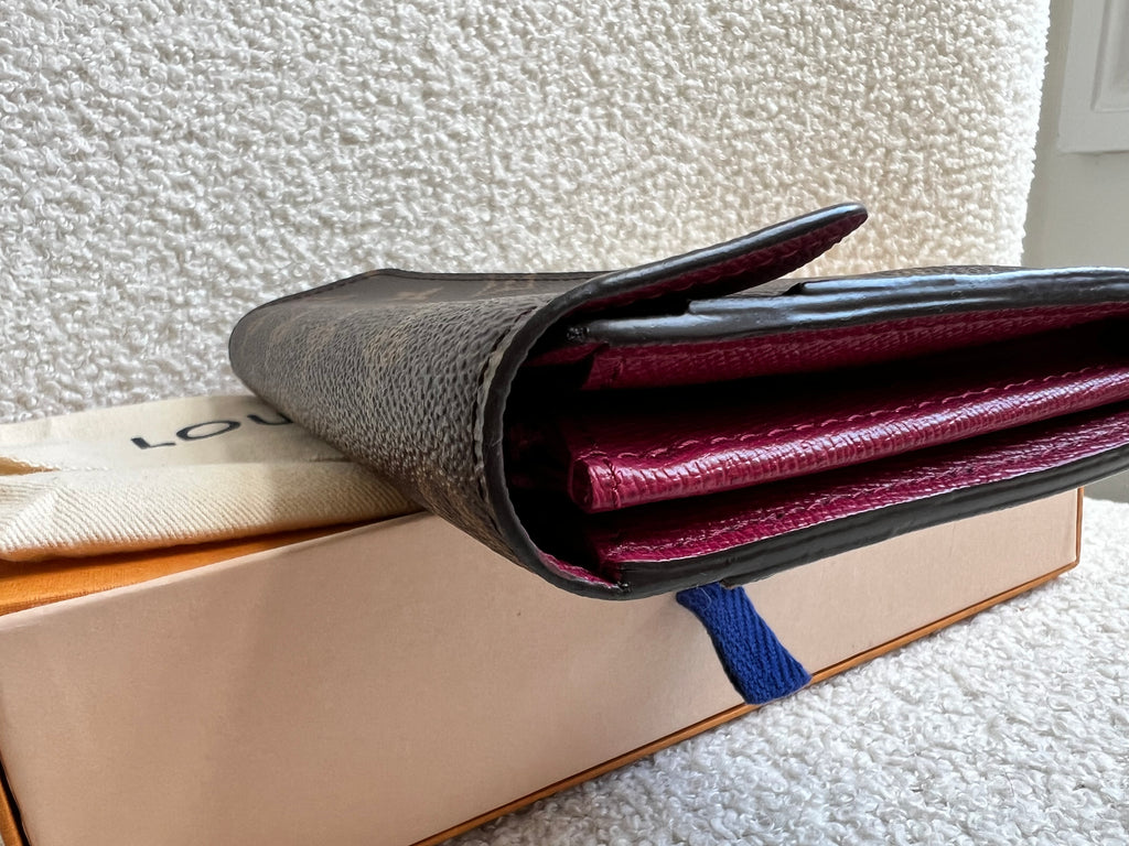 Louis Vuitton Sarah Wallet in Monogram Canvas with Fuchsia interior. One of Louis Vuitton's classic models, the Sarah Wallet combines Monogram canvas with a grained leather lining. Its elegant envelope-style design conceals a spacious interior with two large compartments, a central zipped coin pocket and multiple card slots. The perfect choice to keep all essentials in one safe place.