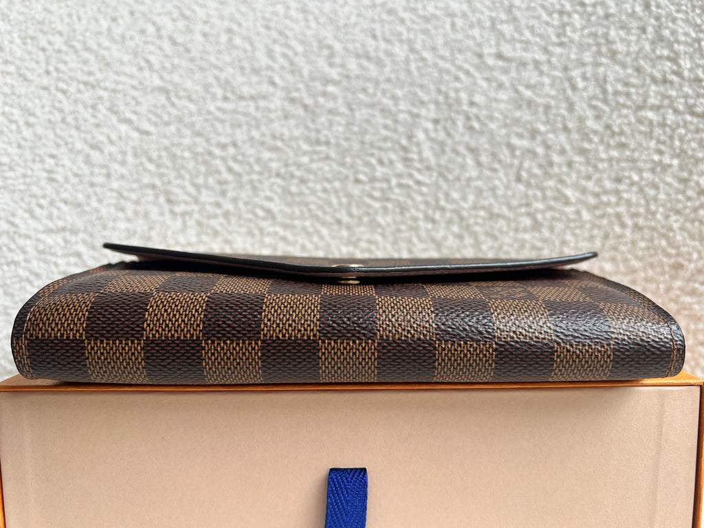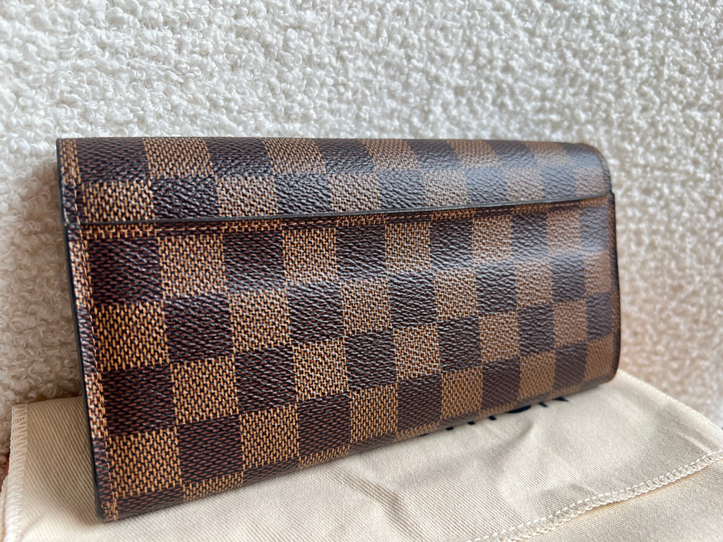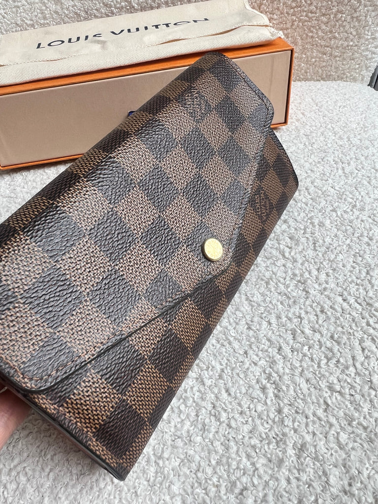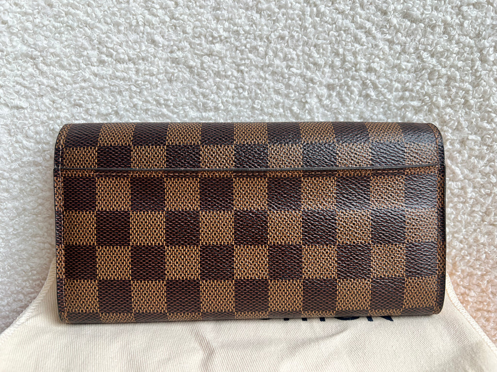 Louis Vuitton Sarah Wallet in Damier Ebene Canvas with Rose Ballerine interior. One of Louis Vuitton's classic models, the Sarah Wallet combines Monogram canvas with a grained leather lining. Its elegant envelope-style design conceals a spacious interior with two large compartments, a central zipped coin pocket and multiple card slots. The perfect choice to keep all essentials in one safe place.