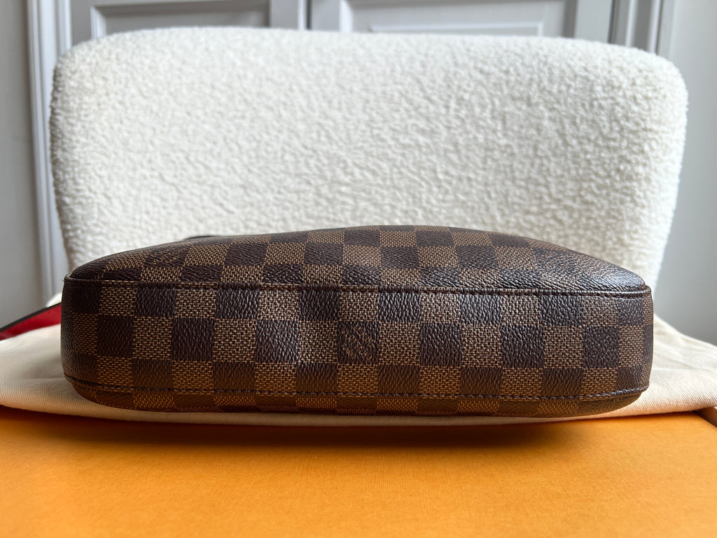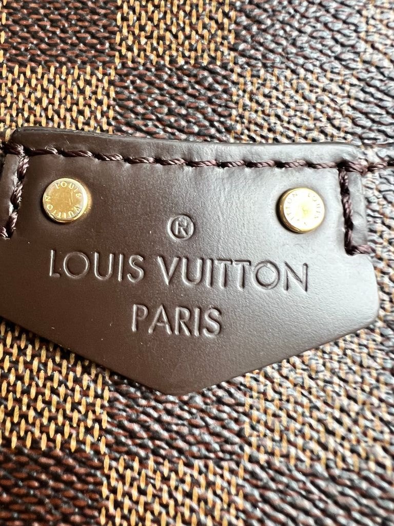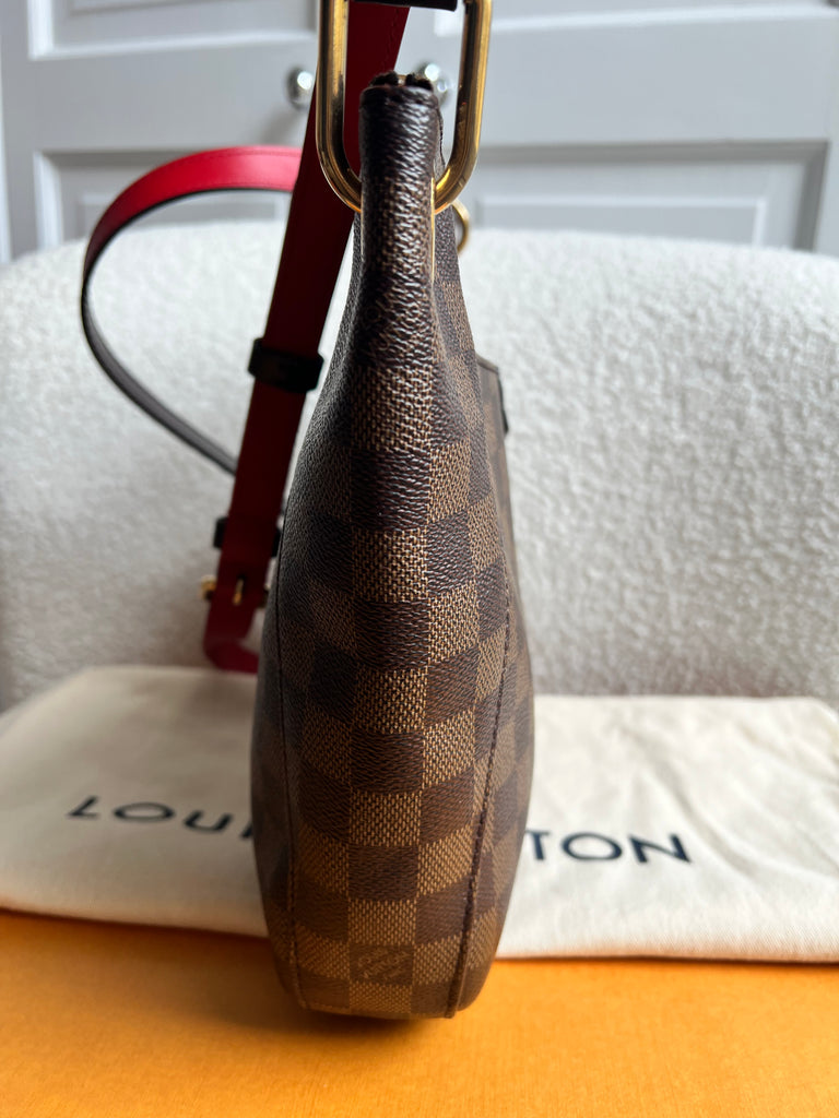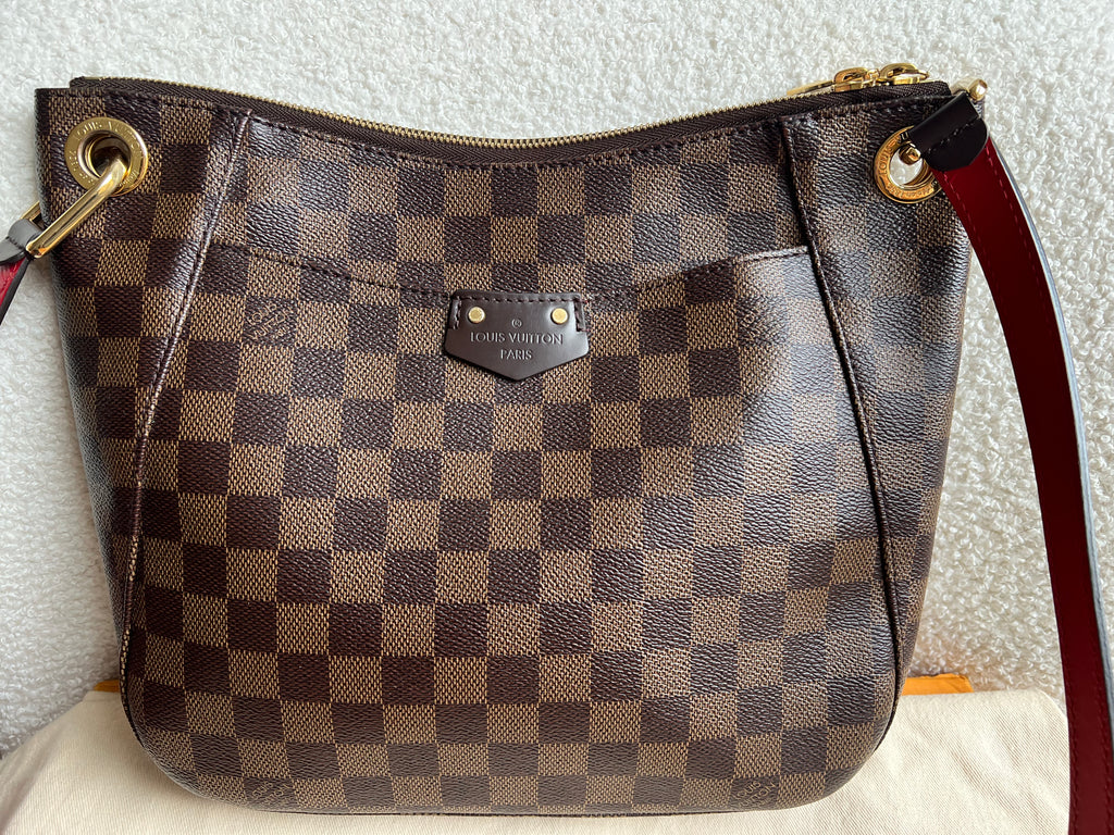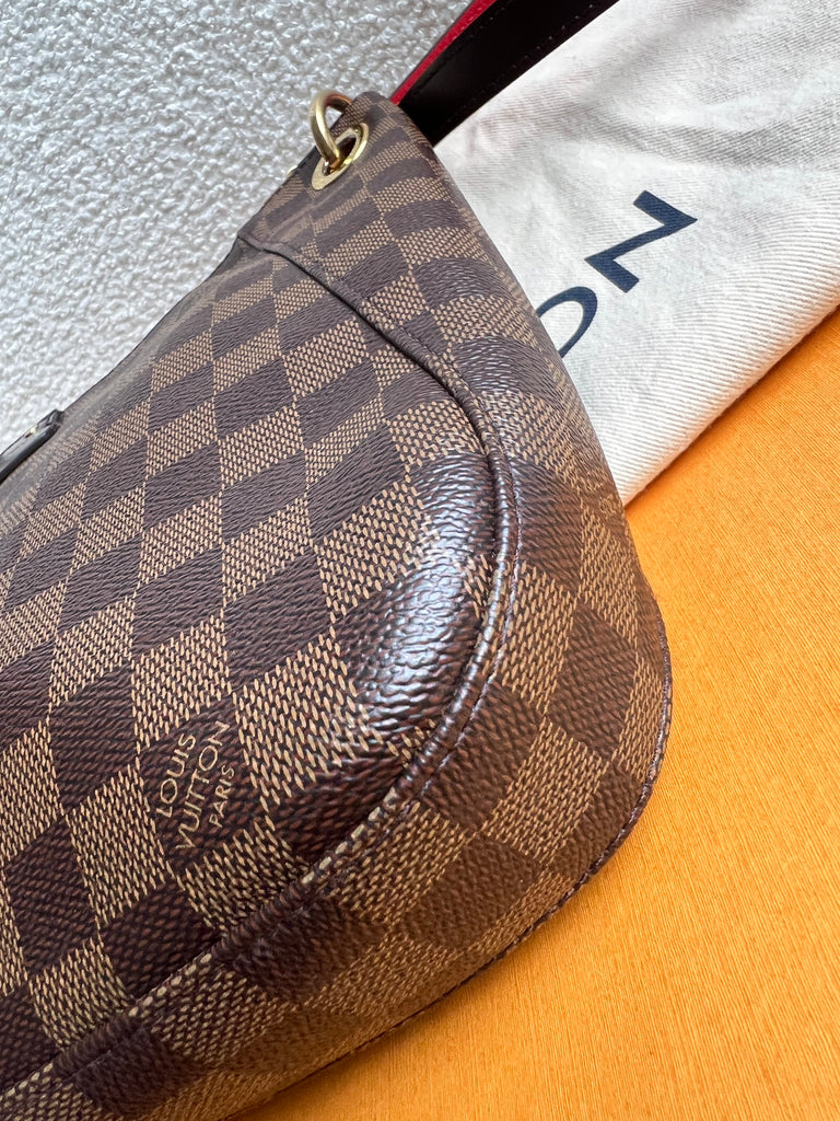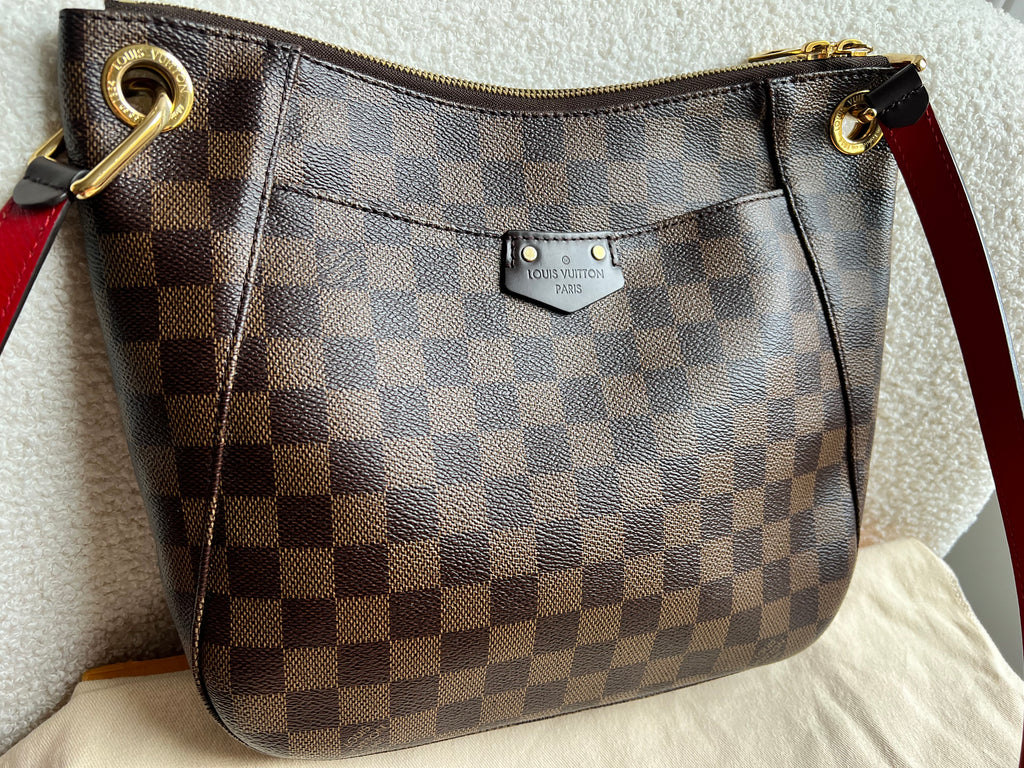 Louis Vuitton South Bank Besace Bag in Damier Ebene canvas with gold hardware. This zipped messenger style has a slight slouch and is perfect for everyday wear. With perfect functionality and both casual and chic style, this messenger can be worn over shoulder or cross body using the long adjustable strap.