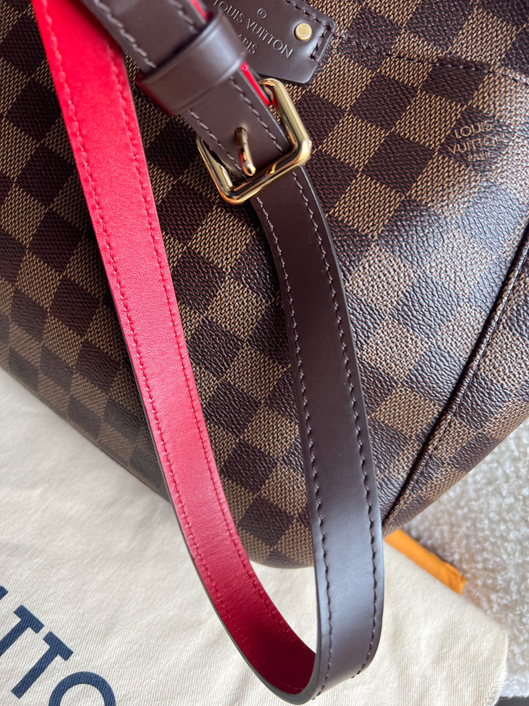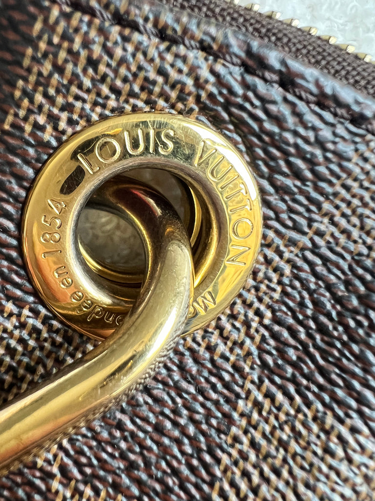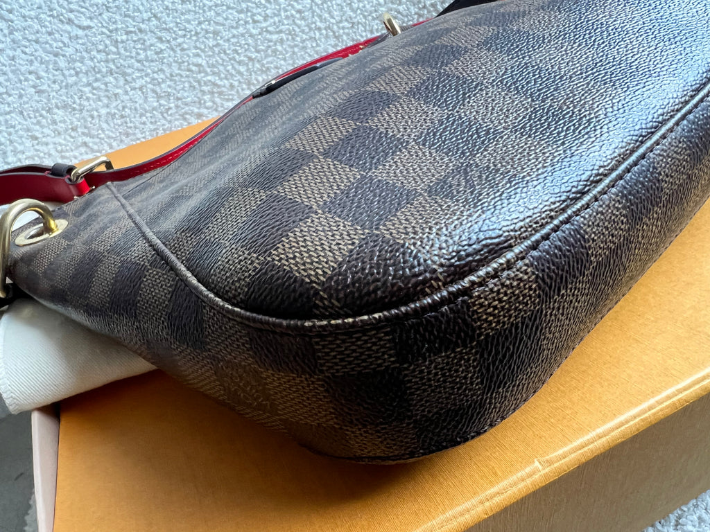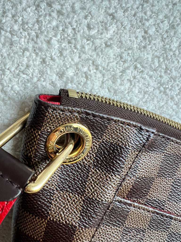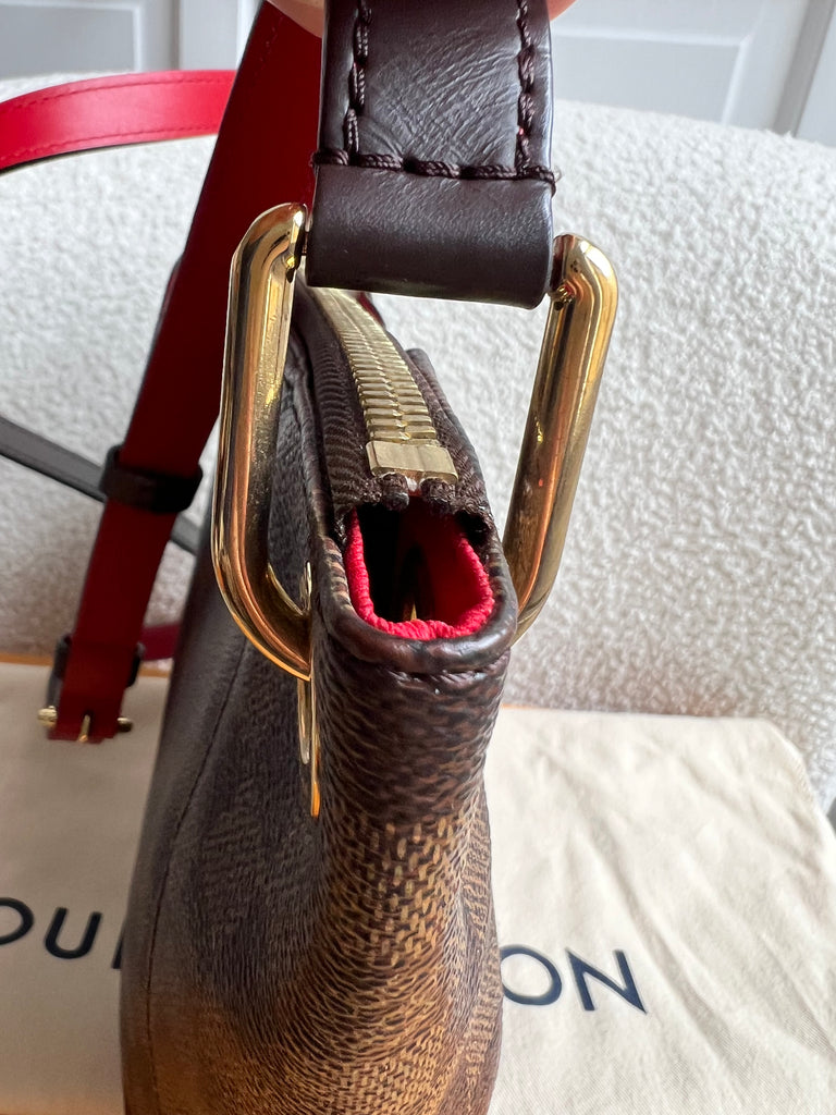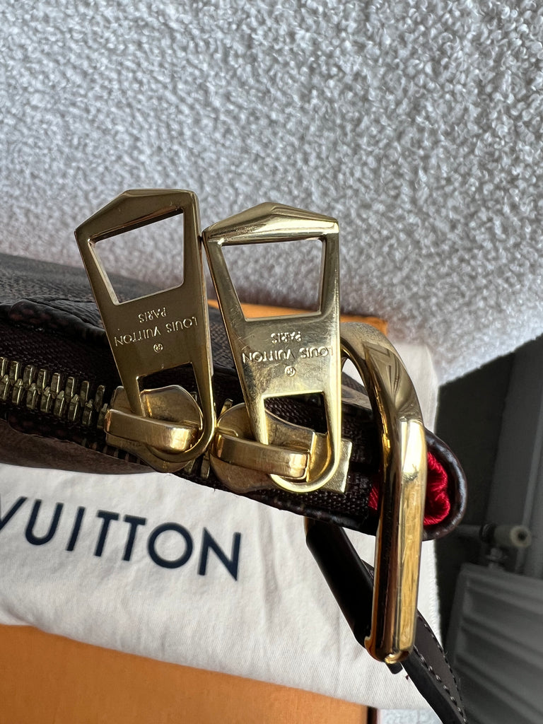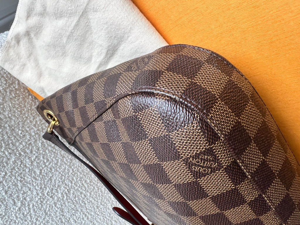 Louis Vuitton South Bank Besace Bag in Damier Ebene canvas with gold hardware. This zipped messenger style has a slight slouch and is perfect for everyday wear. With perfect functionality and both casual and chic style, this messenger can be worn over shoulder or cross body using the long adjustable strap.