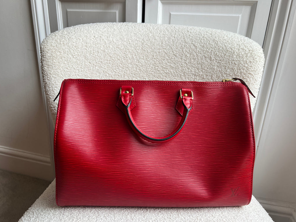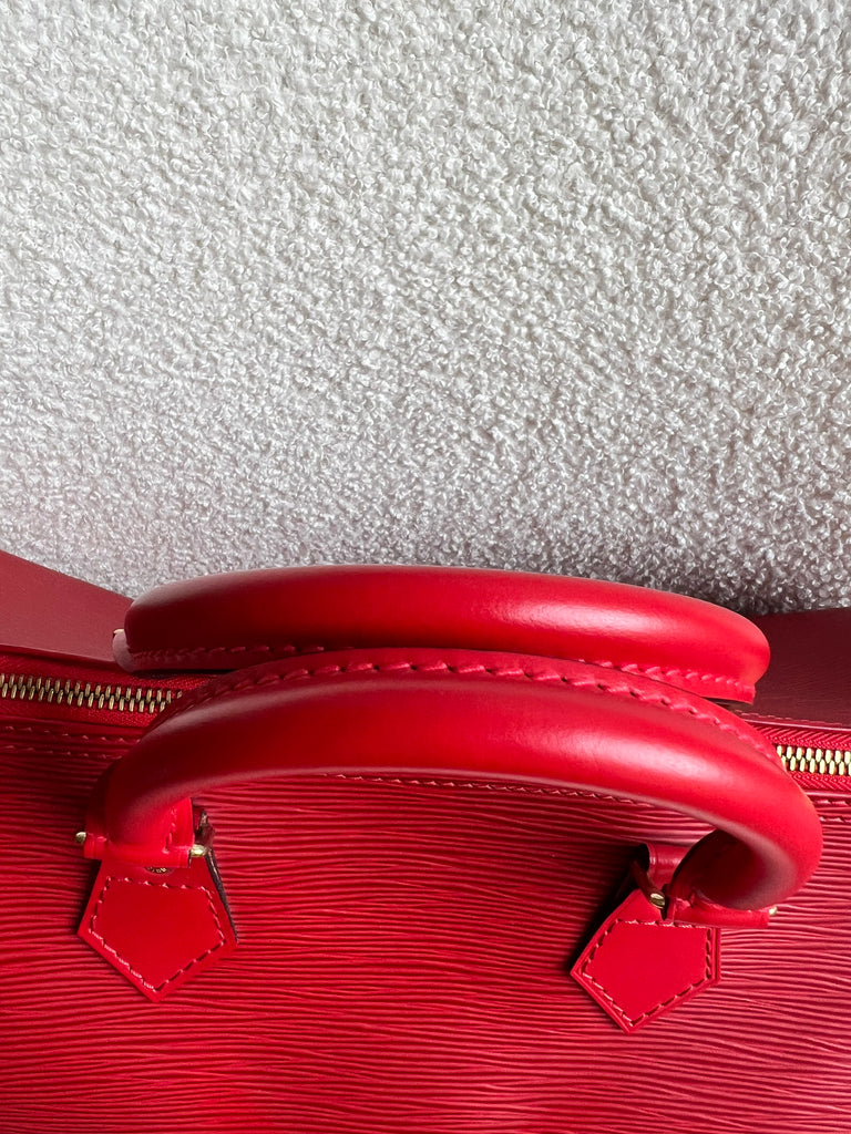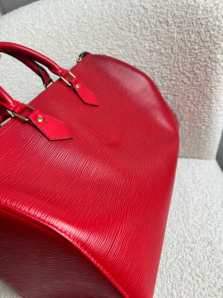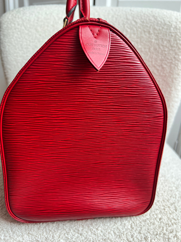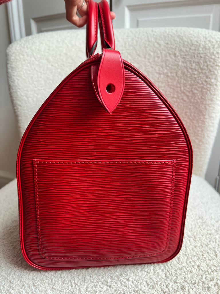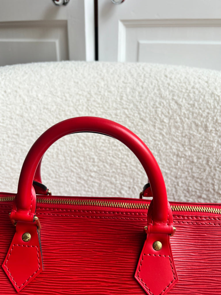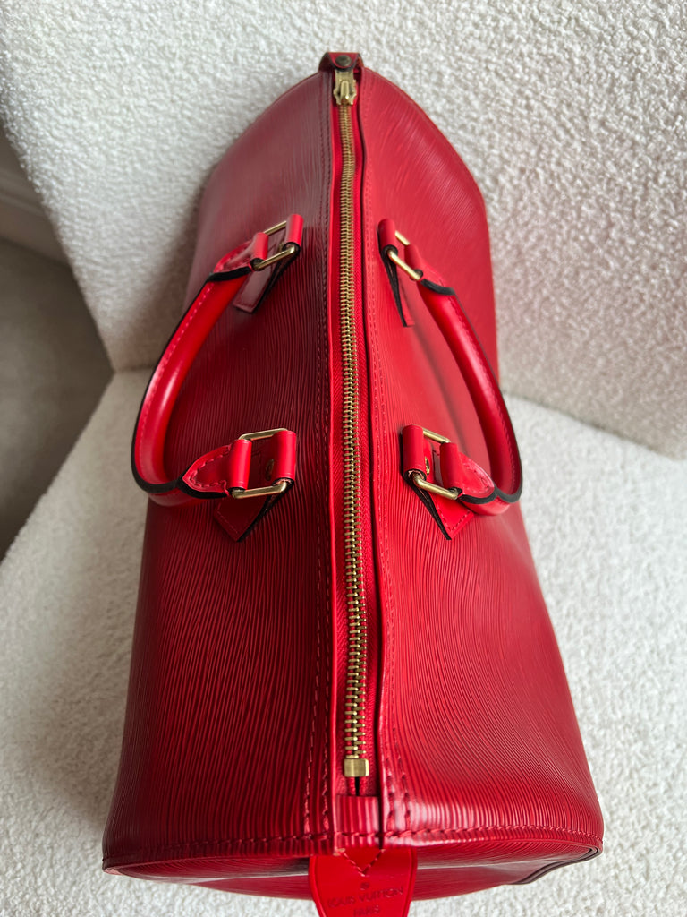 Louis Vuitton Speedy 35 in Red Epi Leather with Gold hardware. The classic speedy style is one of Louis Vuitton's most popular styles and is stunning in the luxurious Epi leather. This style is timeless and elegant and is perfect for day to day use. Slightly slouchy in shape, the Speedy features two top handles and can be carried by hand or in the crook of the arm.