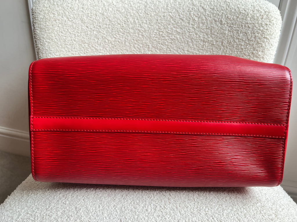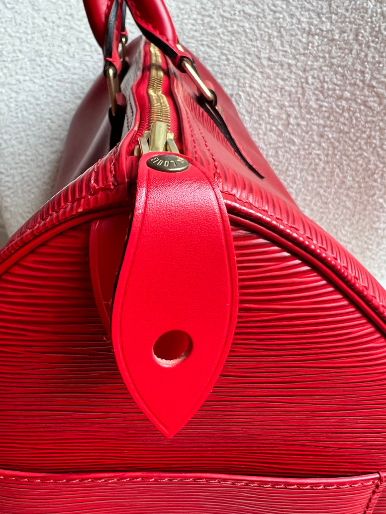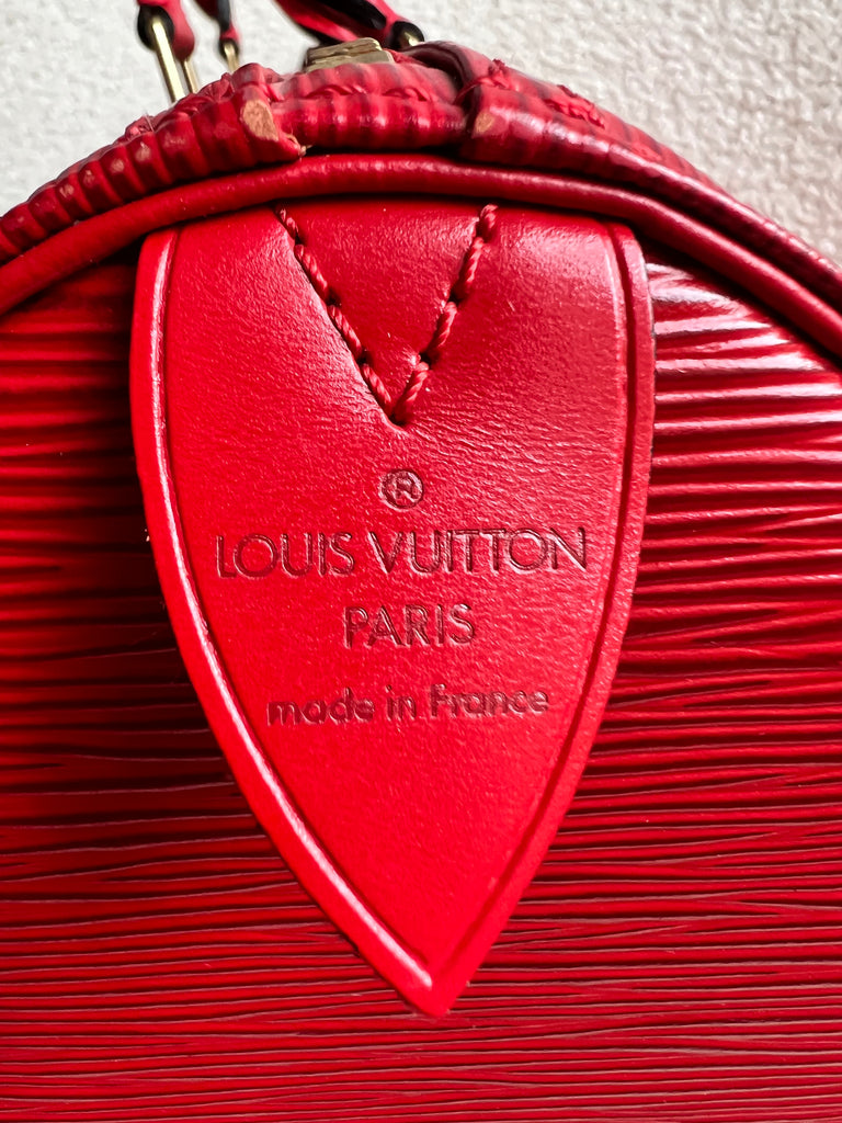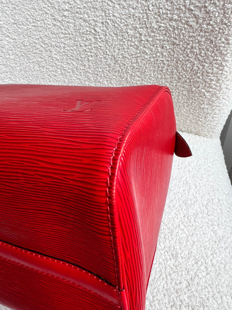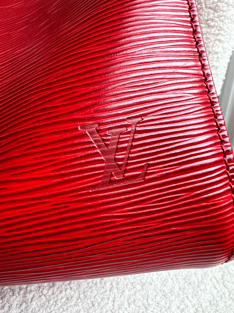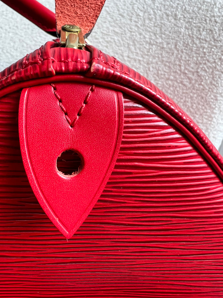 Louis Vuitton Speedy 35 in Red Epi Leather with Gold hardware. The classic speedy style is one of Louis Vuitton's most popular styles and is stunning in the luxurious Epi leather. This style is timeless and elegant and is perfect for day to day use. Slightly slouchy in shape, the Speedy features two top handles and can be carried by hand or in the crook of the arm.
