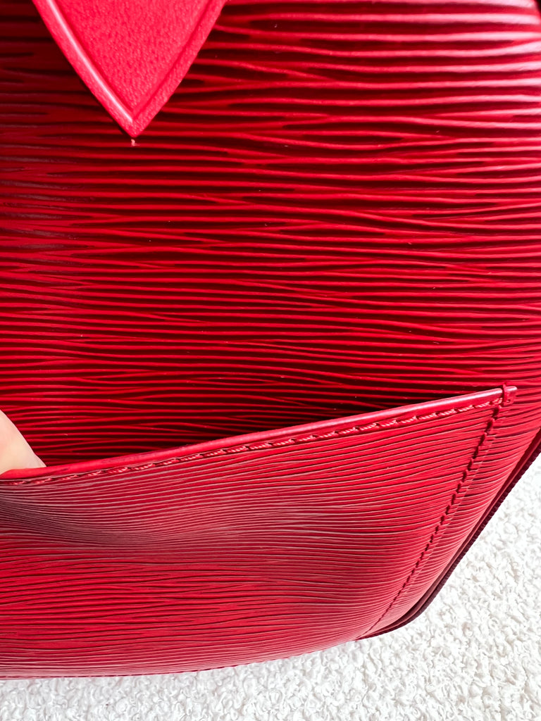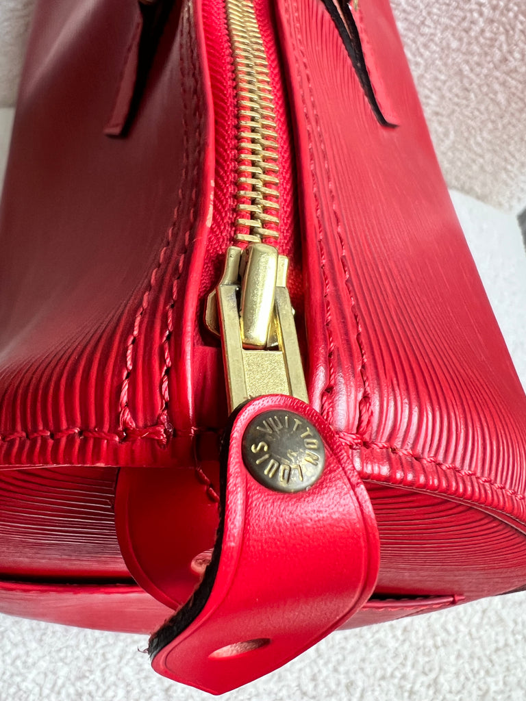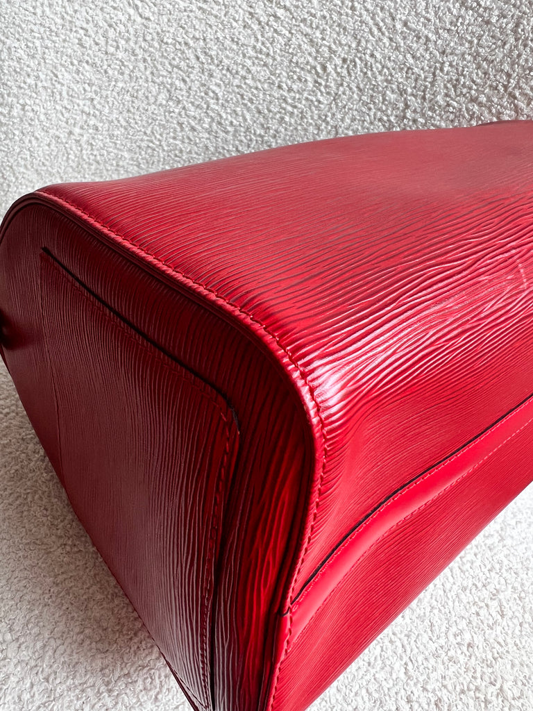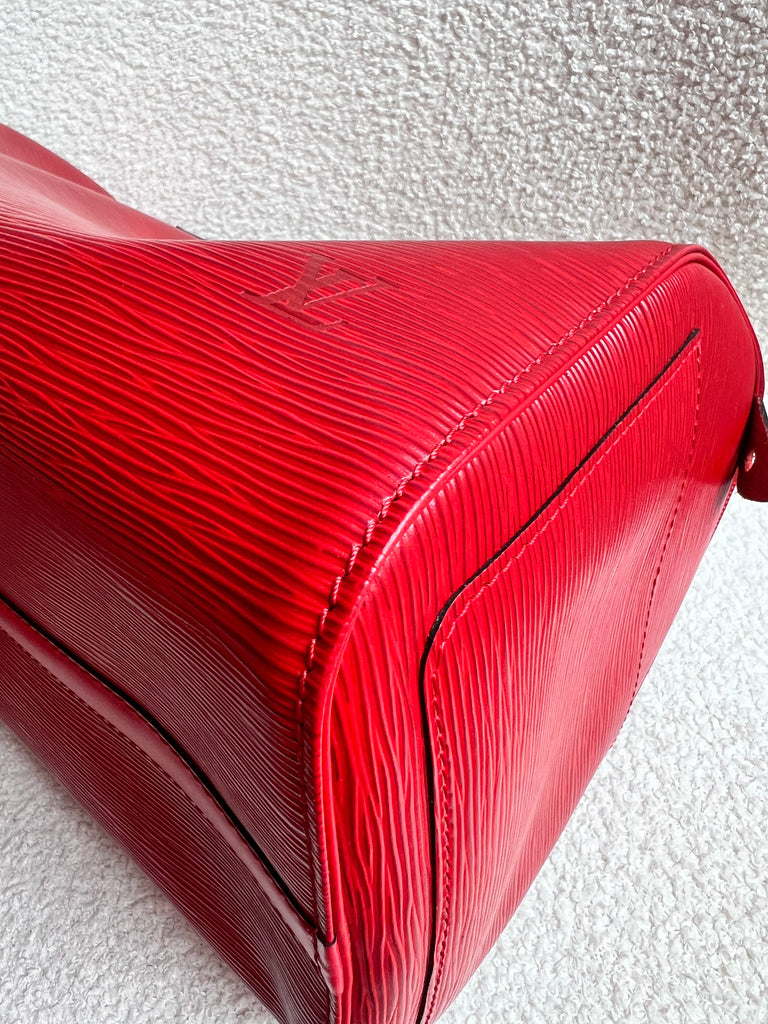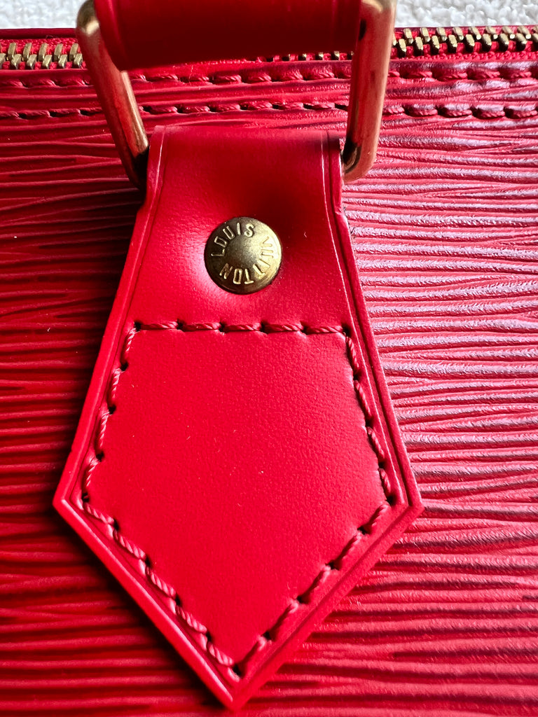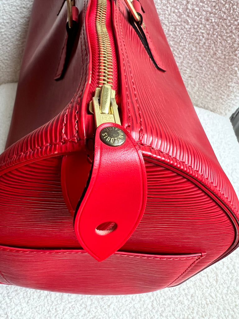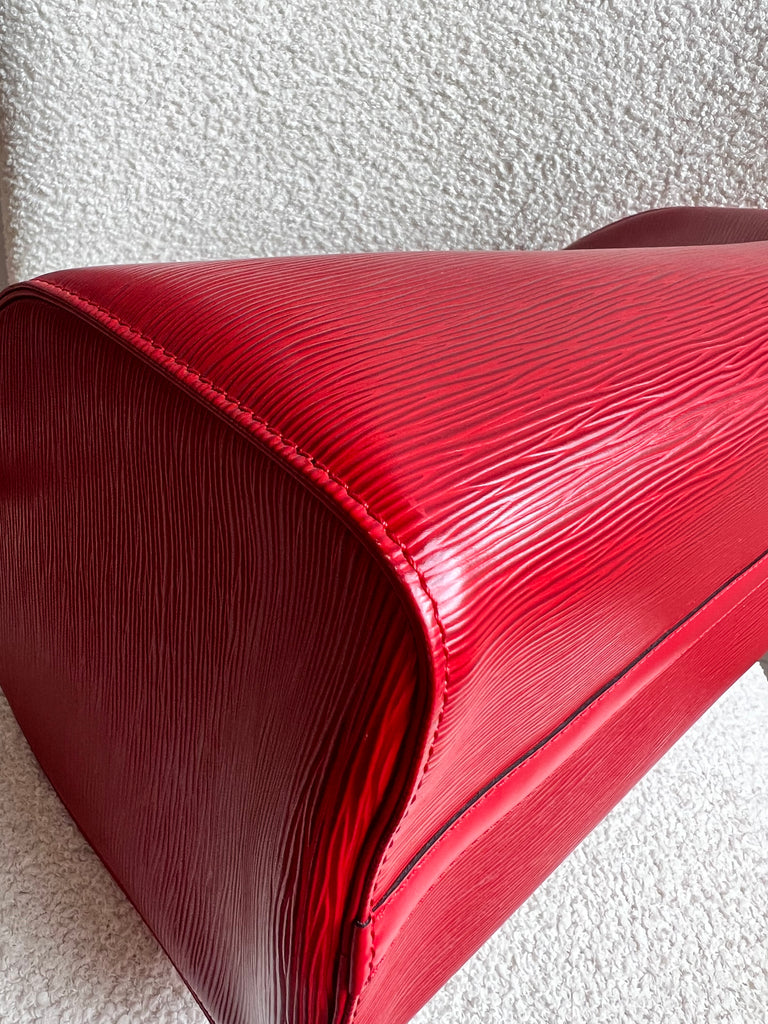 Louis Vuitton Speedy 35 in Red Epi Leather with Gold hardware. The classic speedy style is one of Louis Vuitton's most popular styles and is stunning in the luxurious Epi leather. This style is timeless and elegant and is perfect for day to day use. Slightly slouchy in shape, the Speedy features two top handles and can be carried by hand or in the crook of the arm.