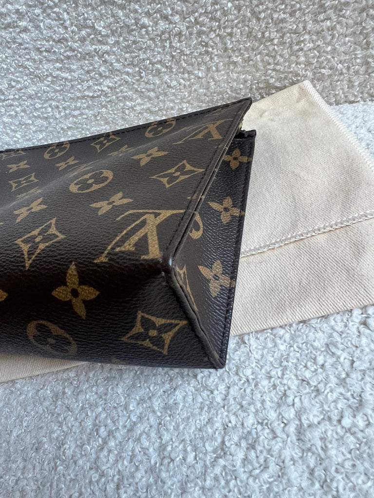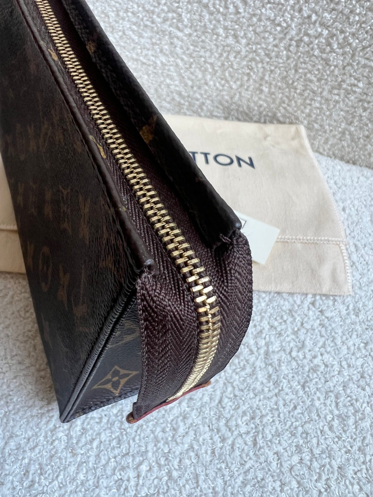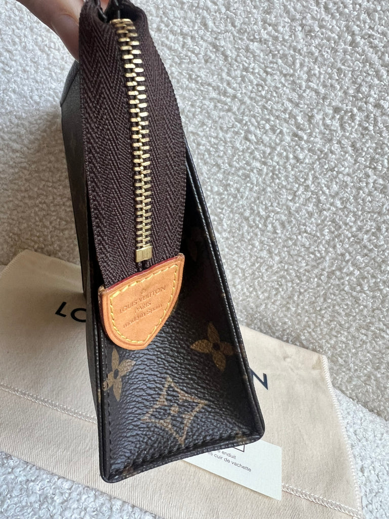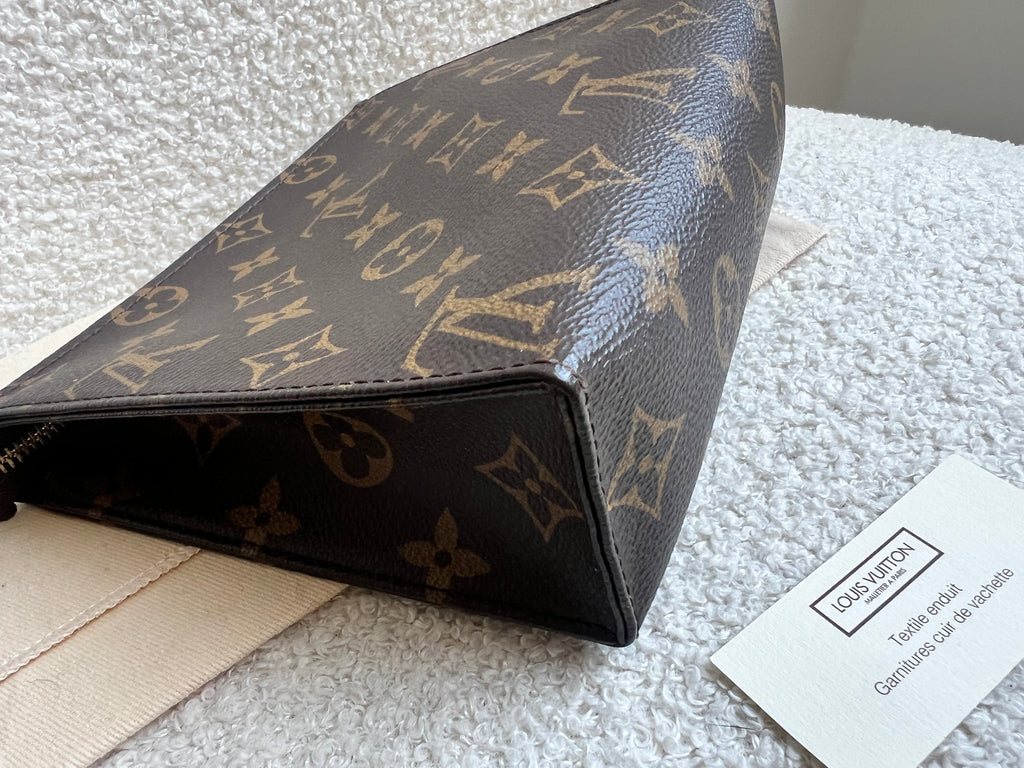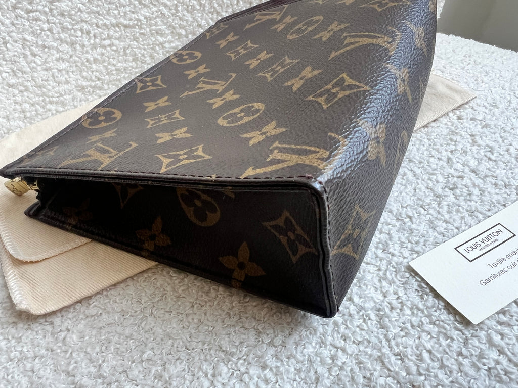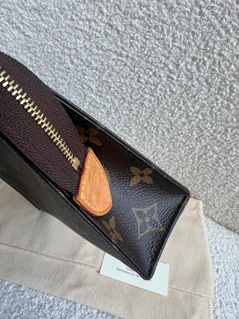 Louis Vuitton Toiletry Pouch 19 in Monogram. This highly sought after item is now discontinued. This mid sized pouch in monogram canvas features a washable lining and easily slips into a handbag. Zipper closure and can also be used as a clutch. 2018 year.