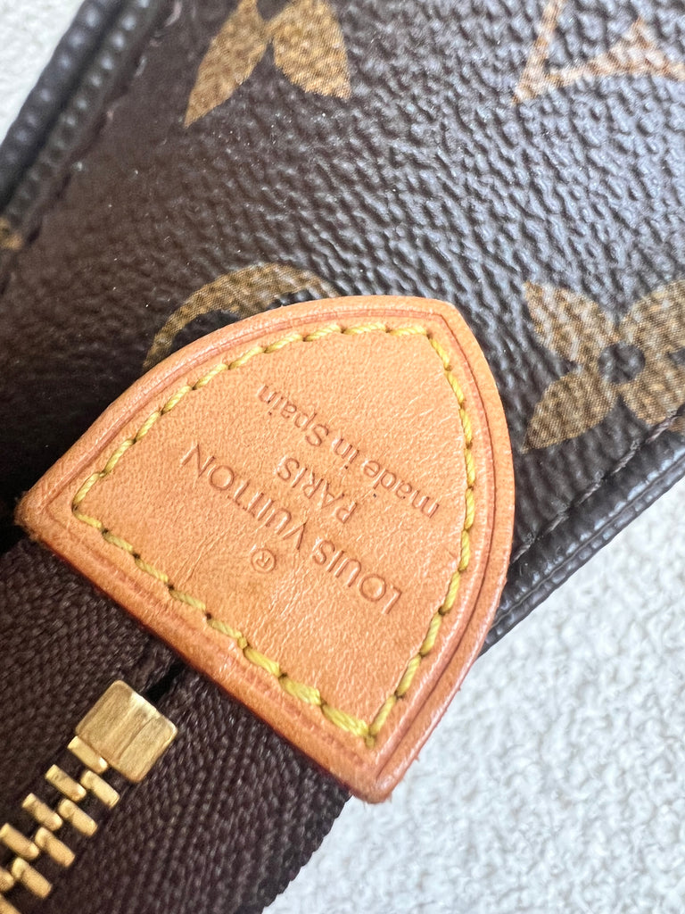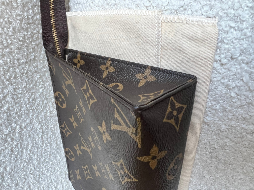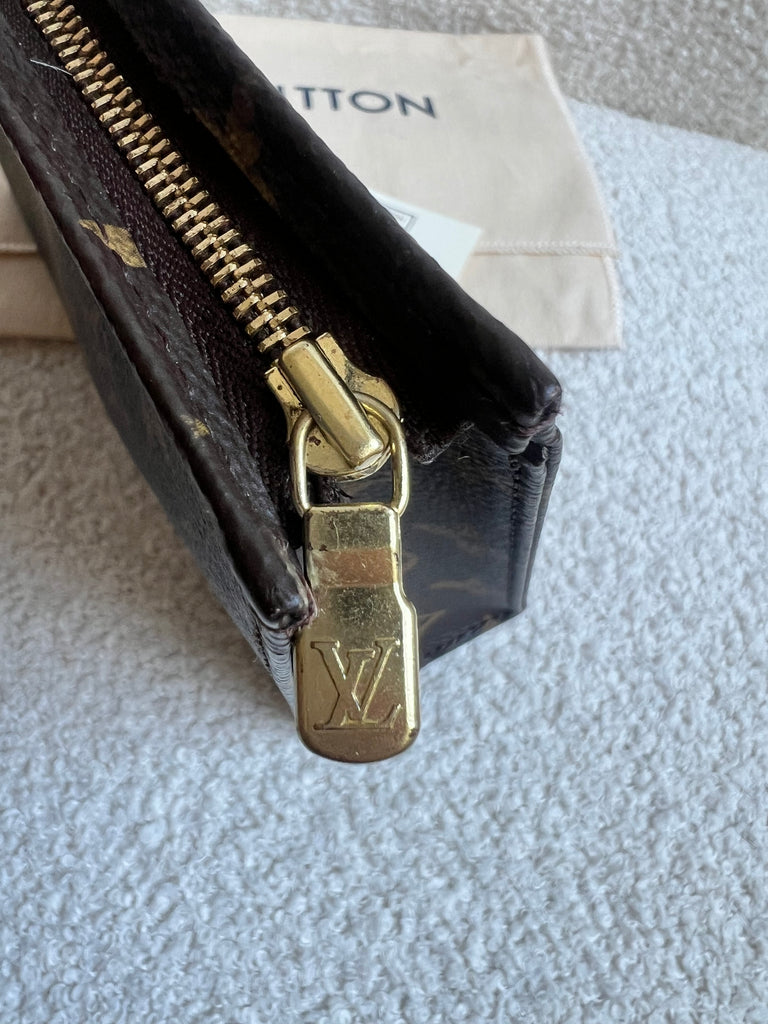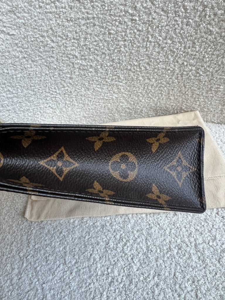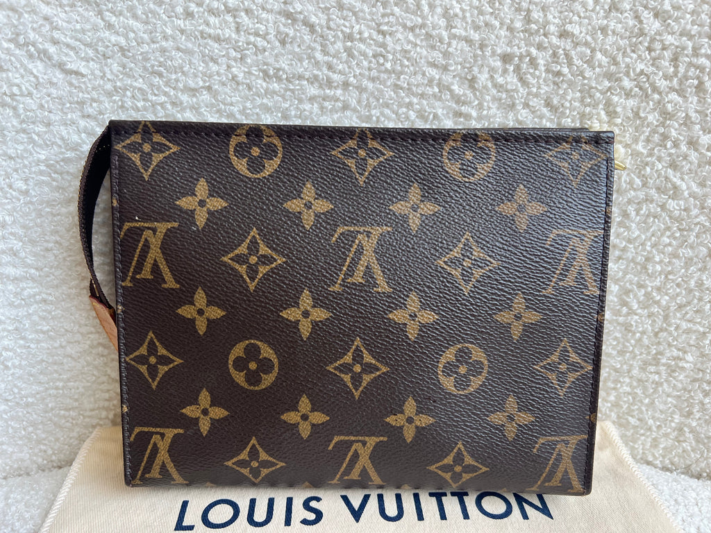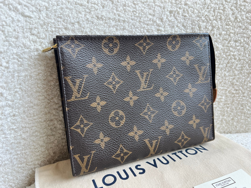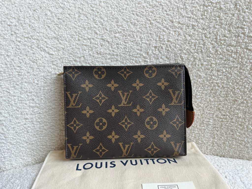 Louis Vuitton Toiletry Pouch 19 in Monogram. This highly sought after item is now discontinued. This mid sized pouch in monogram canvas features a washable lining and easily slips into a handbag. Zipper closure and can also be used as a clutch. 2018 year.