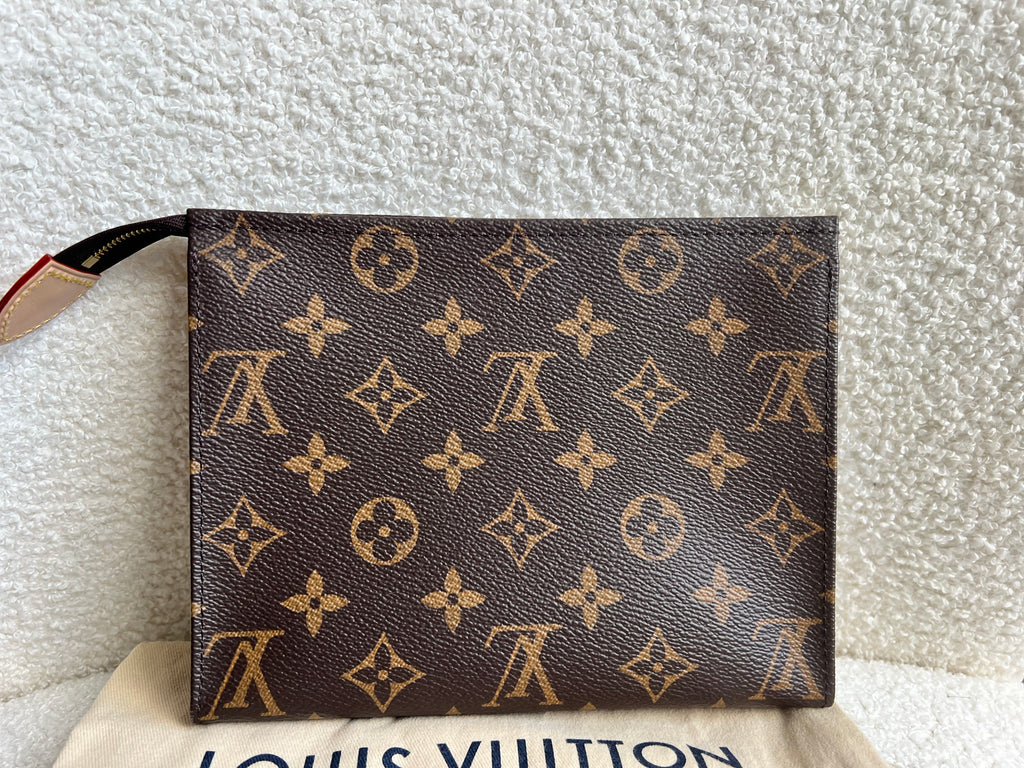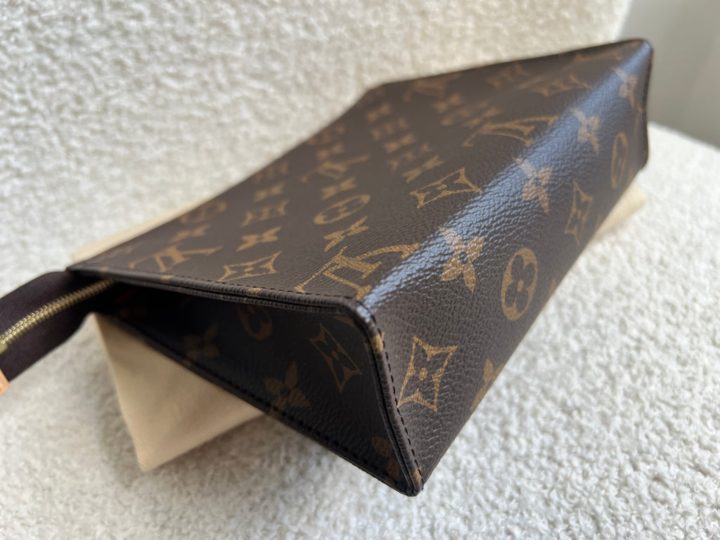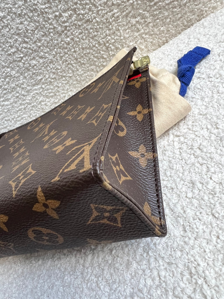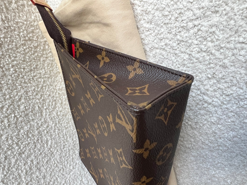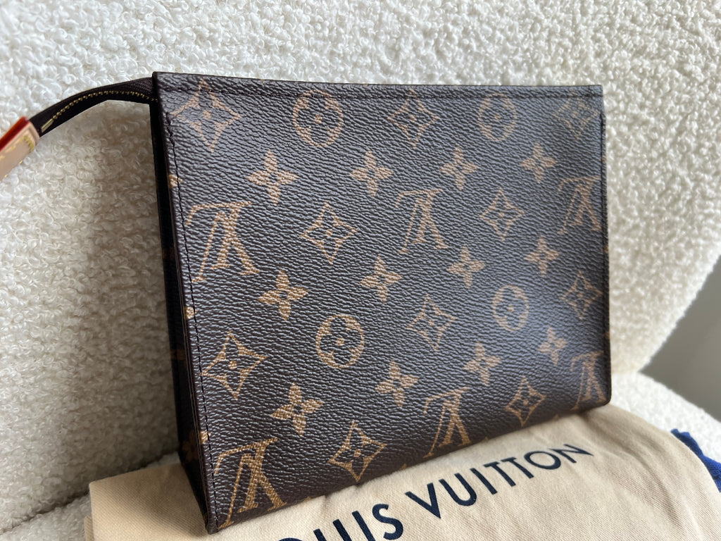 Louis Vuitton Toiletry Pouch 19 in Monogram. This highly sought after item is crafted from monogram canvas with a red interior. This mid sized pouch in monogram canvas features a washable lining and easily slips into a handbag. Zipper closure and can also be used as a clutch. Microchip item so post 2021.