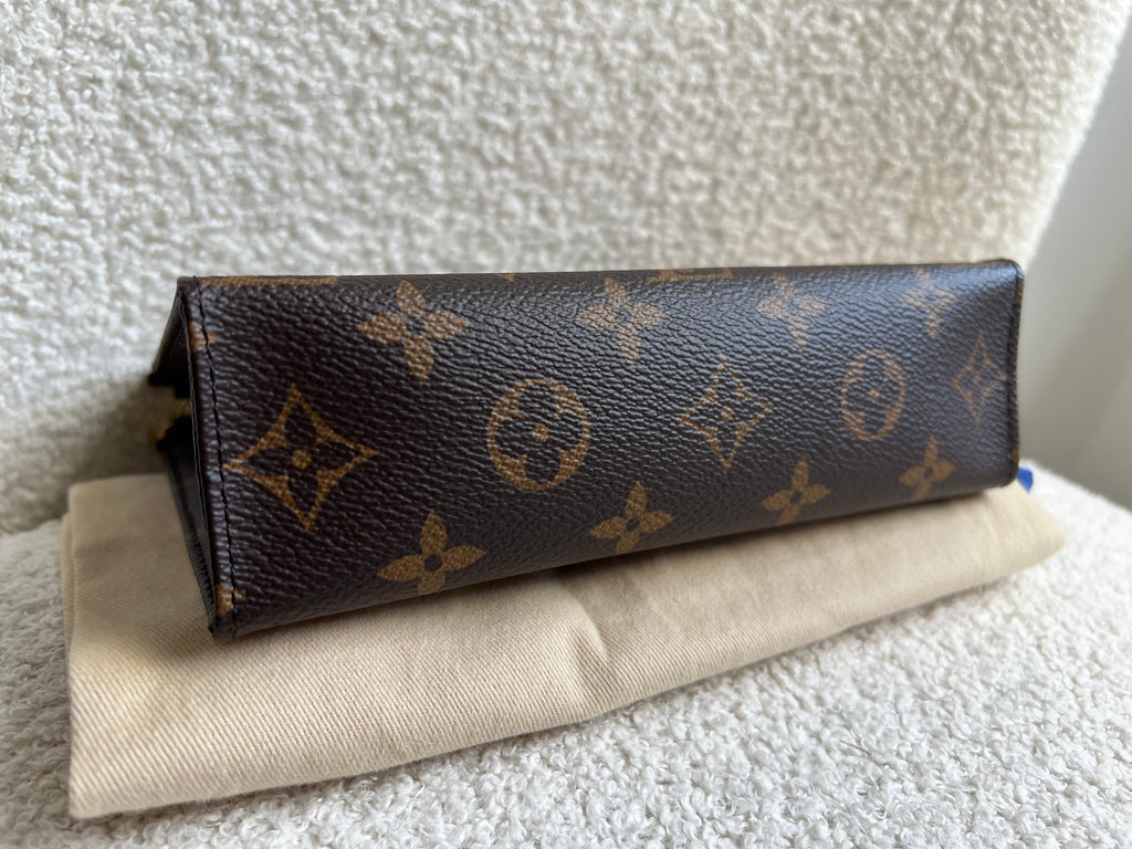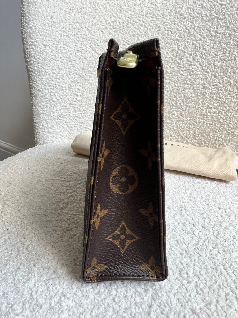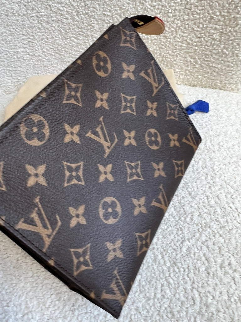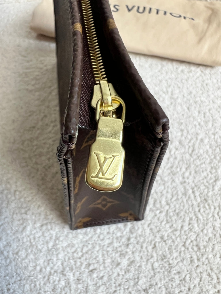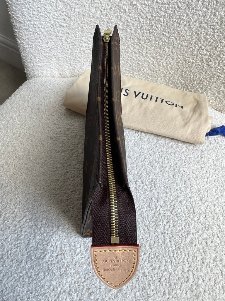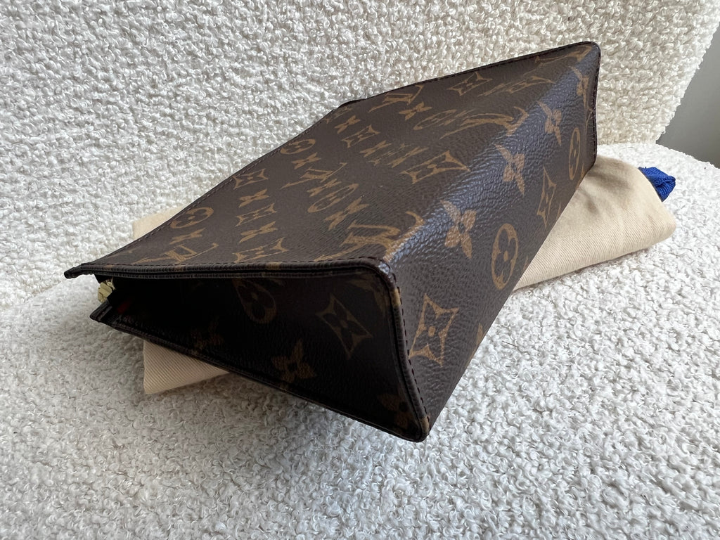 Louis Vuitton Toiletry Pouch 19 in Monogram. This highly sought after item is crafted from monogram canvas with a red interior. This mid sized pouch in monogram canvas features a washable lining and easily slips into a handbag. Zipper closure and can also be used as a clutch. Microchip item so post 2021.