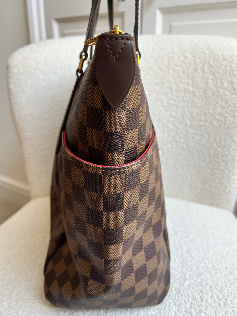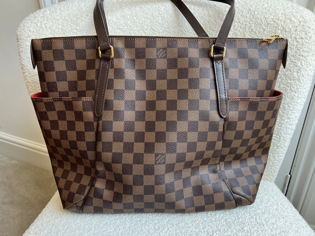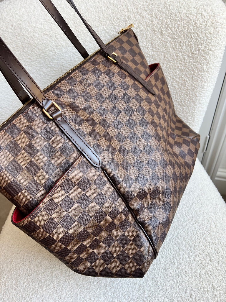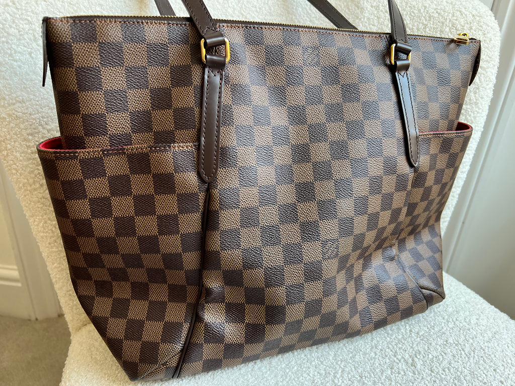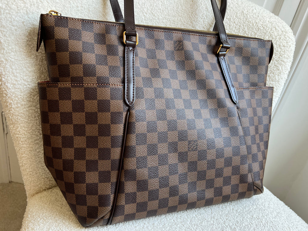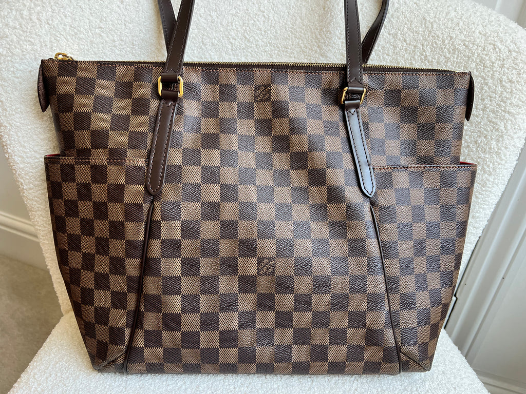 Louis Vuitton Totally MM Tote in Damier Ebene canvas with gold hardware. The Totally is an easy to wear, lightweight shoulder tote and is a classic, practical bag. The larger size of the totally and is roomy inside making it ideal for a day to day or work bag. Can be carried in the crook of the arm or comfortably over the shoulder using the two top handles. Great alternative to the Neverfull with sturdier handles and a more secure (zipped) closure.