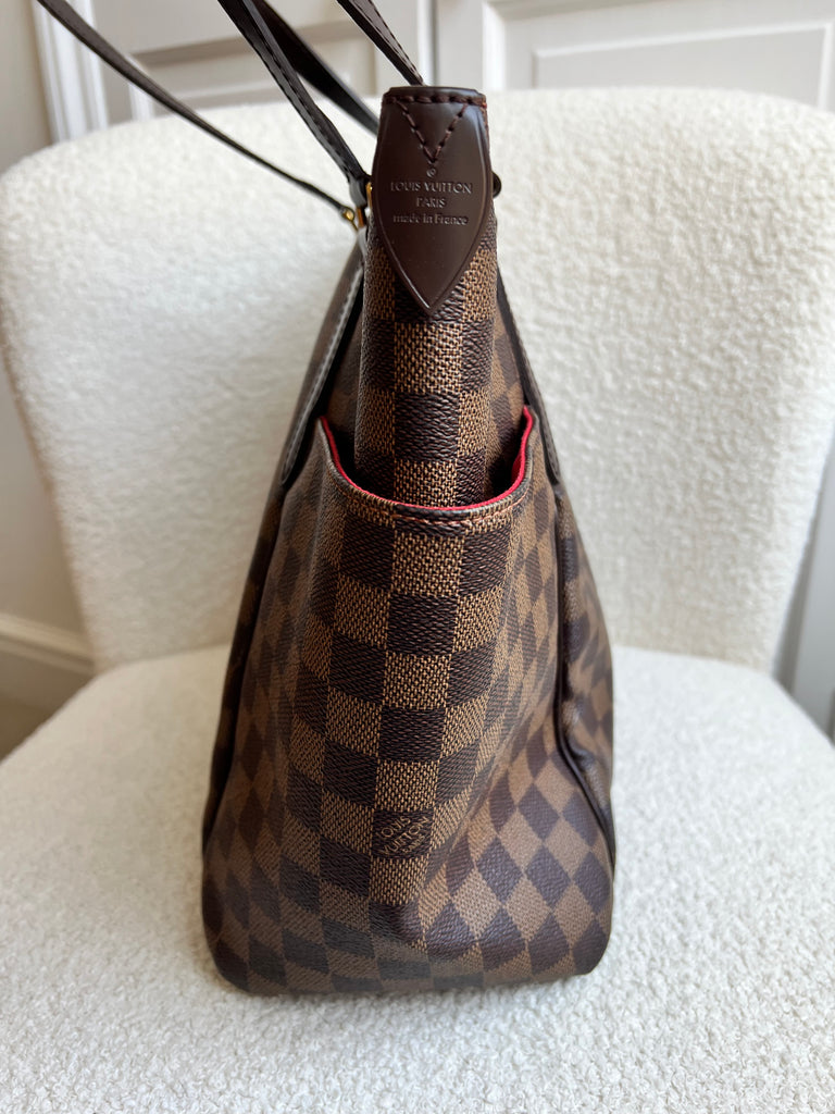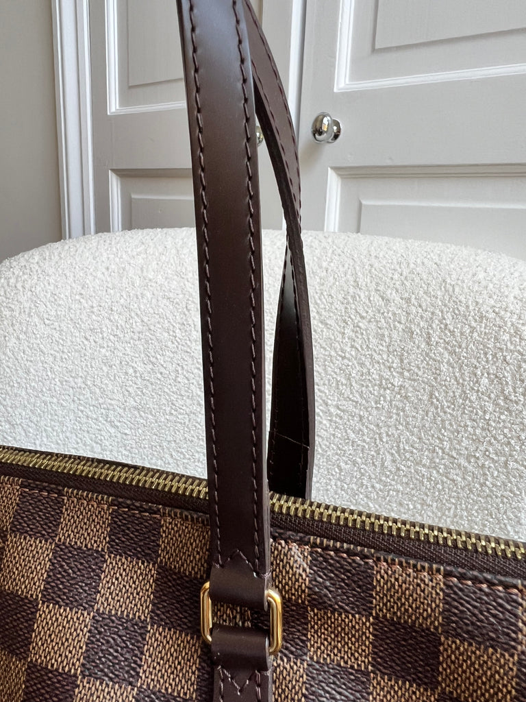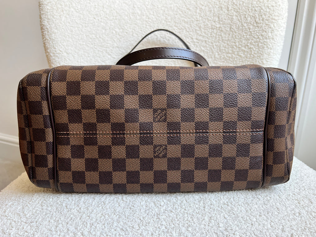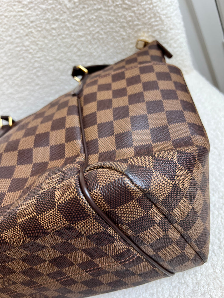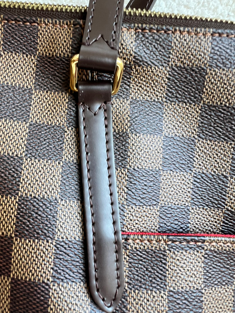 Louis Vuitton Totally MM Tote in Damier Ebene canvas with gold hardware. The Totally is an easy to wear, lightweight shoulder tote and is a classic, practical bag. The larger size of the totally and is roomy inside making it ideal for a day to day or work bag. Can be carried in the crook of the arm or comfortably over the shoulder using the two top handles. Great alternative to the Neverfull with sturdier handles and a more secure (zipped) closure.