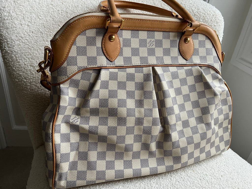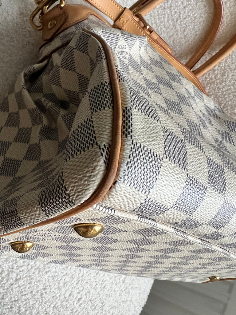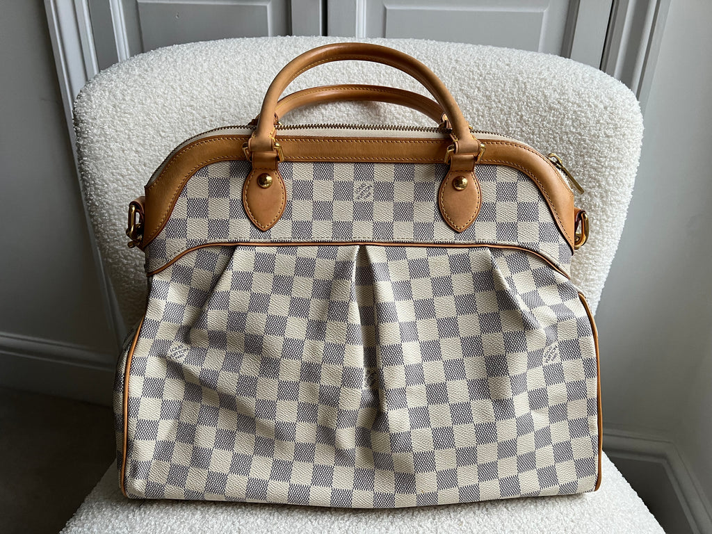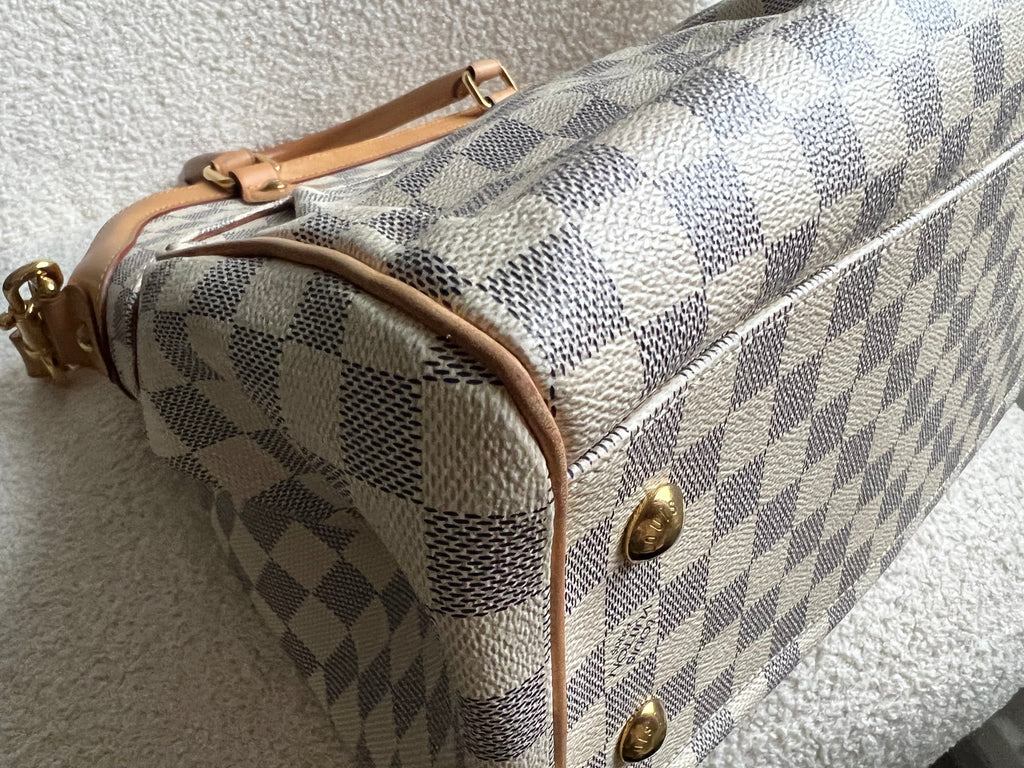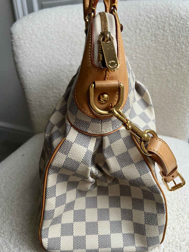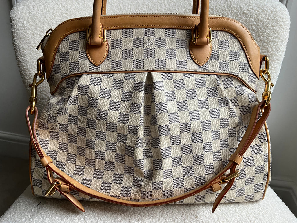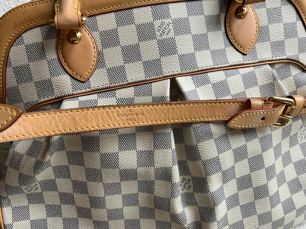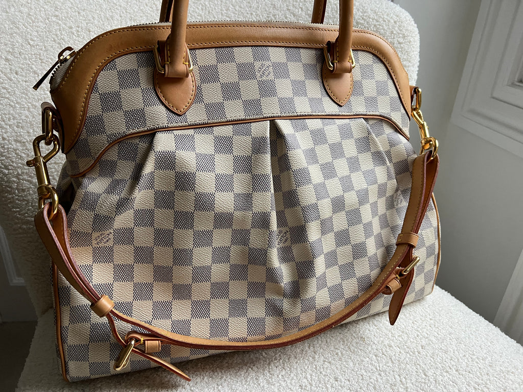 Louis Vuitton Trevi GM in Damier Azur Canvas and gold tone hardware. This elegant, practical shoulder bag has a slight slouch and features top handles and an adjustable shoulder strap. Ideal for day to day use and zip top closure to secure your belongings. Can be carried in hand using short top handles or over shoulder using detachable shoulder strap.