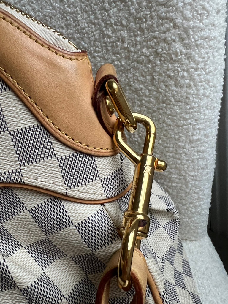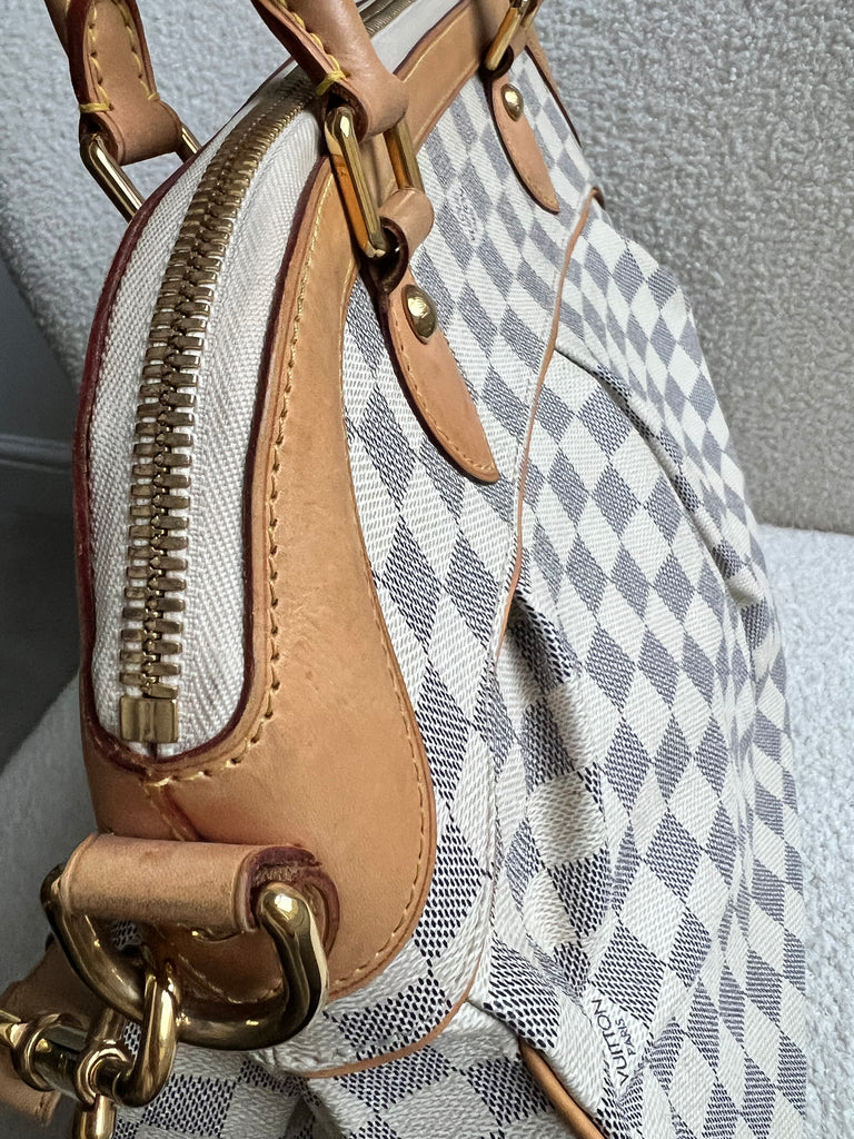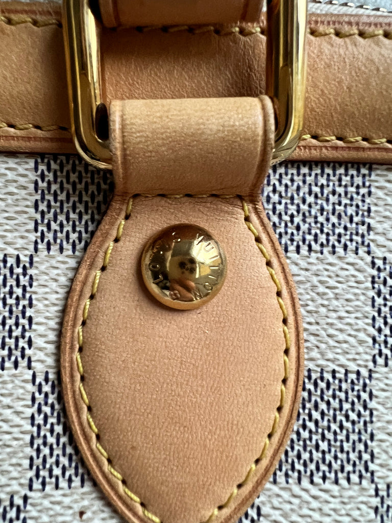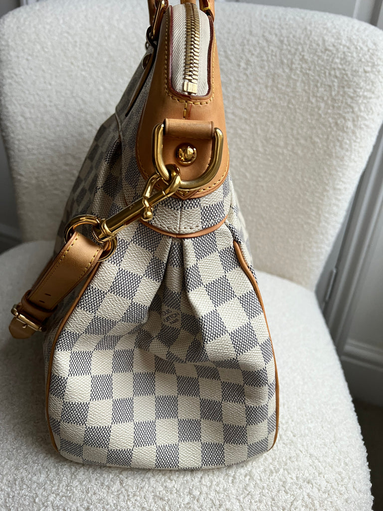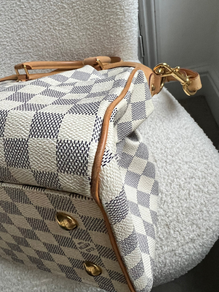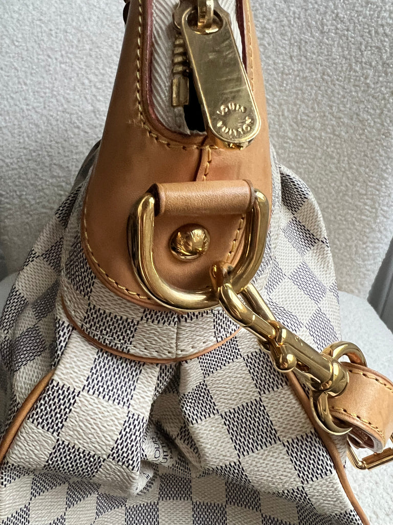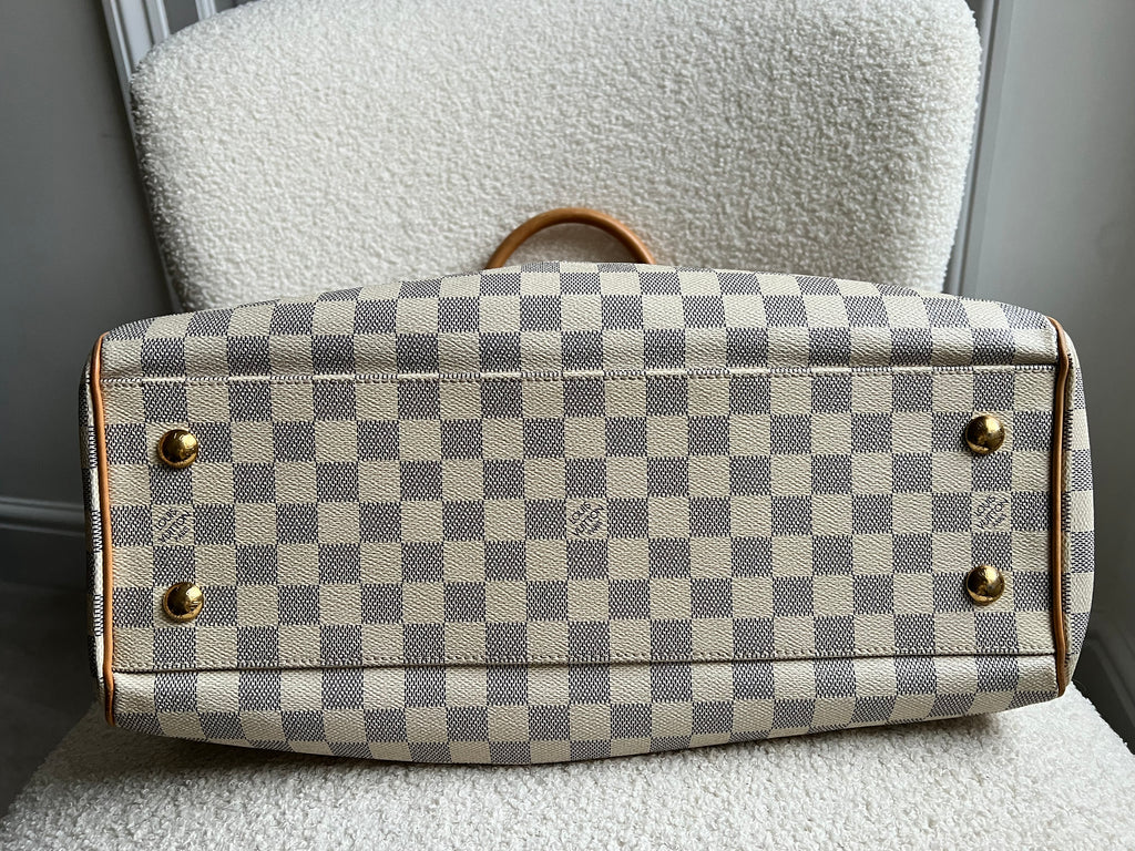 Louis Vuitton Trevi GM in Damier Azur Canvas and gold tone hardware. This elegant, practical shoulder bag has a slight slouch and features top handles and an adjustable shoulder strap. Ideal for day to day use and zip top closure to secure your belongings. Can be carried in hand using short top handles or over shoulder using detachable shoulder strap.