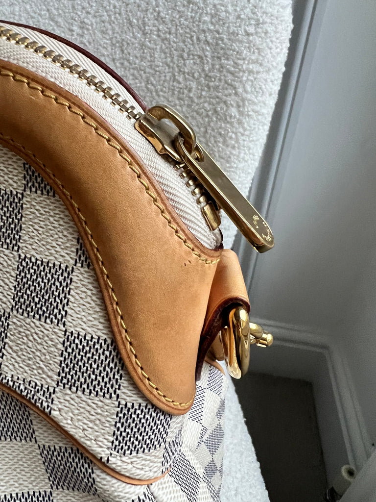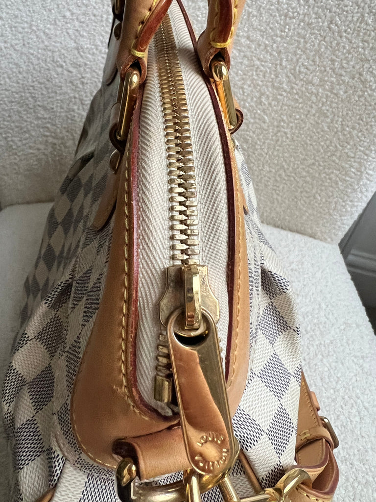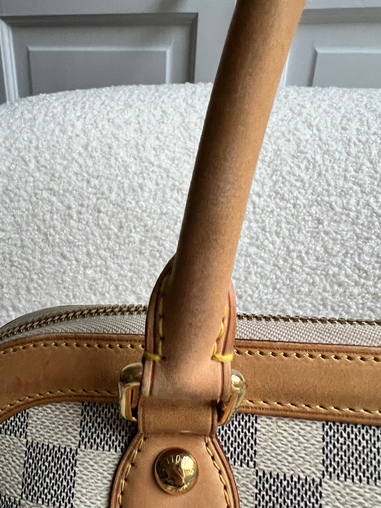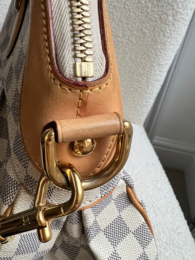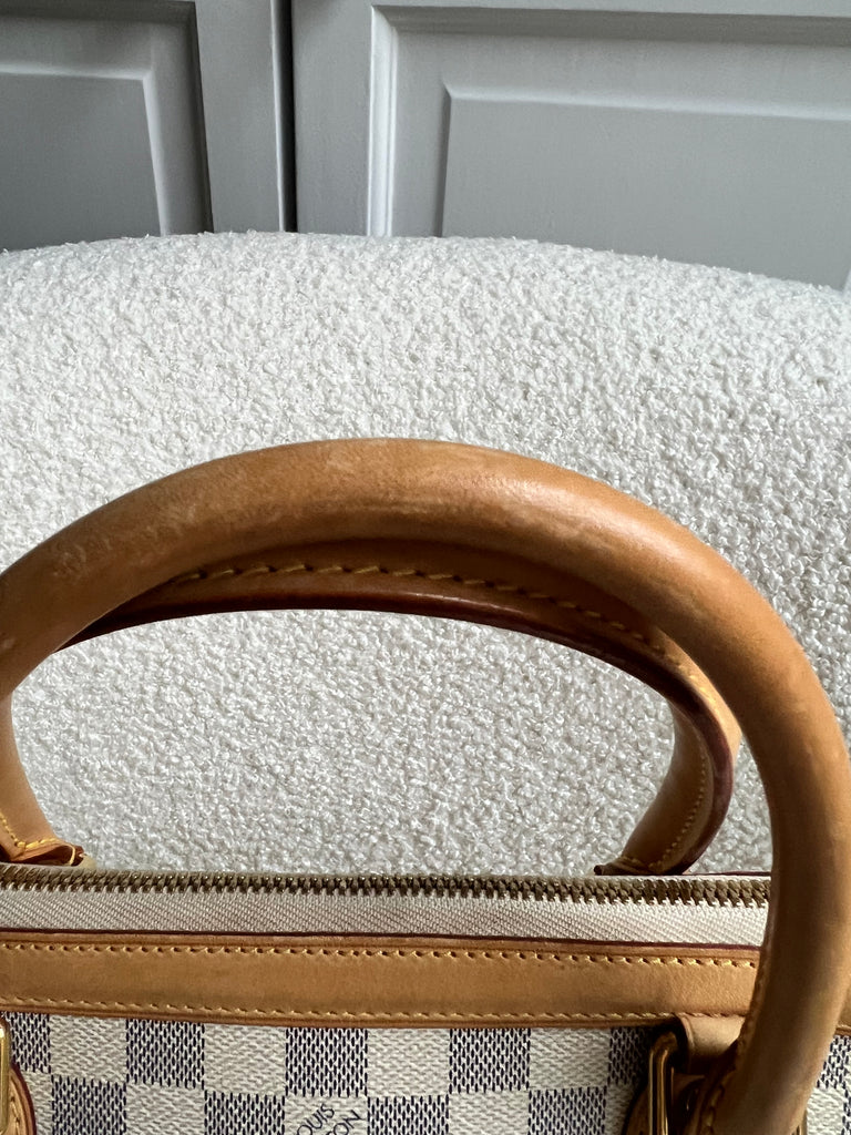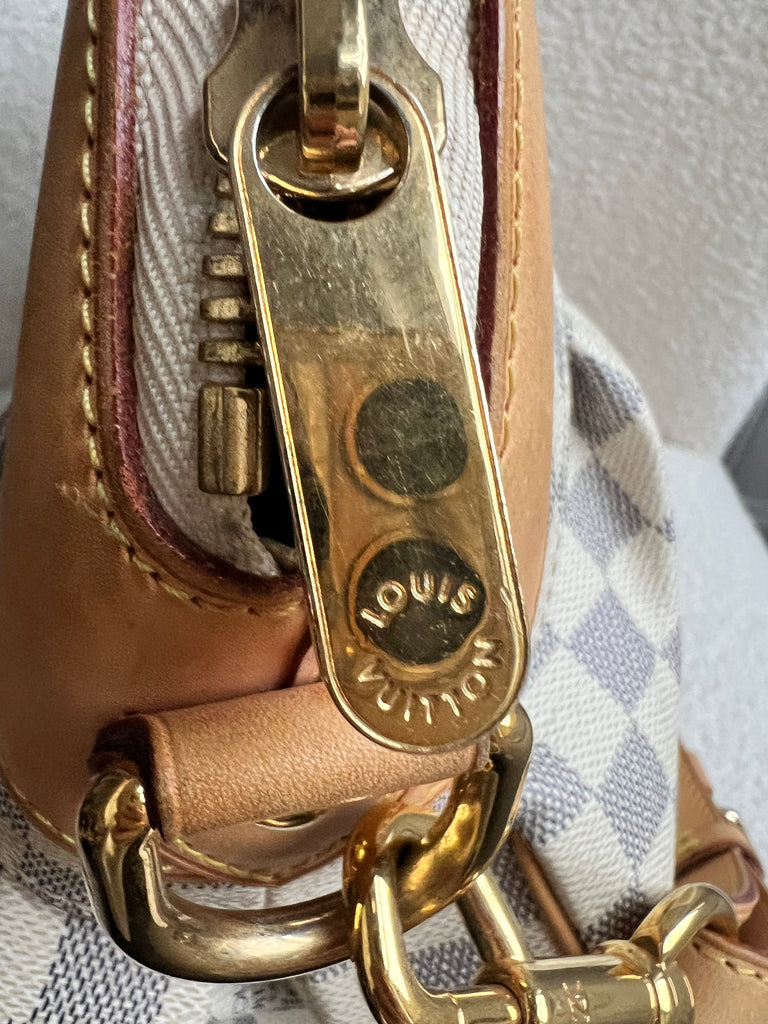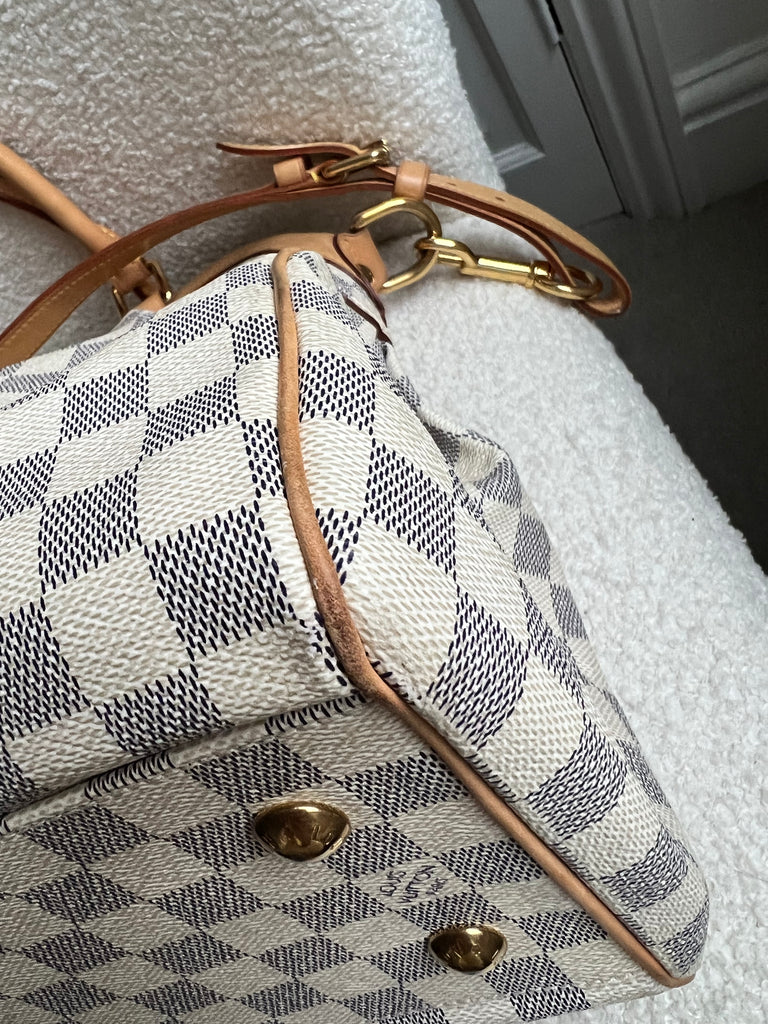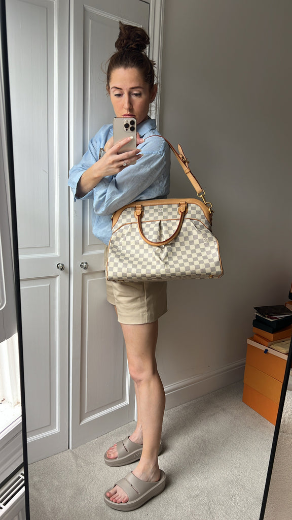 Louis Vuitton Trevi GM in Damier Azur Canvas and gold tone hardware. This elegant, practical shoulder bag has a slight slouch and features top handles and an adjustable shoulder strap. Ideal for day to day use and zip top closure to secure your belongings. Can be carried in hand using short top handles or over shoulder using detachable shoulder strap.