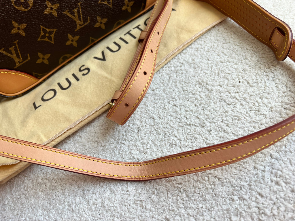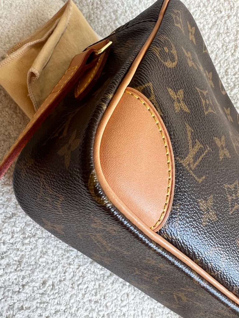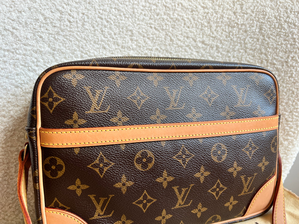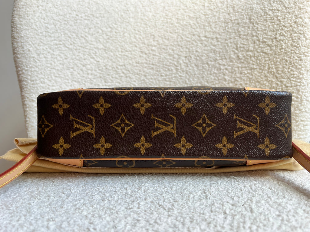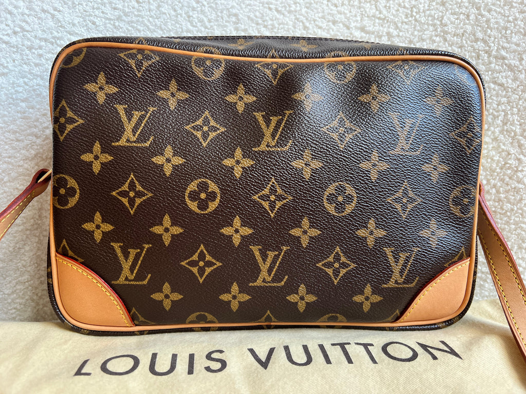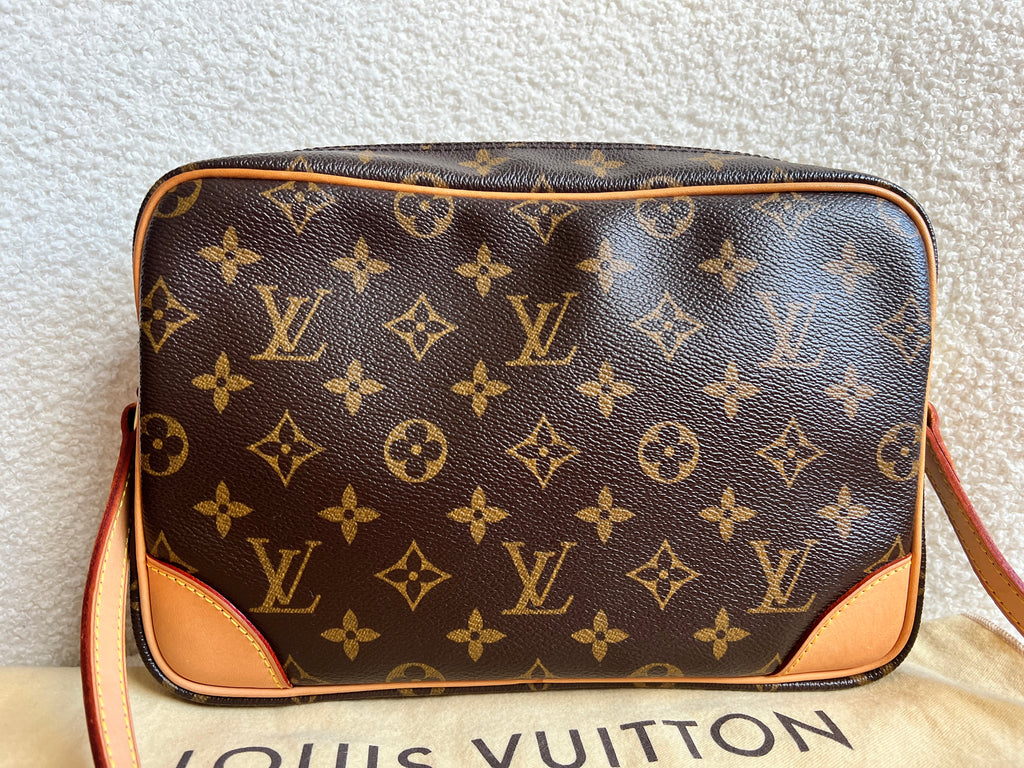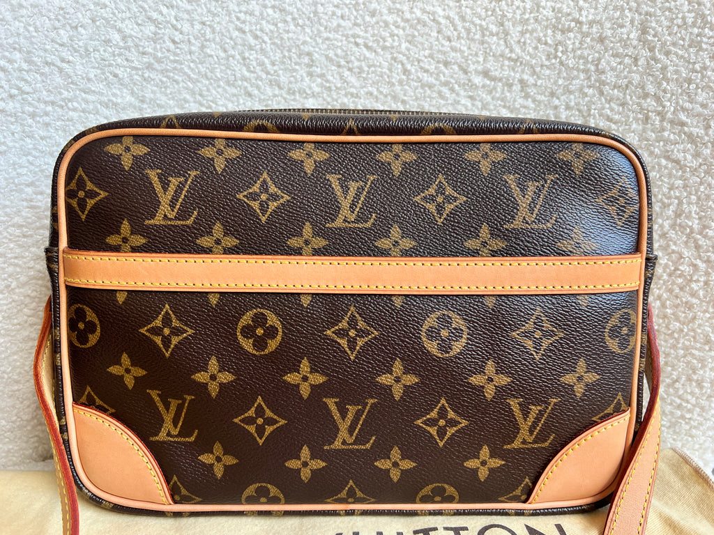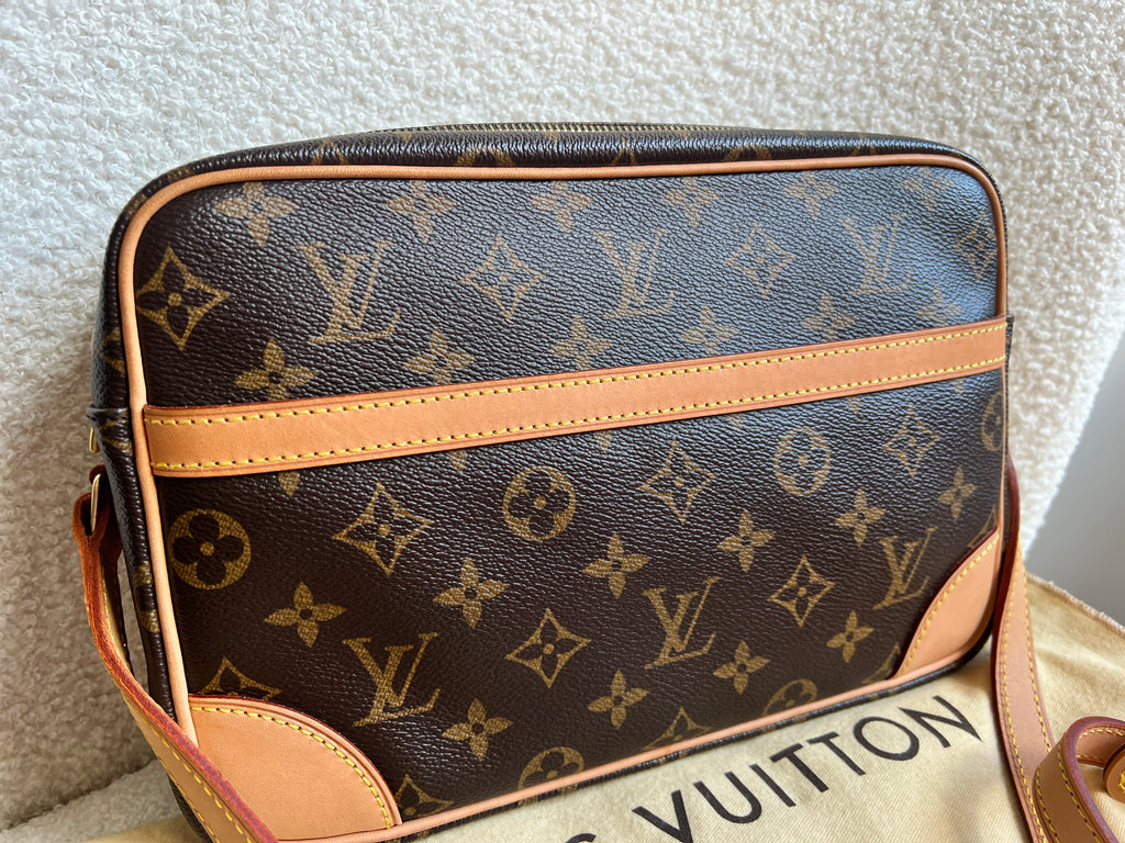 Louis Vuitton Trocadero Bag in Monogram canvas. The cross body style is medium in size and features a leather strap. Front compartment and main compartment with cowhide leather trim. Fairly structured in shape, ideal for day to day use. Can be carried over shoulder or cross body.