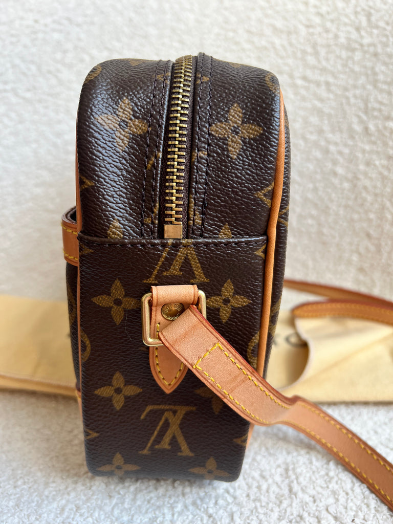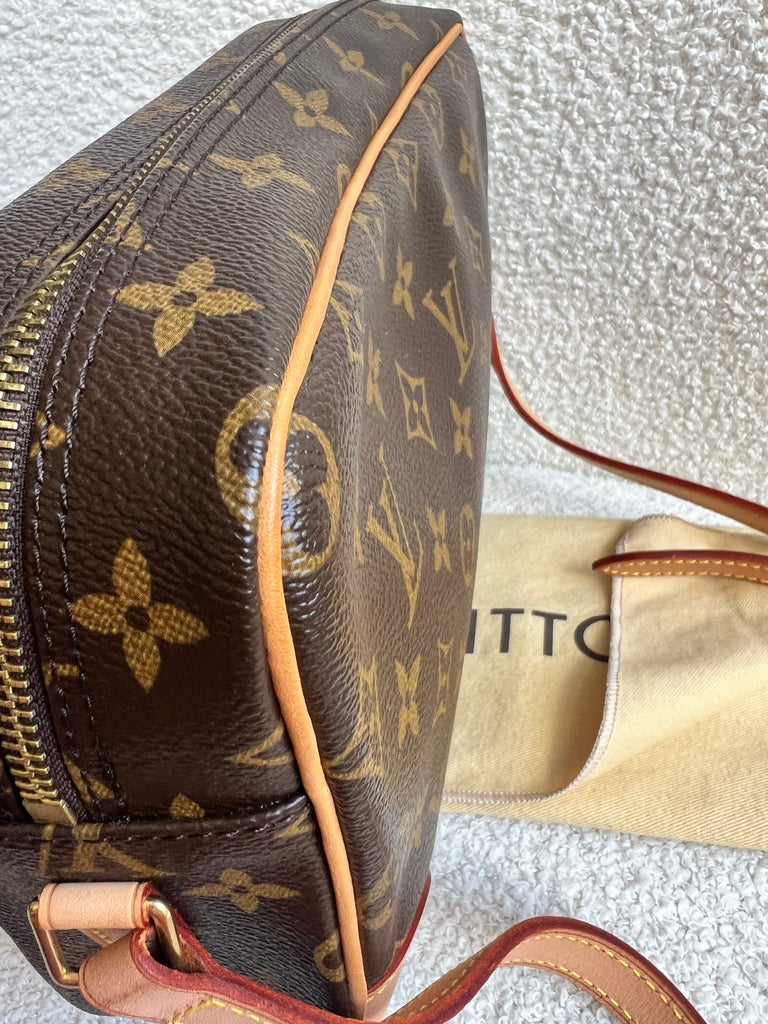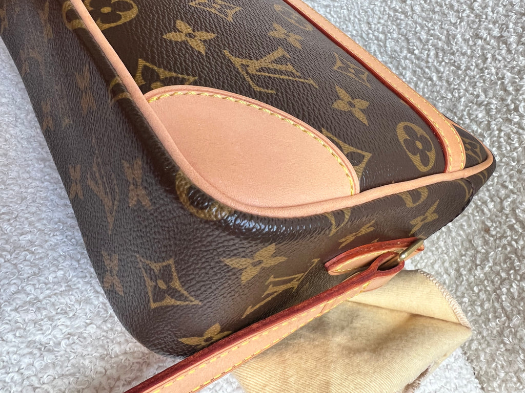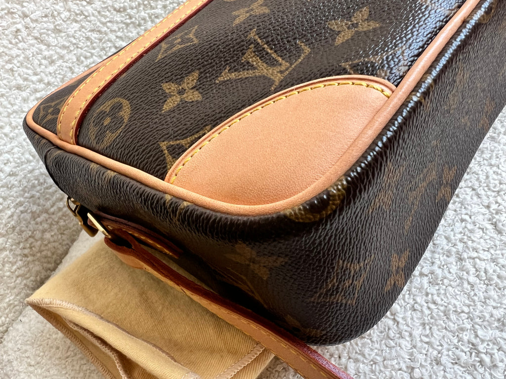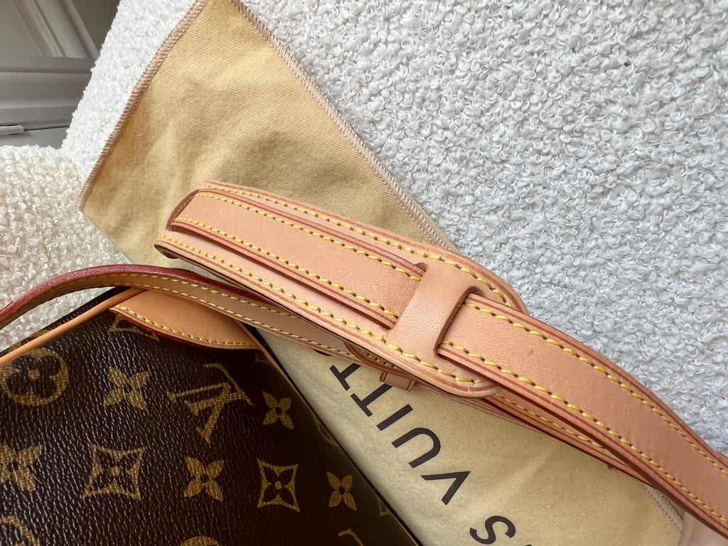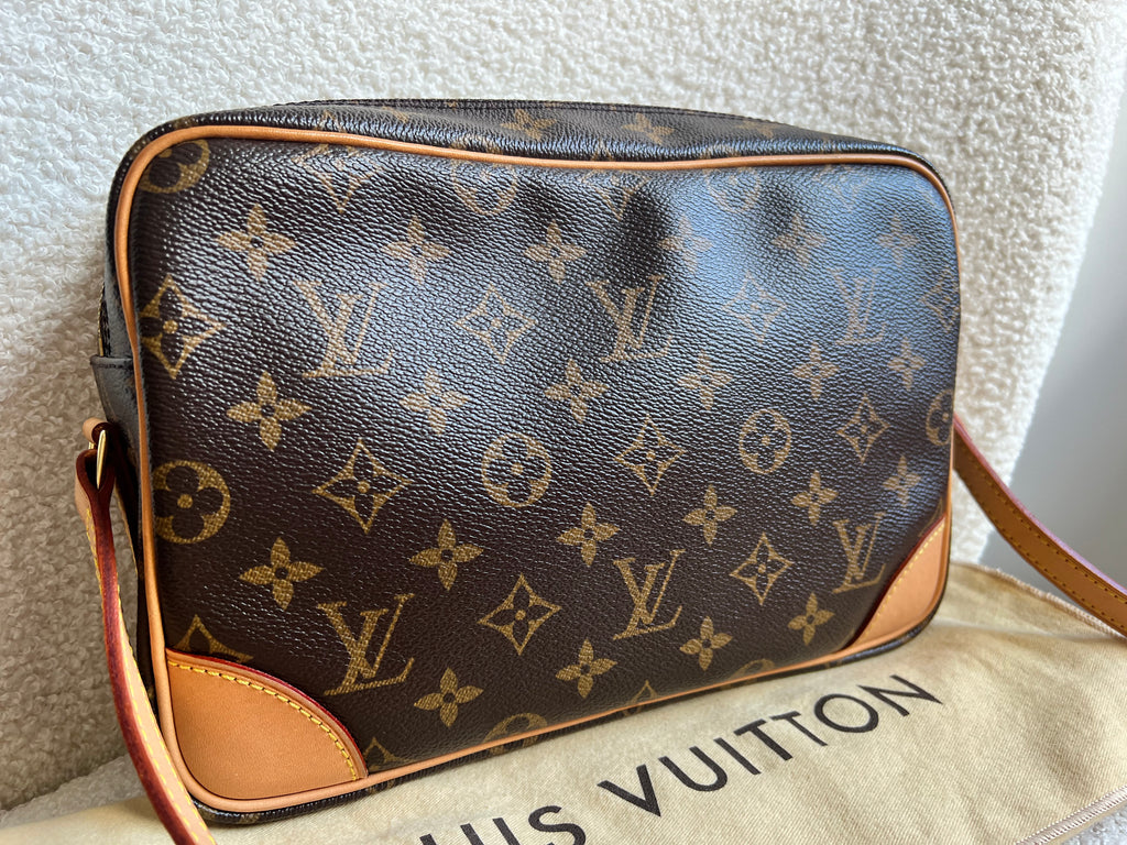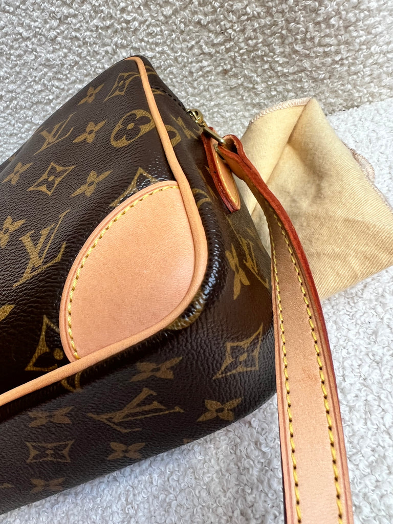 Louis Vuitton Trocadero Bag in Monogram canvas. The cross body style is medium in size and features a leather strap. Front compartment and main compartment with cowhide leather trim. Fairly structured in shape, ideal for day to day use. Can be carried over shoulder or cross body.