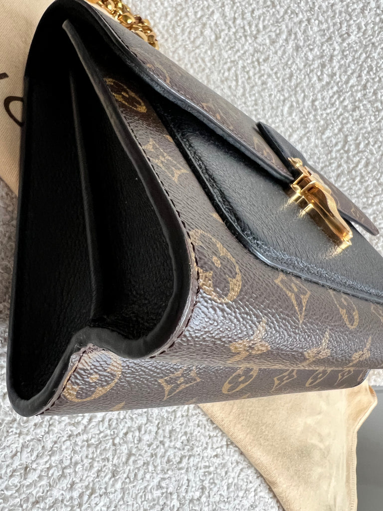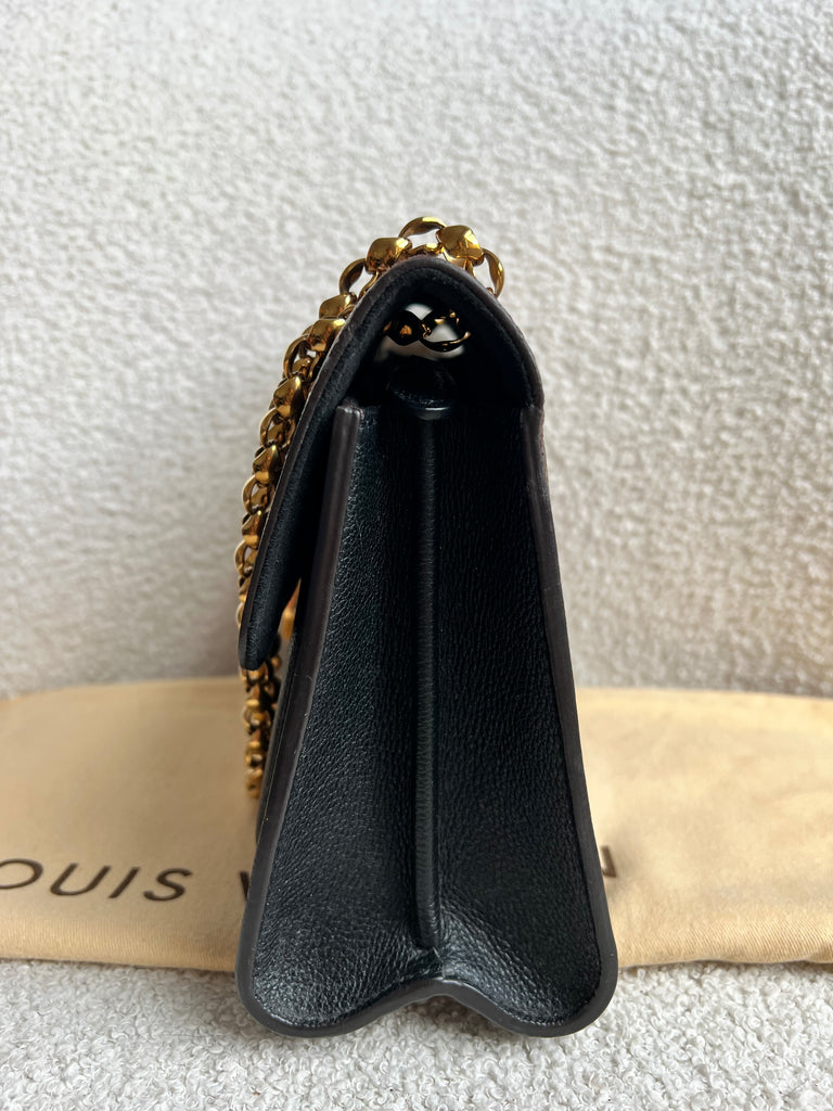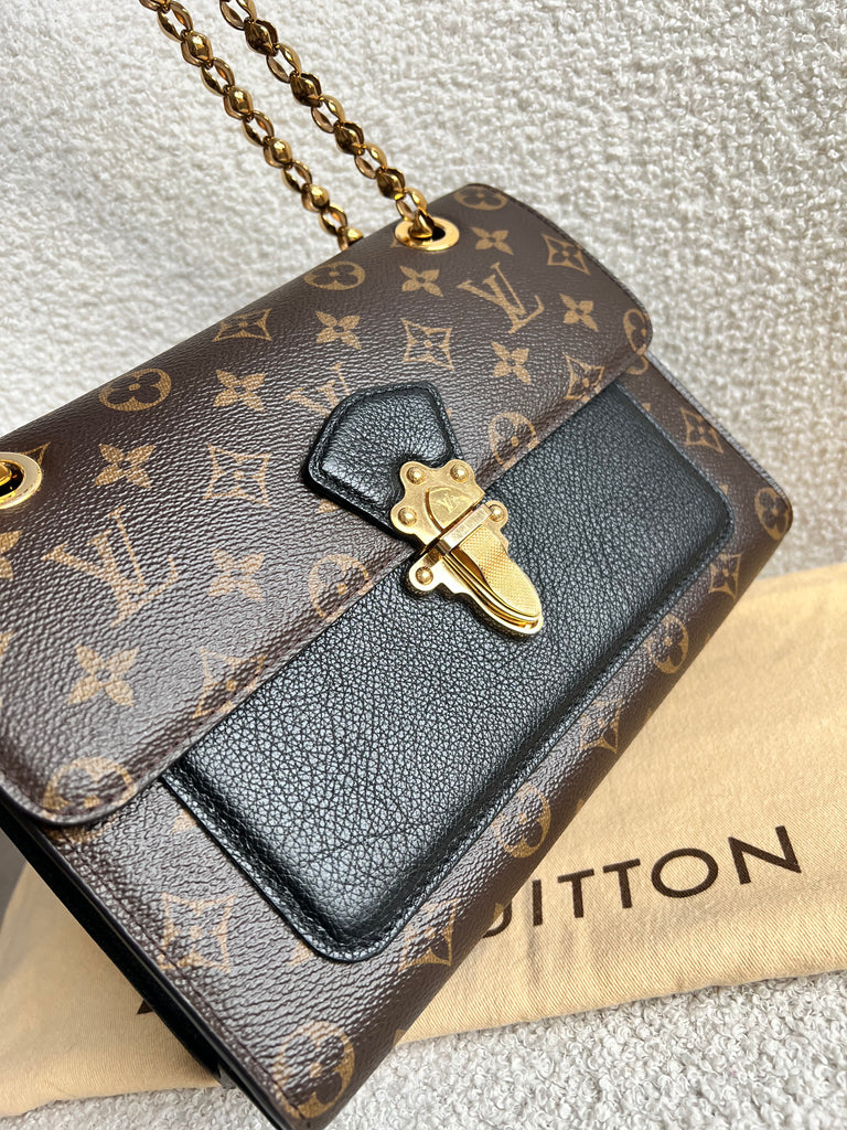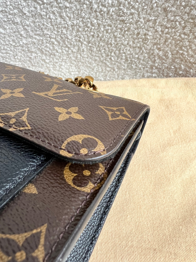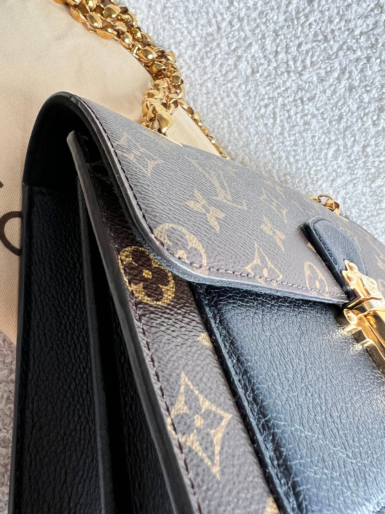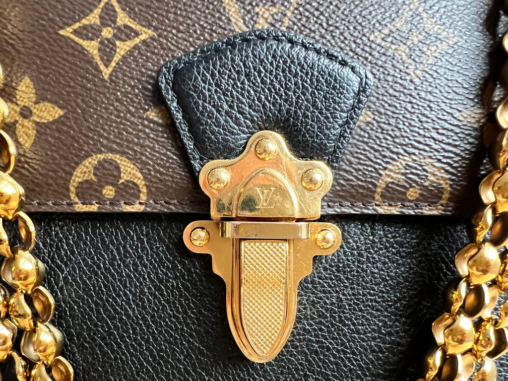 Louis Vuitton Victoire in Monogram and Black. The Victoire chain bag pairs Monogram canvas with smooth black calfskin leather for a sophisticated day-to-evening accessory. The golden clasp is modelled on the lock of classic Louis Vuitton luggage, while the sliding chain strap echoes the Malletage print that lined those historic trunks. Large enough to fit a long wallet and all of the essentials, this style can be worn cross-body with the strap lengthened or over shoulder with the strap doubled. This sought after item is no longer available at LV and it’s last known RRP was £2000 in 2021.