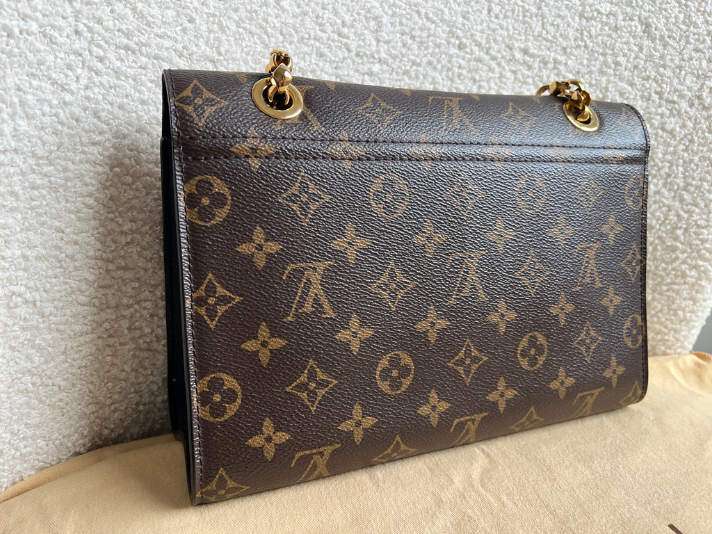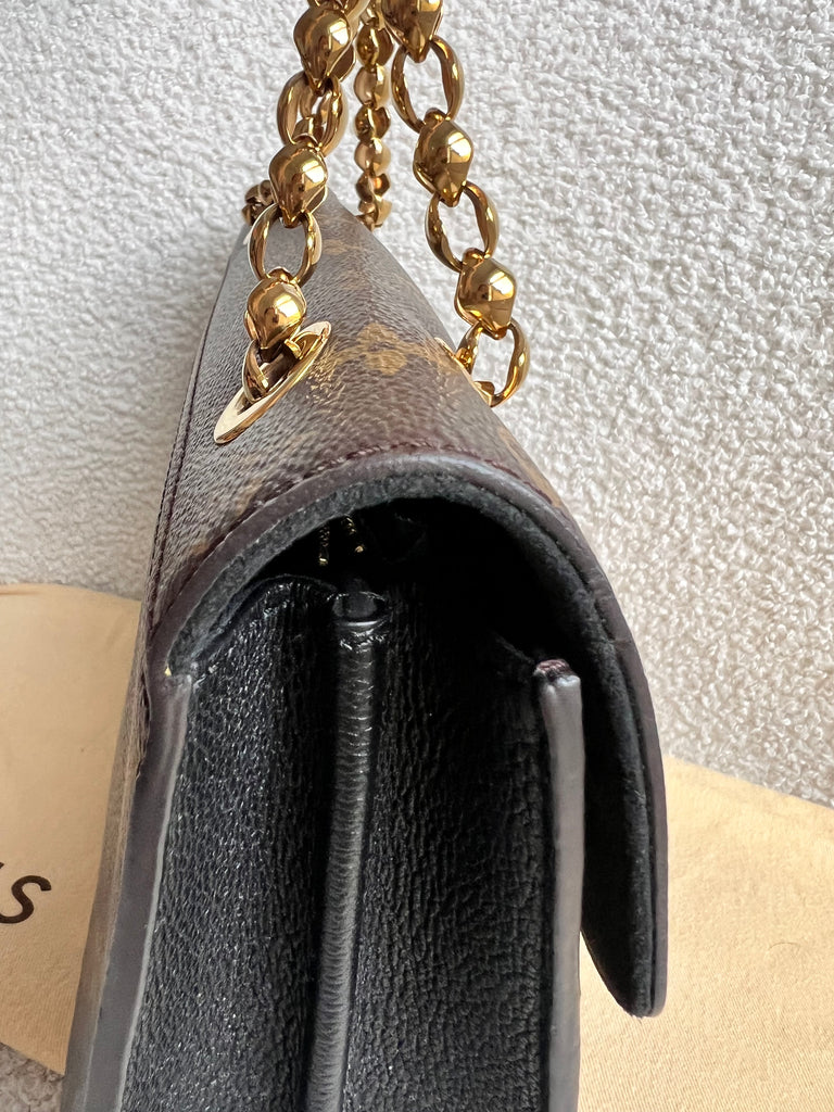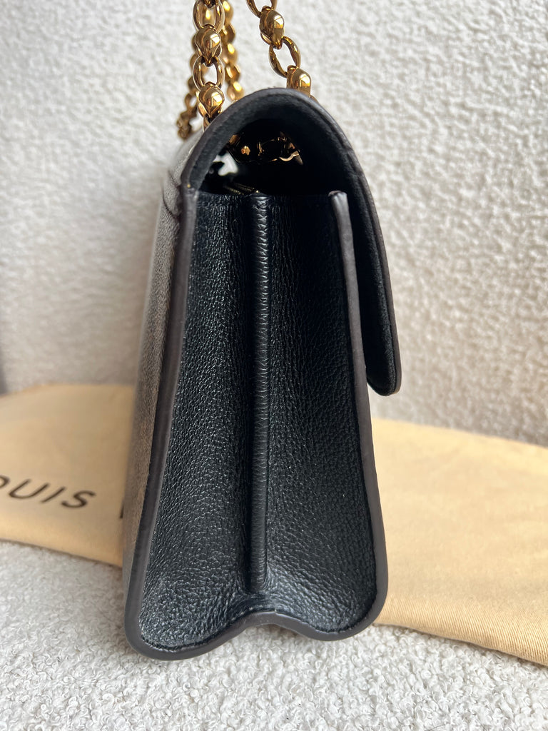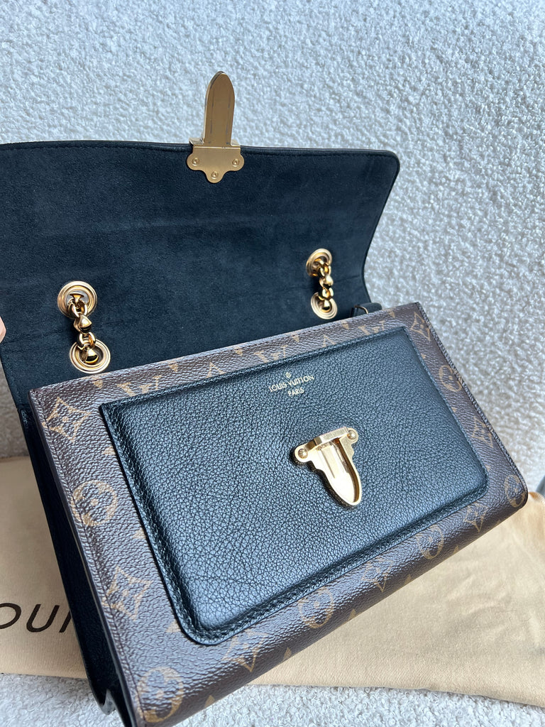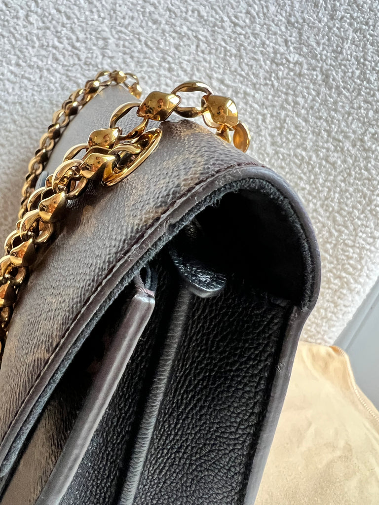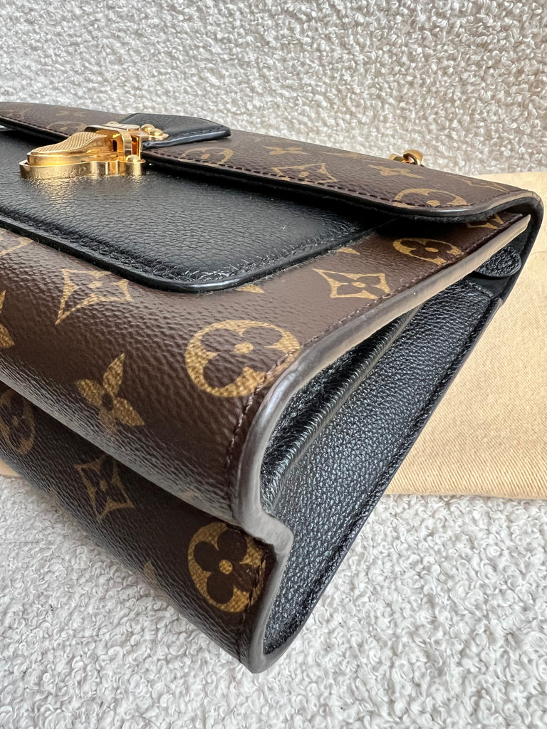Louis Vuitton Victoire in Monogram and Black. The Victoire chain bag pairs Monogram canvas with smooth black calfskin leather for a sophisticated day-to-evening accessory. The golden clasp is modelled on the lock of classic Louis Vuitton luggage, while the sliding chain strap echoes the Malletage print that lined those historic trunks. Large enough to fit a long wallet and all of the essentials, this style can be worn cross-body with the strap lengthened or over shoulder with the strap doubled. This sought after item is no longer available at LV and it’s last known RRP was £2000 in 2021.
