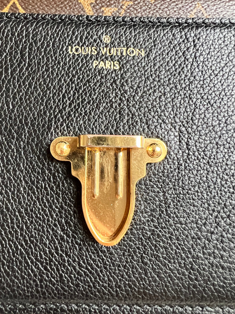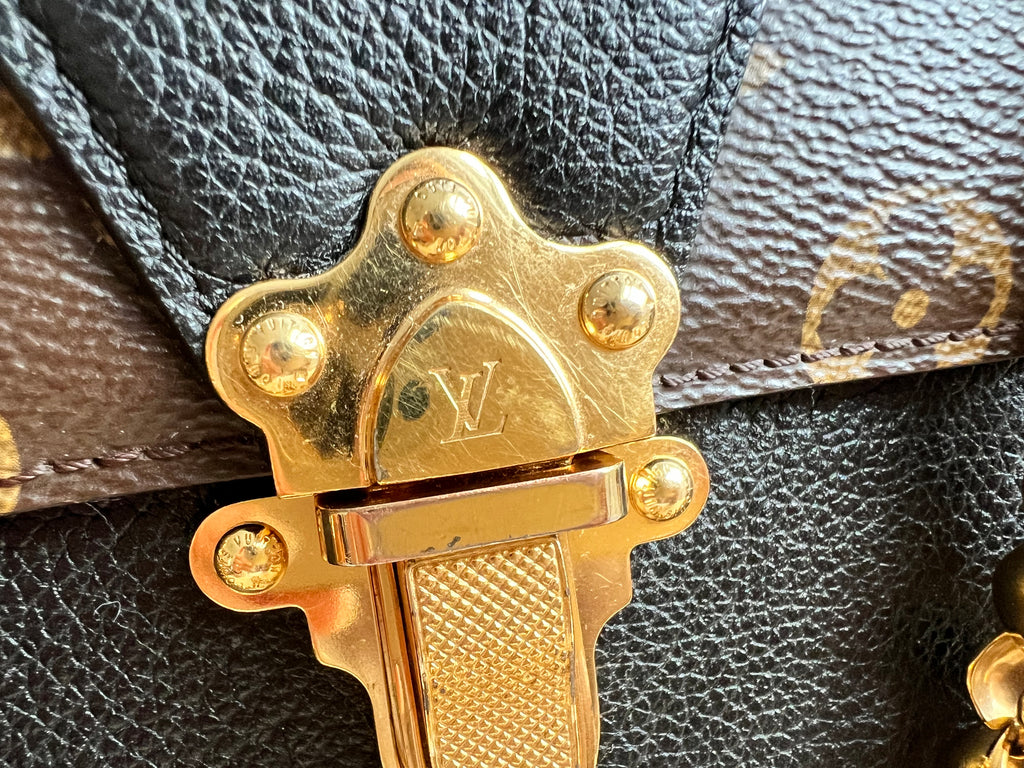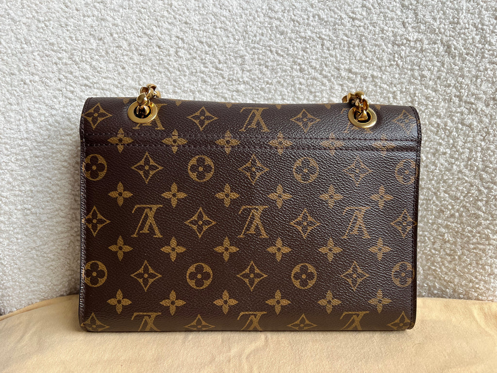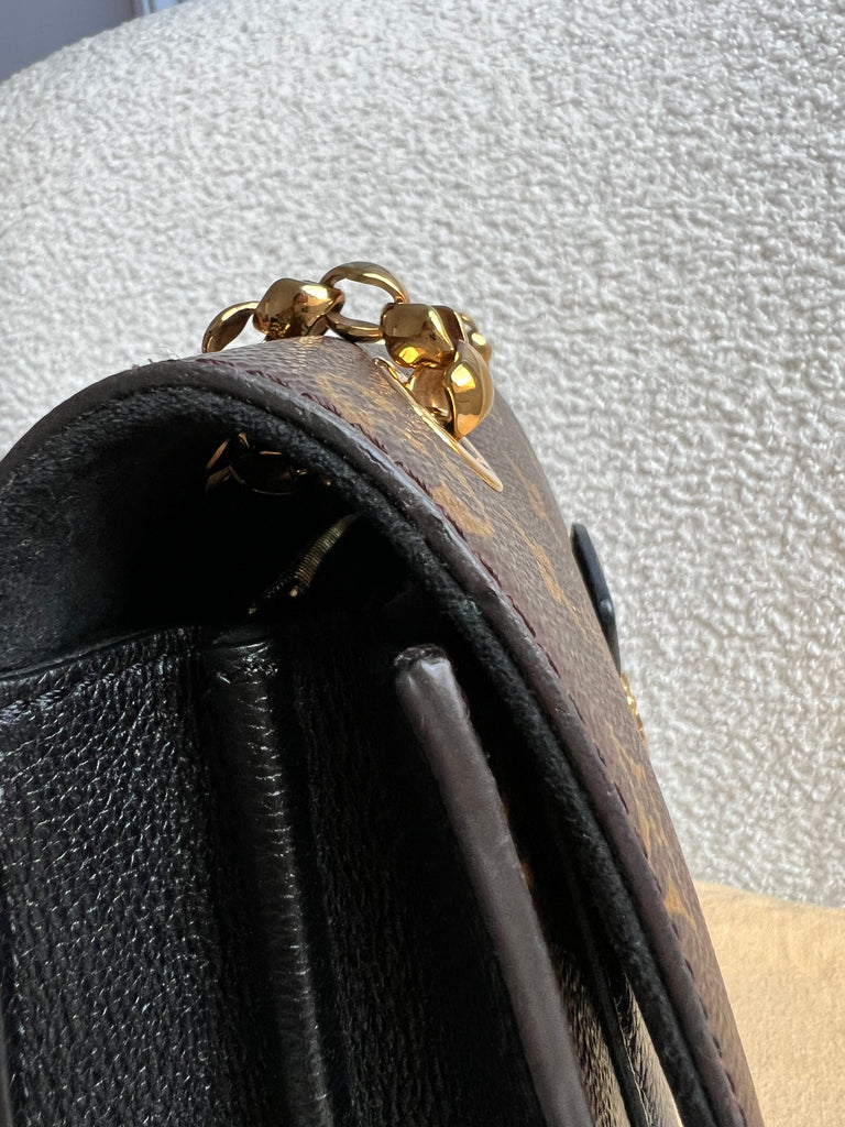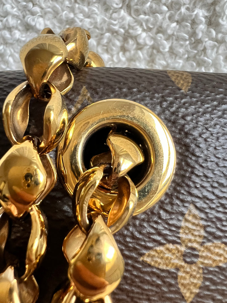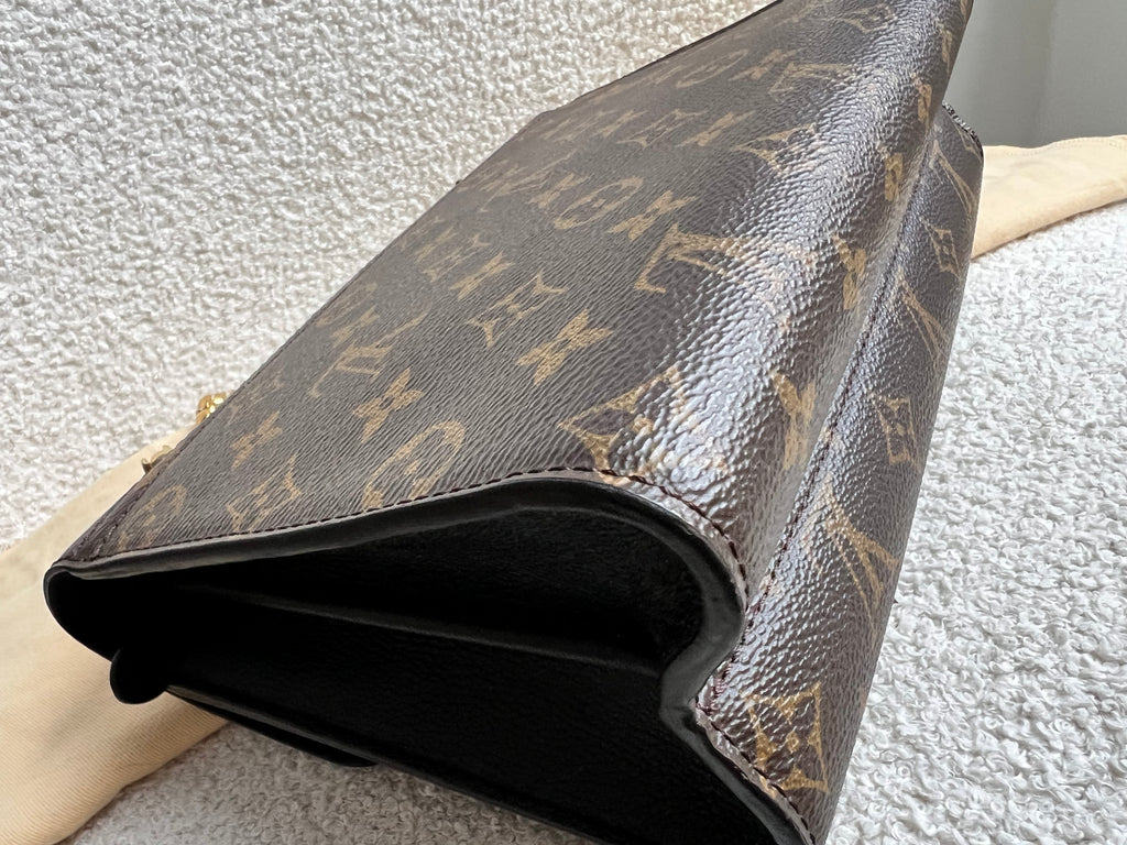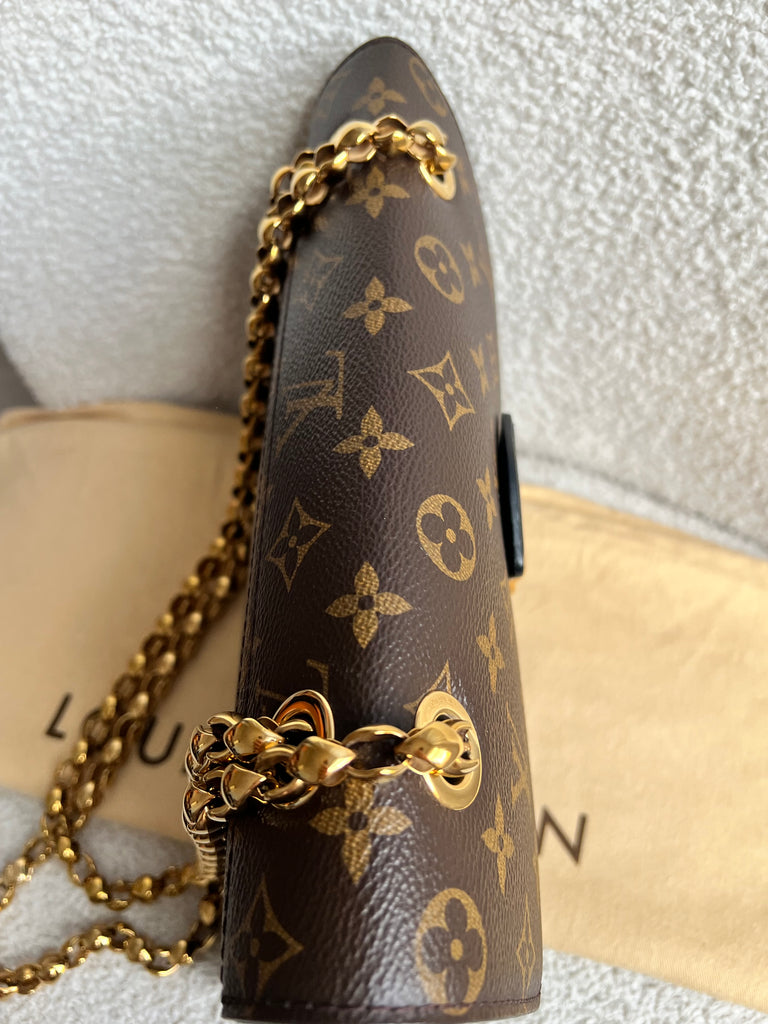Louis Vuitton Victoire in Monogram and Black. The Victoire chain bag pairs Monogram canvas with smooth black calfskin leather for a sophisticated day-to-evening accessory. The golden clasp is modelled on the lock of classic Louis Vuitton luggage, while the sliding chain strap echoes the Malletage print that lined those historic trunks. Large enough to fit a long wallet and all of the essentials, this style can be worn cross-body with the strap lengthened or over shoulder with the strap doubled. This sought after item is no longer available at LV and it’s last known RRP was £2000 in 2021.