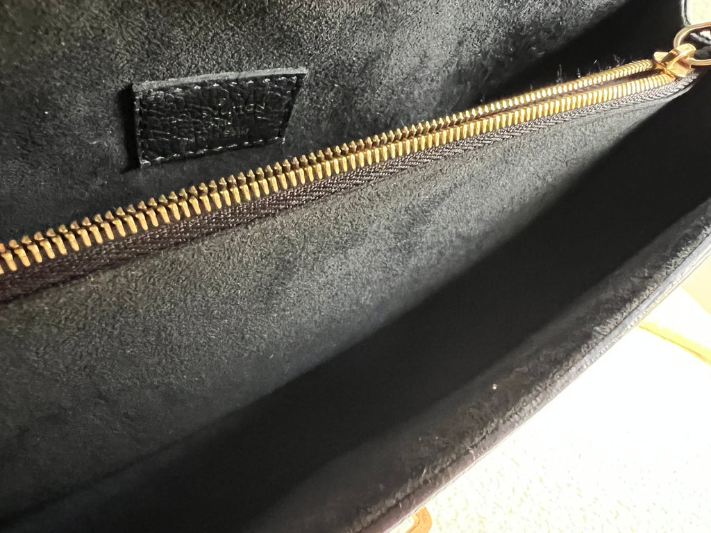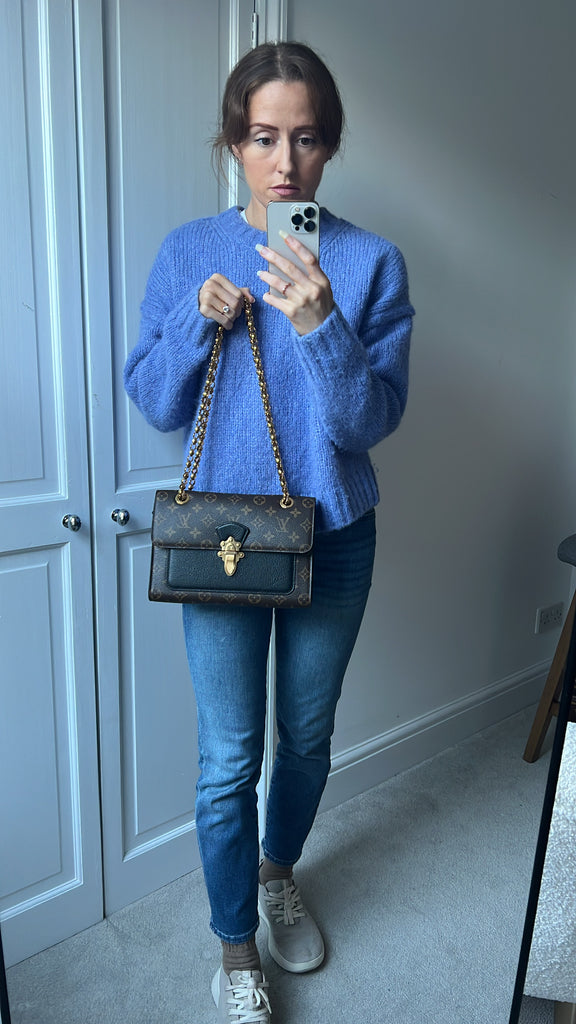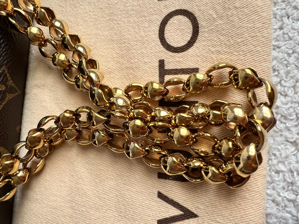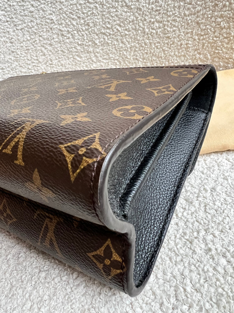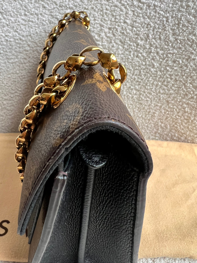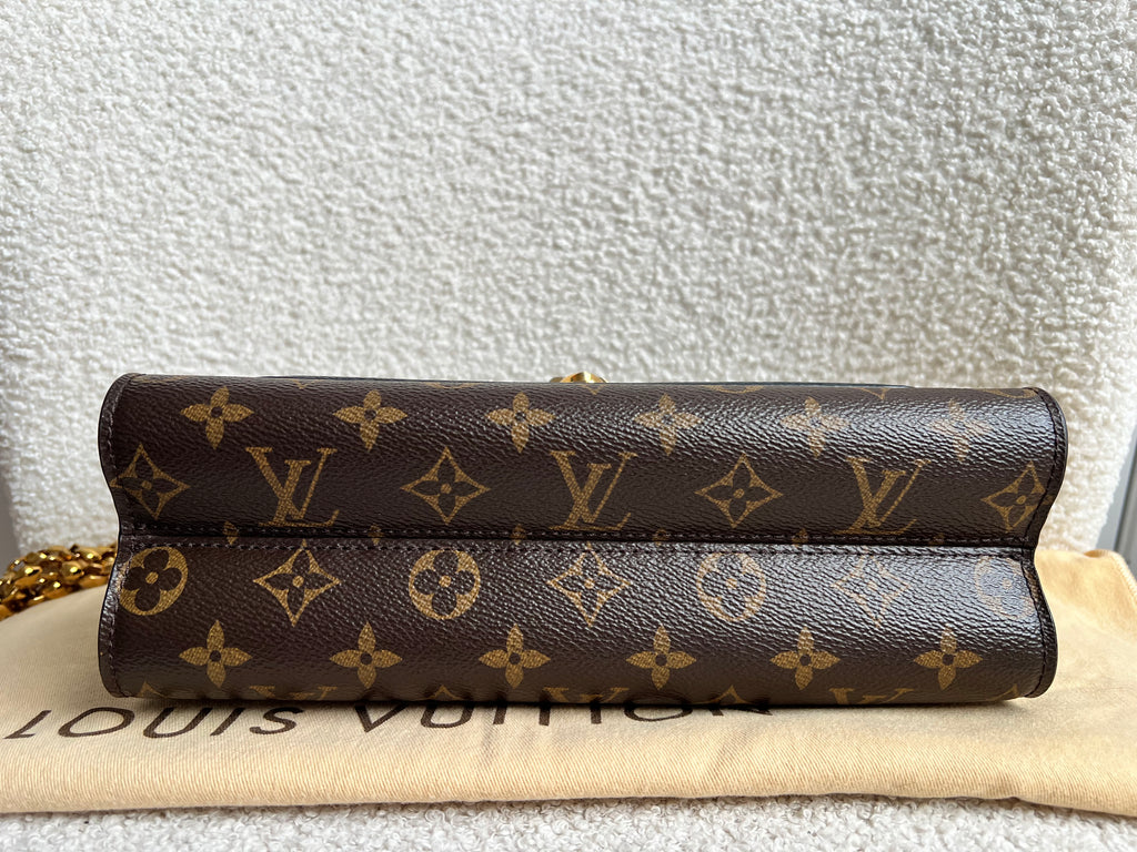 Louis Vuitton Victoire in Monogram and Black. The Victoire chain bag pairs Monogram canvas with smooth black calfskin leather for a sophisticated day-to-evening accessory. The golden clasp is modelled on the lock of classic Louis Vuitton luggage, while the sliding chain strap echoes the Malletage print that lined those historic trunks. Large enough to fit a long wallet and all of the essentials, this style can be worn cross-body with the strap lengthened or over shoulder with the strap doubled. This sought after item is no longer available at LV and it’s last known RRP was £2000 in 2021.