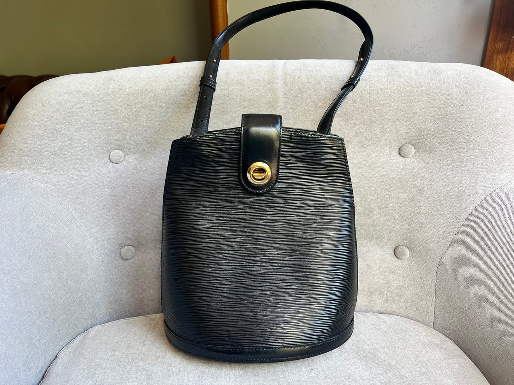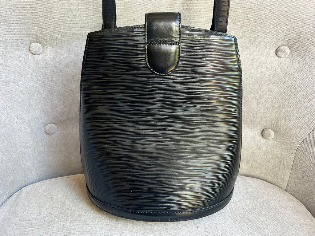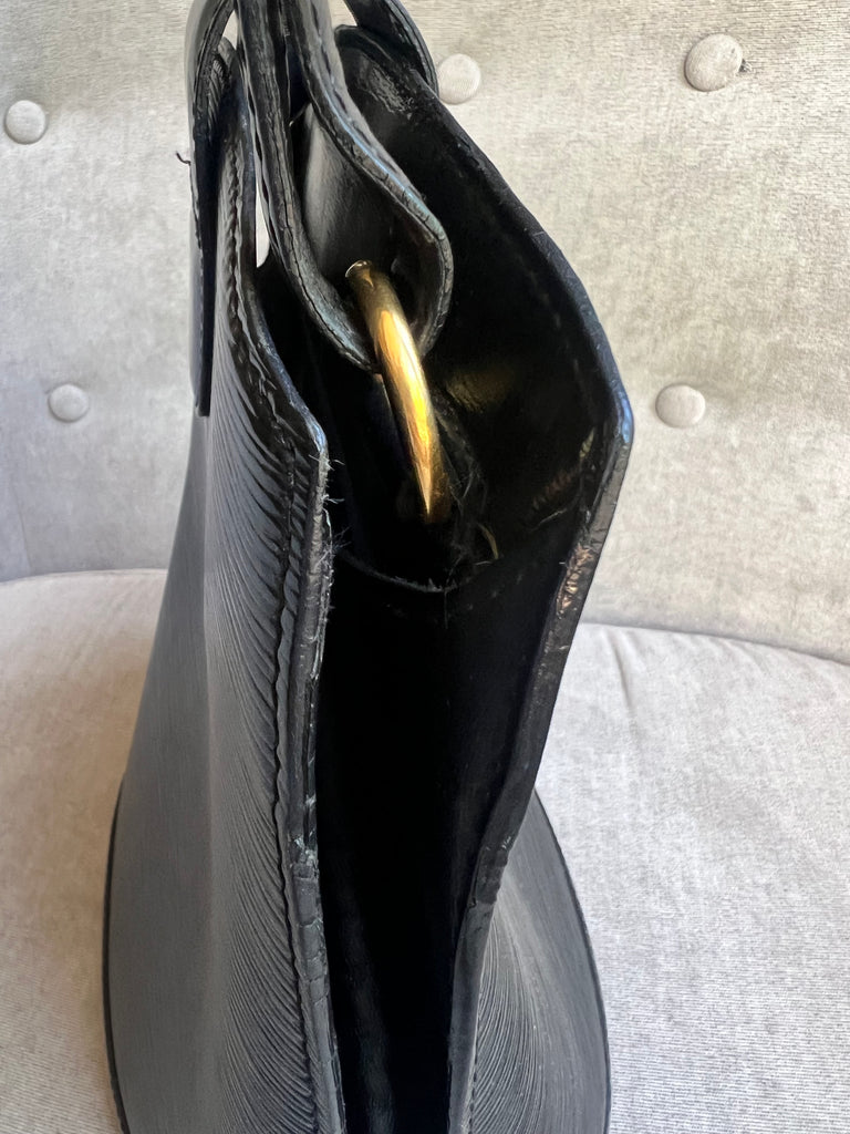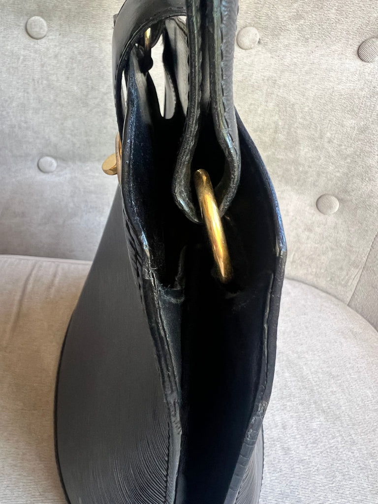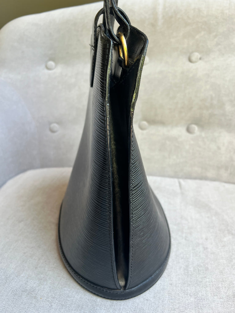 Louis Vuitton Cluny Bag in Black Epi leather with gold hardware. This vintage style is from 1993. This iconic design is notable for its bucket shape, which gives it a subtle vintage look. Closure by turnlock, it features a leather strap and can be worn over the shoulder.