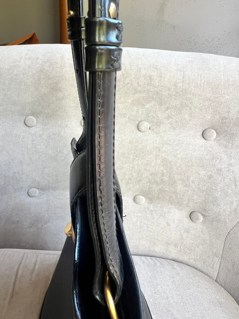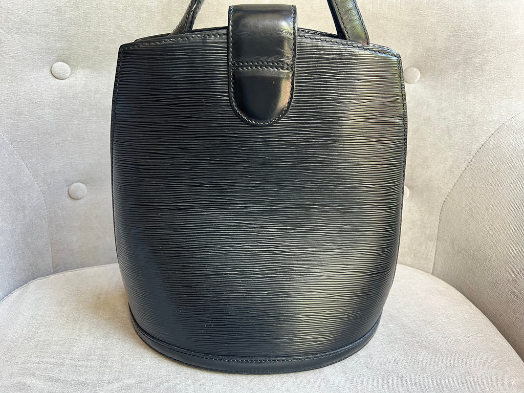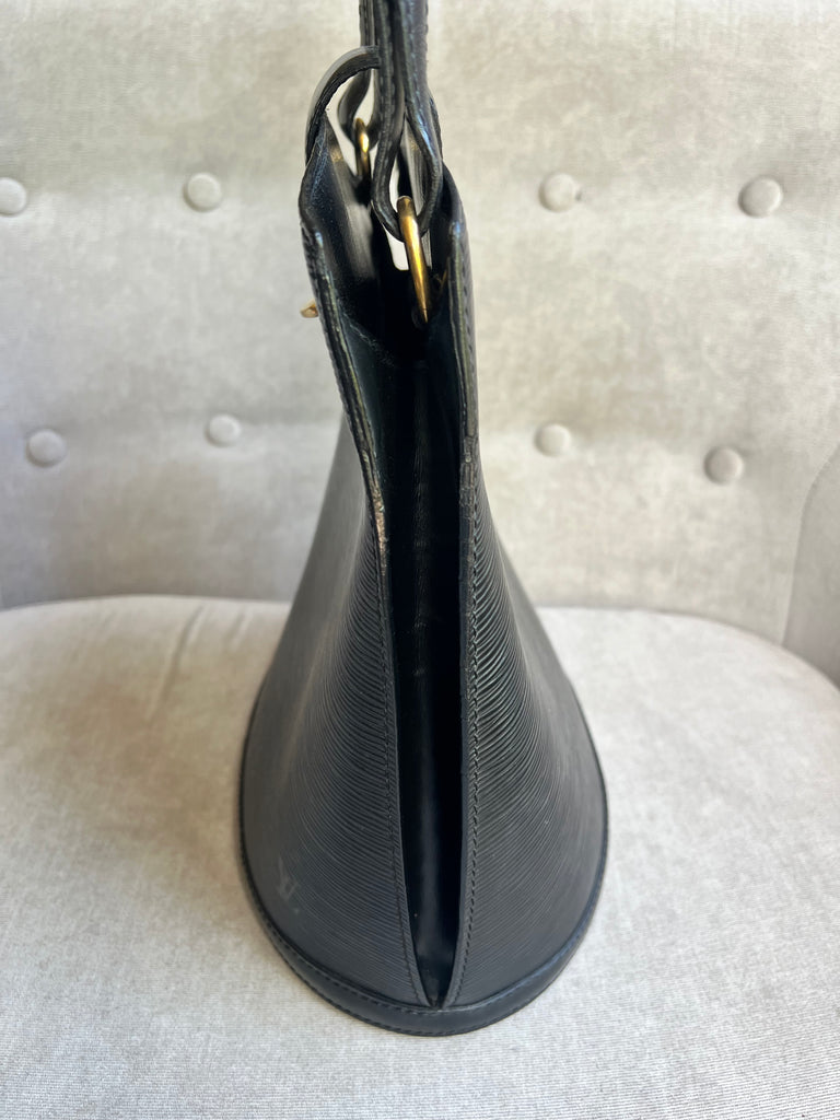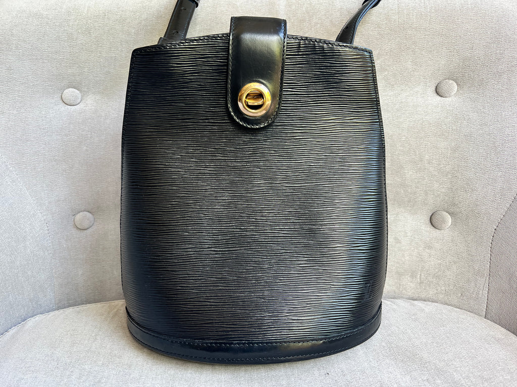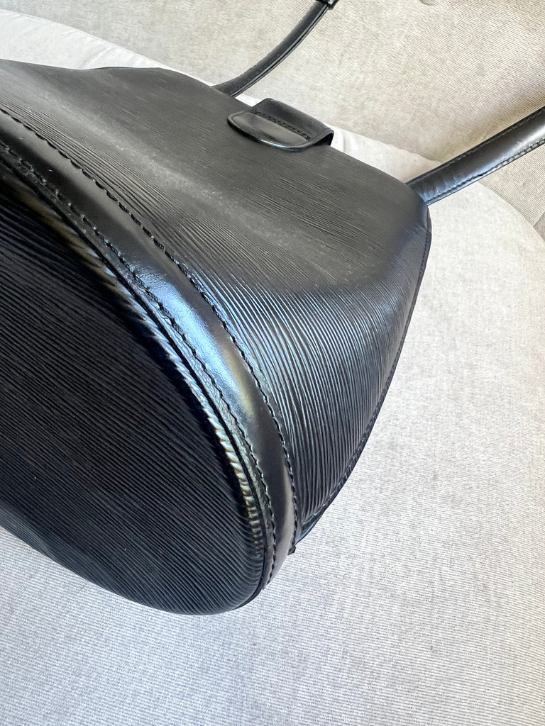 Louis Vuitton Cluny Bag in Black Epi leather with gold hardware. This vintage style is from 1993. This iconic design is notable for its bucket shape, which gives it a subtle vintage look. Closure by turnlock, it features a leather strap and can be worn over the shoulder.