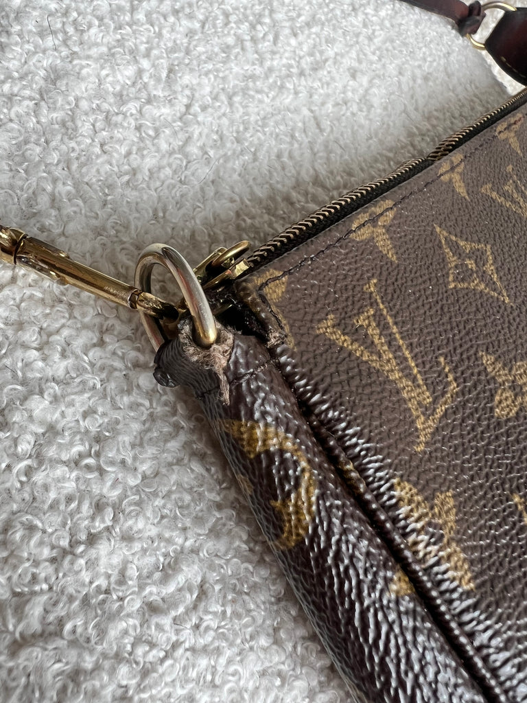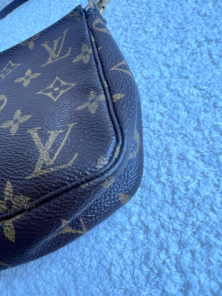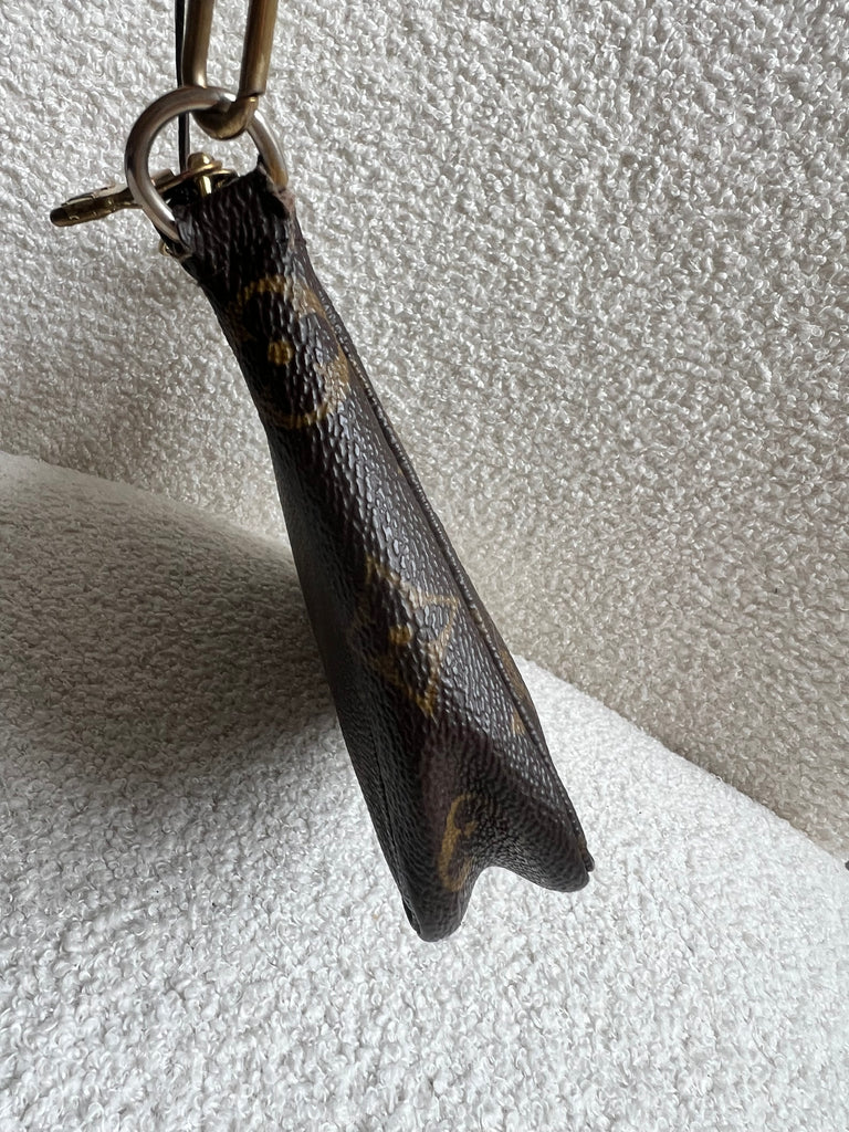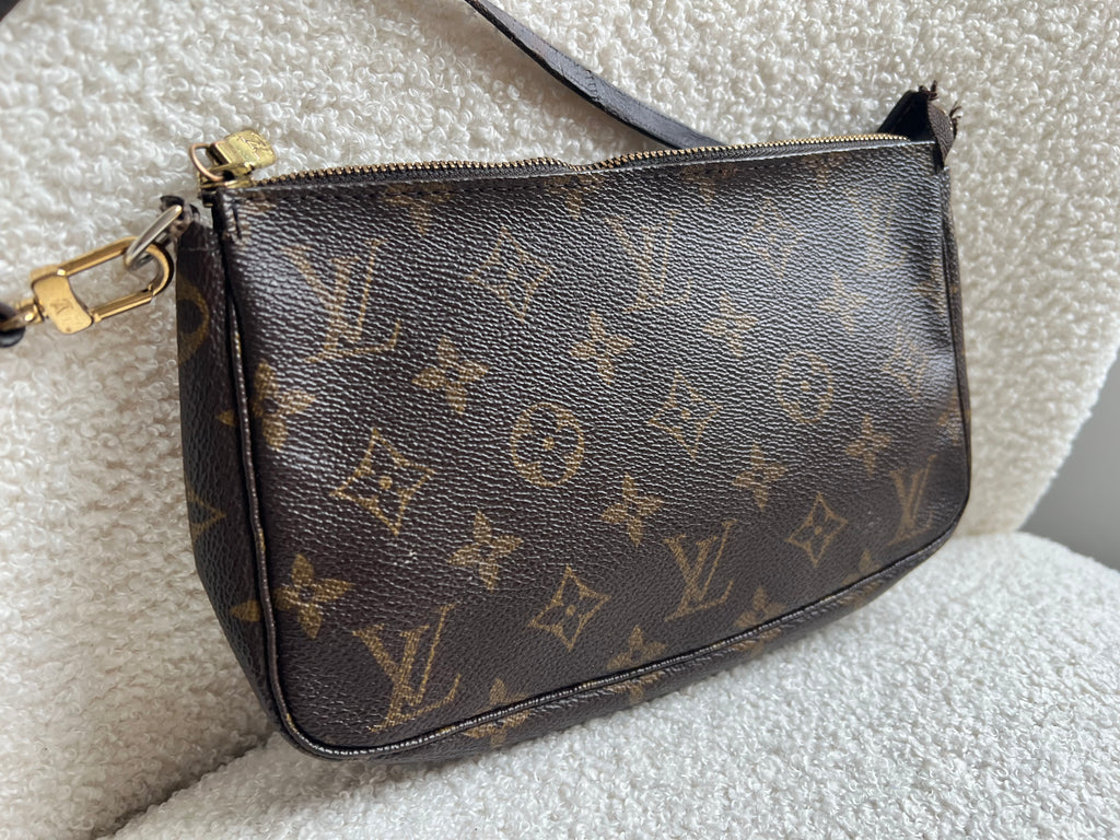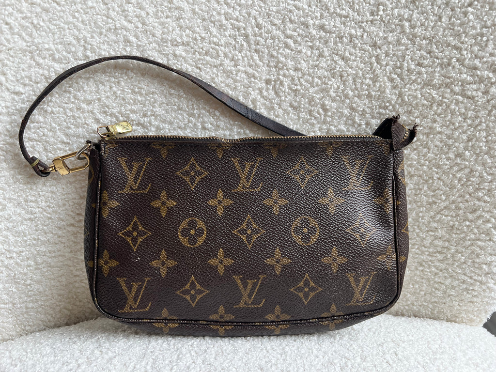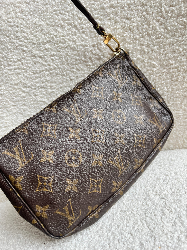 Louis Vuitton Pochette Accessoires in Monogram canvas with gold hardware. This iconic PA is highly sought after and usually sold out at LV. Carries all the daily essentials - can be carried over shoulder or by hand.