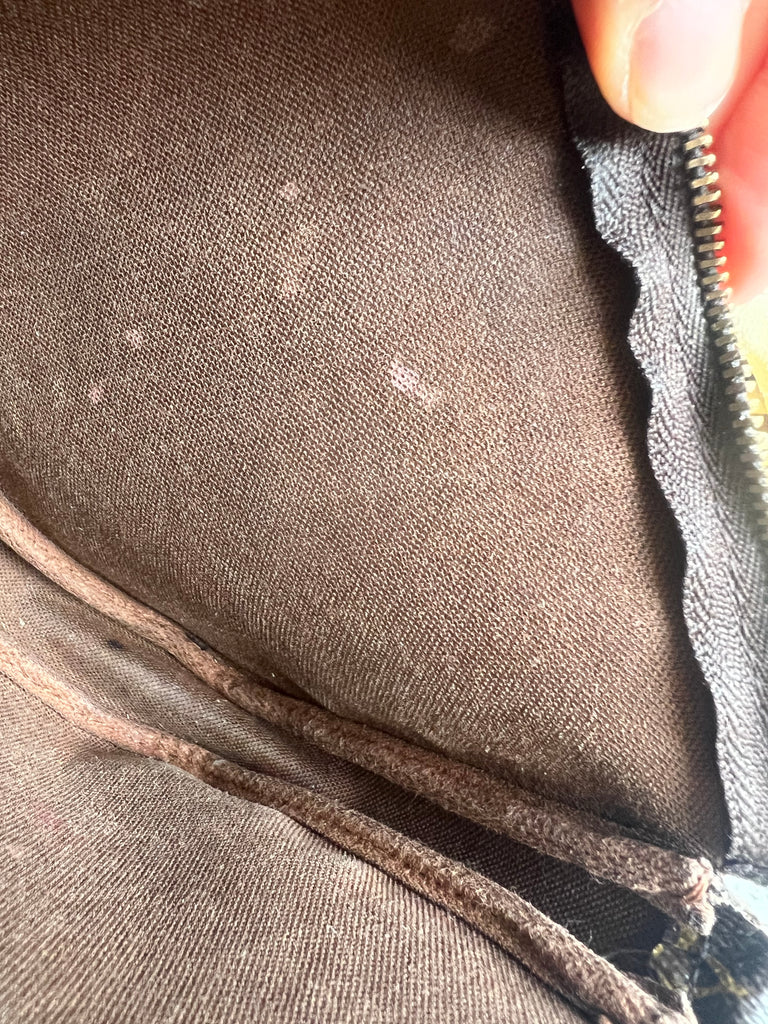 Exterior: Overall good condition. Small marks to canvas. Dark patina to leather trim and well used strap. Some wear to d ring attachments.