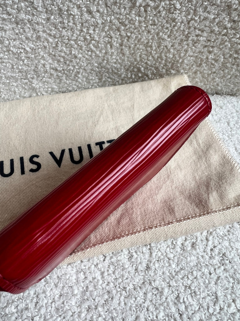 Louis Vuitton Zippy Coin Purse in Red Epi with silver hardware. The Zippy Coin Purse in iconic epi leather is famous for its compact design, which allows it to fit into a pocket or small bag, while still offering all essential functionalities. The LV-engraved zip provides both security and a wide opening for easy access to coins, cards and folded notes.
